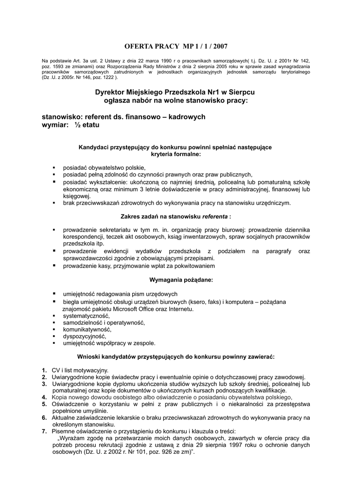 OFERTA PRACY MP 1 / 1 / 2007 Na podstawie Art. 3a ust. 2 Ustawy z dnia 22 marca 1990 r o pracownikach samorządowych( t.j. Dz. U. z 2001r Nr 142, poz. 1593 ze zmianami) oraz Rozporządzenia Rady Ministrów z dnia 2 sierpnia 2005 roku w sprawie zasad wynagradzania pracowników samorządowych zatrudnionych w jednostkach organizacyjnych jednostek samorządu terytorialnego (Dz .U. z 2005r. Nr 146, poz. 1222 ). Dyrektor Miejskiego Przedszkola Nr1 w Sierpcu ogłasza nabór na wolne stanowisko pracy: stanowisko: referent ds. finansowo – kadrowych wymiar: ½ etatu Kandydaci przystępujący do konkursu powinni spełniać następujące kryteria formalne: posiadać obywatelstwo polskie, posiadać pełną zdolność do czynności prawnych oraz praw publicznych, posiadać wykształcenie: ukończoną co najmniej średnią, policealną lub pomaturalną szkołę ekonomiczną oraz minimum 3 letnie doświadczenie w pracy administracyjnej, finansowej lub księgowej. brak przeciwwskazań zdrowotnych do wykonywania pracy na stanowisku urzędniczym. Zakres zadań na stanowisku referenta : prowadzenie sekretariatu w tym m. in. organizację pracy biurowej: prowadzenie dziennika korespondencji, teczek akt osobowych, ksiąg inwentarzowych, spraw socjalnych pracowników przedszkola itp. prowadzenie ewidencji wydatków przedszkola z podziałem na paragrafy oraz sprawozdawczości zgodnie z obowiązującymi przepisami. prowadzenie kasy, przyjmowanie wpłat za pokwitowaniem Wymagania pożądane: umiejętność redagowania pism urzędowych biegła umiejętność obsługi urządzeń biurowych (ksero, faks) i komputera – pożądana znajomość pakietu Microsoft Office oraz Internetu. systematyczność, samodzielność i operatywność, komunikatywność, dyspozycyjność, umiejętność współpracy w zespole. Wnioski kandydatów przystępujących do konkursu powinny zawierać: 1. CV i list motywacyjny. 2. Uwiarygodnione kopie świadectw pracy i ewentualnie opinie o dotychczasowej pracy zawodowej. 3. Uwiarygodnione kopie dyplomu ukończenia studiów wyższych lub szkoły średniej, policealnej lub pomaturalnej oraz kopie dokumentów o ukończonych kursach podnoszących kwalifikacje. 4. Kopia nowego dowodu osobistego albo oświadczenie o posiadaniu obywatelstwa polskiego, 5. Oświadczenie o korzystaniu w pełni z praw publicznych i o niekaralności za przestępstwa popełnione umyślnie. 6. Aktualne zaświadczenie lekarskie o braku przeciwwskazań zdrowotnych do wykonywania pracy na określonym stanowisku. 7. Pisemne oświadczenie o przystąpieniu do konkursu i klauzula o treści: „Wyrażam zgodę na przetwarzanie moich danych osobowych, zawartych w ofercie pracy dla potrzeb procesu rekrutacji zgodnie z ustawą z dnia 29 sierpnia 1997 roku o ochronie danych osobowych (Dz. U. z 2002 r. Nr 101, poz. 926 ze zm)”. Termin i miejsce składania wymaganych dokumentów: 1. Oferty wraz z wymaganymi załącznikami należy składać w terminie do dnia 30.11.2007r. w sekretariacie Miejskiego Przedszkola Nr1 w Sierpcu, ul. Kwiatowa 4 w godz. od 9.00 do 15.00. 2. Dokumenty należy składać w zamkniętej kopercie opatrzonej napisem: „Nabór kandydatów na stanowisko urzędnicze – referent ”, adres i telefon składającego ofertę. Inne informacje: Postępowanie konkursowe będzie II etapowe, obejmujące: I etap - Kwalifikacja formalna Złożone oferty będą badane pod względem kompletności i spełnienia wymagań niezbędnych dla kandydata na wskazane stanowisko urzędnicze. II etap – Kwalifikacja merytoryczna obejmująca następujące procedury: a) rozmowa kwalifikacyjna b) wykonanie samodzielnych zadań na komputerze. Postanowienia końcowe 1. Po upływie terminu składania dokumentów, osoby spełniające wymogi formalne zostaną poinformowane indywidualnie o terminie II etapu konkursu. 2. Informacja o wyniku naboru podana będzie do publicznej wiadomości na stronie internetowej Urzędu Miasta oraz na tablicy ogłoszeń w Miejskim Przedszkolu Nr1 w Sierpcu w terminie 14 dni od dnia zakończenia procedury naboru. 3. Zatrudnienie osoby wyłonionej z naboru nastąpi od dnia 1 stycznia 2008r. Dyrektor Miejskiego Przedszkola Nr1 w Sierpcu Alicja Ewa Pawlak Sierpc, dn. 15.11.2007r.