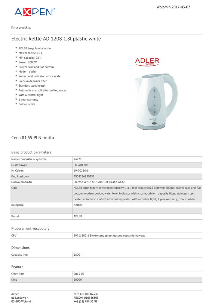 Wołomin 2017-03-07 Karta produktu: Electric kettle AD 1208 1.8l plastic white ADLER large family kettle Max capacity: 1.8 l Min capacity: 0.5 l Power: 2000W Swivel base and flat bottom Modern design Water level indicator with a scale Calcium deposits filter Stainless steel heater Automatic shut-off after boiling water With a control light 1 year warranty Colour: white Cena 81,59 PLN brutto Basic product parameters Numer produktu w systemie 24222 Nr dostawcy FO-AD1208 Nr Celcen 19-00216-6 Kod kreskowy 5908256830332 Nazwa produktu Electric kettle AD 1208 1.8l plastic white Opis ADLER large family kettle; max capacity: 1.8 l; min capacity: 0.5 l; power: 2000W; swivel base and flat bottom; modern design; water level indicator with a scale; calcium deposits filter; stainless steel heater; automatic shut-off after boiling water; with a control light; 1 year warranty; colour: white Kategoria Kettles Brand ADLER Procurement vocabulary CPV 39711300-2 Elektryczny sprzęt gospodarstwa domowego Dimensions Capacity (ml) 1800 Feature Offer from 2015-02 Kind 2000W Axpen ul. Laskowa 4 05-200 Wołomin NIP: 125-00-16-787 REGON: 010346305 +48 (22) 787 55 99 Wołomin 2017-03-07 Karta katalogowa produktu cd. Electric kettle AD 1208 1.8l plastic white Product Kettle Type Electric Material Plastic Certifications New product Standard Hit Standard Colour Colour White Pozostałe zdjęcia produktu Serdecznie zapraszamy do współpracy Axpen zespół. Axpen ul. Laskowa 4 05-200 Wołomin NIP: 125-00-16-787 REGON: 010346305 +48 (22) 787 55 99