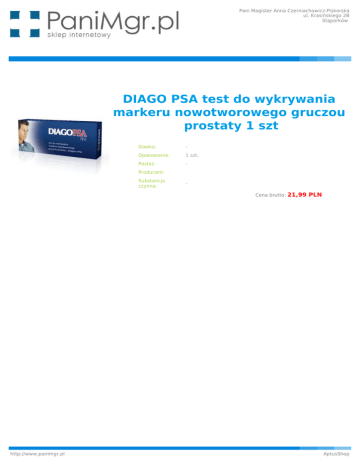 Pani Magister Anna Czerniachowicz-Piskorska ul. Krasińskiego 2B Stąporków DIAGO PSA test do wykrywania markeru nowotworowego gruczou prostaty 1 szt Dawka: - Opakowanie: 1 szt. Postać: - Producent: Substancja czynna: Cena brutto: http://www.panimgr.pl 21,99 PLN AptusShop