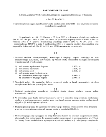 ZARZĄDZENIE NR 59/12 Rektora Akademii Wychowania Fizycznego im. Eugeniusza Piaseckiego w Poznaniu z dnia 30 lipca 2012r. w sprawie opłat za zajęcia dydaktyczne w roku akademickim 2012/2013 i inne czynności związane ze studiami w Akademii. Na podstawie art. 66 i 99 Ustawy z 27 lipca 2005 r. – Prawo o szkolnictwie wyższym (Dz. U. Nr 164, poz. 1365 z późn. zm.) oraz na podstawie rozporządzenia MNiSW z dnia 14 września 2011 r. w sprawie dokumentacji przebiegu studiów (Dz. U. Nr 201, poz. 1188) i rozporządzenia MNiSW z dnia 5 października 2011 r. w sprawie studiów doktoranckich oraz stypendiów doktoranckich (Dz. U. Nr 225, poz. 1351) zarządza się, co następuje: §1 1. Studenci studiów niestacjonarnych, pierwszego i drugiego stopnia studiujący od roku akademickiego 2012/2013, zobowiązani są wnosić opłaty semestralne za zajęcia dydaktyczne w następujących wysokościach: 1) 2) 3) 4) na kierunku wychowanie fizyczne na kierunku fizjoterapia na kierunku sport na kierunku turystyka i rekreacja: a) dla studiów pierwszego stopnia b) dla studiów drugiego stopnia 1.900,- zł 2.500,- zł 2.000,- zł 1.900,- zł 2.000,- zł 2. Wysokość opłat dla studentów, którzy rozpoczęli studia w latach poprzednich, określona zarządzeniami Rektora, pozostaje bez zmian. §2 1. Studenci powtarzający warunkowo przedmiot objęty planem studiów wnoszą opłatę w wysokości 500,00 zł. 2. W przypadku kiedy liczba zebranych punktów ECTS w semestrze nie pozwala na kontynuację studiów w kolejnym semestrze, student może powtórzyć semestr wnosząc opłaty według stawek ujętych w §1 niniejszego zarządzenia. 3. Studenci przystępujący do egzaminu dyplomowego po terminie wyznaczonym przez Dziekana z przyczyn przez nich zawinionych wnoszą opłatę w wysokości 800,00 zł. §3 1. Osoba ubiegająca się o przyjęcie na drugi kierunek studiów na studiach stacjonarnych (studia równoległe) jest zobowiązana do uiszczenia opłaty semestralnej (z uwzględnieniem art. 99 ust. 1a Ustawy Prawo o szkolnictwie wyższym) w wysokości podanej w § 1 niniejszego zarządzenia. 1 2. Studenci ubiegający się o przyjęcie na drugą specjalność danego kierunku studiów na studiach stacjonarnych i niestacjonarnych, zobowiązani są do uiszczenia opłaty w wysokości odpowiednio: 1) kierunek Turystyka i Rekreacja 2) kierunek Wychowanie Fizyczne I semestr 900,- zł 800,- zł Następne semestry 800,- zł 700,- zł §4 Studenci studiów stacjonarnych i niestacjonarnych Wydziałów: Wychowania Fizycznego, Sportu i Rehabilitacji, Turystyki i Rekreacji oraz Zamiejscowego Wydziału Kultury Fizycznej w Gorzowie Wlkp. mogą uzyskać specjalizacje instruktorskie w wybranych dyscyplinach sportu, w czasie kursów organizowanych przez Centrum Doskonalenia Kadr i Szkolenia. §5 Osoba ubiegająca się o wznowienie studiów (reaktywację w prawach studenta) w przypadku decyzji pozytywnej wnosi opłatę w wysokościach podanych w §1 niniejszego zarządzenia, poprzez indywidualny numer konta podany przez Uczelnię. W przypadku studentów studiów niestacjonarnych to opłata powyższa stanowi jednocześnie opłatę semestralną za zajęcia. §6 1. Studenci studiów niestacjonarnych mogą uiszczać opłatę semestralną w czterech równych ratach rozłożonych przez Uczelnię od całości kwoty za dany semestr, płatnych do 10-go dnia każdego miesiąca: 1) na Wydziałach Wychowania Fizycznego Sportu i Rehabilitacji oraz Turystyki i Rekreacji za semestr zimowy w miesiącach wrzesień, październik, listopad i grudzień danego roku akademickiego – za semestr letni w miesiącach luty, marzec, kwiecień i maj danego roku akademickiego; 2) na Wydziale Zamiejscowego Wydziału Kultury Fizycznej w Gorzowie Wlkp. za semestr zimowy w miesiącach październik, listopad, grudzień, styczeń danego roku akademickiego, za semestr letni w miesiącach marzec, kwiecień, maj i czerwiec danego roku akademickiego. 2. Wpłaty nieterminowe będą powodowały naliczanie odsetek ustawowych. 3. Pozostałe opłaty powinny być wniesione przed rozpoczęciem przewidzianych planem zajęć dydaktycznych. §7 1. W przypadkach określonych w § 1, 2, 3 i 5 wpłacone na rzecz Uczelni opłaty podlegają zwrotowi: 1) w wysokości 100 %, jeżeli osoba zainteresowana uiściła opłatę semestralną w terminie, a egzamin komisyjny został wyznaczony po terminie uiszczenia opłaty semestralnej; 2) w wysokości 90%, jeżeli osoba zainteresowana zgłosi w Dziekanacie pisemną rezygnację z podjęcia studiów lub złoży wniosek o urlop dziekański (następnie pozytywnie rozpatrzony) co najmniej 7 dni przed terminem rozpoczęcia przewidzianych planem zajęć dydaktycznych; 2 3) w wysokości 75%, jeżeli osoba zainteresowana zgłosi w Dziekanacie pisemną rezygnację z podjęcia studiów lub złoży wniosek o urlop dziekański (następnie pozytywnie rozpatrzony) w terminie: a) w przypadku studiów stacjonarnych do końca drugiego tygodnia przewidzianych planem zajęć dydaktycznych, b) w przypadku studiów niestacjonarnych na kierunku turystyka i rekreacja do dnia rozpoczęcia II zjazdu w semestrze, c) w przypadku studiów niestacjonarnych na kierunku wychowanie fizyczne, fizjoterapia oraz sport do połowy sesji zjazdowej lub do dnia rozpoczęcia II zjazdu w semestrze; 4) w wysokości 50 %, jeżeli student złoży wniosek o urlop dziekański (następnie pozytywnie załatwiony) do połowy semestru. 2. W przypadku niedotrzymania przez osobę zainteresowaną w pkt. 1 powyżej, wpłacone kwoty nie podlegają zwrotowi. terminów określonych §8 Zwrot opłat określony w wysokościach ustalonych w § 7 następuje w wartości nominalnej na koszt osoby zainteresowanej. §9 1. Cudzoziemcy podejmujący studia w języku polskim na warunkach odpłatności dewizowej zobowiązani są wnosić opłaty roczne w wysokości: 1) 2) 3) 4) kierunek Wychowanie Fizyczne kierunek Sport kierunek Fizjoterapia kierunek Turystyka i Rekreacja 2910,- euro 2910,- euro 3393,- euro 345