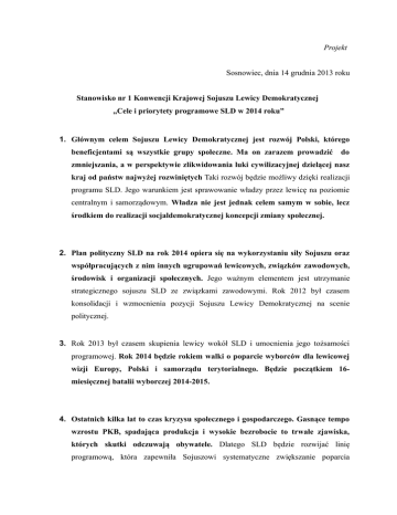 Projekt Sosnowiec, dnia 14 grudnia 2013 roku Stanowisko nr 1 Konwencji Krajowej Sojuszu Lewicy Demokratycznej „Cele i priorytety programowe SLD w 2014 roku” 1. Głównym celem Sojuszu Lewicy Demokratycznej jest rozwój Polski, którego beneficjentami są wszystkie grupy społeczne. Ma on zarazem prowadzić do zmniejszania, a w perspektywie zlikwidowania luki cywilizacyjnej dzielącej nasz kraj od państw najwyżej rozwiniętych Taki rozwój będzie możliwy dzięki realizacji programu SLD. Jego warunkiem jest sprawowanie władzy przez lewicę na poziomie centralnym i samorządowym. Władza nie jest jednak celem samym w sobie, lecz środkiem do realizacji socjaldemokratycznej koncepcji zmiany społecznej. 2. Plan polityczny SLD na rok 2014 opiera się na wykorzystaniu siły Sojuszu oraz współpracujących z nim innych ugrupowań lewicowych, związków zawodowych, środowisk i organizacji społecznych. Jego ważnym elementem jest utrzymanie strategicznego sojuszu SLD ze związkami zawodowymi. Rok 2012 był czasem konsolidacji i wzmocnienia pozycji Sojuszu Lewicy Demokratycznej na scenie politycznej. 3. Rok 2013 był czasem skupienia lewicy wokół SLD i umocnienia jego tożsamości programowej. Rok 2014 będzie rokiem walki o poparcie wyborców dla lewicowej wizji Europy, Polski i samorządu terytorialnego. Będzie początkiem 16miesięcznej batalii wyborczej 2014-2015. 4. Ostatnich kilka lat to czas kryzysu społecznego i gospodarczego. Gasnące tempo wzrostu PKB, spadająca produkcja i wysokie bezrobocie to trwałe zjawiska, których skutki odczuwają obywatele. Dlatego SLD będzie rozwijać linię programową, która zapewniła Sojuszowi systematyczne zwiększanie poparcia społecznego. Będziemy skupiać się na prezentowaniu naszych systemowych rozwiązań problemów gospodarczych i społecznych. propozycji Gospodarka konkurencyjna, zakładająca aktywny udział państwa w tworzeniu nowych miejsc pracy, przy zrównoważonym budżecie, jest naszym priorytetem strategicznym. Chcemy Polskę unowocześnić, co wymaga systematycznego zwiększania nakładów z budżetu państwa na naukę i nowe technologie. Dwukrotnie przejmowaliśmy rządzenie państwem w kryzysie. Udowodniliśmy, że można szybko i skutecznie osiągać wzrost gospodarczy, wzrost płac i stabilizację budżetu. 5. Za swoje priorytety programowe w 2014 roku SLD uznaje niezmiennie: PRACĘ, ZDROWIE i EDUKACJĘ. Jednocześnie strategicznym wyzwaniem dla lewicy w Polsce pozostaje wyrównywanie szans młodego pokolenia oraz likwidacja olbrzymich nierówności społecznych. SLD będzie prezentował socjaldemokratyczne rozwiązania wychodzące naprzeciw tym problemom w kampanii wyborczej do Parlamentu Europejskiego oraz w kampanii samorządowej. 6. Obowiązkiem SLD, jako członka Partii Europejskich Socjalistów (PES), jest działanie na rzecz powiększenia reprezentacji Grupy Postępowego Sojuszu Socjalistów i Demokratów w przyszłym Parlamencie Europejskim. Wyklucza to tworzenie wspólnych list wyborczych z podmiotami, które otwarcie deklarują chęć przynależności do konkurencyjnych frakcji w PE, popierają innego kandydata na przewodniczącego Komisji Europejskiej niż kandydat PES, lub pozostają niedookreślone politycznie. 7. Rok 2014 będzie rokiem ważnych rocznic historycznych. Będziemy świętować 10. rocznicę akcesji Polski do Unii Europejskiej. SLD nie będzie biernie przyglądać się zawłaszczaniu tego historycznego sukcesu przez rządzącą prawicę. Wejście Polski do Unii Europejskiej było sukcesem wszystkich Polaków. Nie pozwolimy jednak, aby zapomniano, kto Polskę do Unii wprowadzał, kto negocjował warunki naszego członkostwa w UE. Dlatego SLD zorganizuje ogólnopolskie obchody Roku Unii Europejskiej. Jednym z jego celów będzie promocja dalszego pogłębiania integracji europejskiej, zgodnego z socjaldemokratycznymi wartościami. W naszych działaniach uwzględnimy również 15-lecie członkostwa Polski w NATO. 8. Rok 2014 to także rok ćwierćwiecza polskiej transformacji ustrojowej. SLD przeciwstawi się wszelkim głosom negującym zasadność narodowego porozumienia przy Okrągłym Stole. Z drugiej strony, SLD podejmie polemikę ze współczesną propagandą sukcesu, przedstawiającą ostanie 25 lat jako okres ogólnonarodowej pomyślności. SLD dokona bilansu transformacji społeczno- ekonomicznej, doceniając polityczne i gospodarcze sukcesy, nie pozwolimy jednak na przemilczenie jej dramatycznych kosztów społecznych. 9. W 2014 roku będziemy obchodzić również 15-lecie istnienia Sojuszu Lewicy Demokratycznej jako jednolitej partii politycznej. Będzie to okazja do krytycznej oceny historii naszej partii, służąca wyciągnięciu konstruktywnych wniosków na przyszłość. Jednocześnie należy podkreślić, że czas przepraszania za grzechy przeszłości już minął. Ponieśliśmy konsekwencje naszych przeszłych błędów. Teraz zwracamy się w stronę przyszłości i wyzwań, które przynosi szybko zmieniająca się rzeczywistość. 10. Cztery kampanie wyborcze w latach 2014-2015 to największe wyzwanie organizacyjne i polityczne w 15-letniej historii Sojuszu. Naszym zadaniem jest przygotowanie spójnego programu politycznego na cztery elekcje. Głównym celem wewnętrznym SLD jest osiągnięcie efektu organizacyjnej i programowej synergii pomiędzy wszystkimi czterema kampaniami wyborczymi. Projekt Sosnowiec, dnia 14 grudnia 2013 roku Stanowisko nr 2 Konwencji Krajowej Sojuszu Lewicy Demokratycznej w sprawie programu gospodarczego dla Polski W Polsce nastąpiło wyraźne spowolnienie gospodarki. Negatywne zjawiska społeczne i gospodarcze występują mimo, że od momentu wstąpienia do Unii Europejskiej Polska otrzymała kwotę 250 mld zł. Wysoki wskaźnik bezrobocia występuje pomimo faktu, że korzystając z otwartych granic prawie 2 mln Polaków pracuje w państwach Unii Europejskiej. Mimo masowej emigracji poziom bezrobocia sięgnął 13 proc. Zadłużenie finansów 