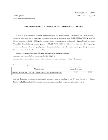 DZPZ/ 333/ 285/2014 Olsztyn, 11-12-2014 r. Sanofi Aventis sp. z o.o.