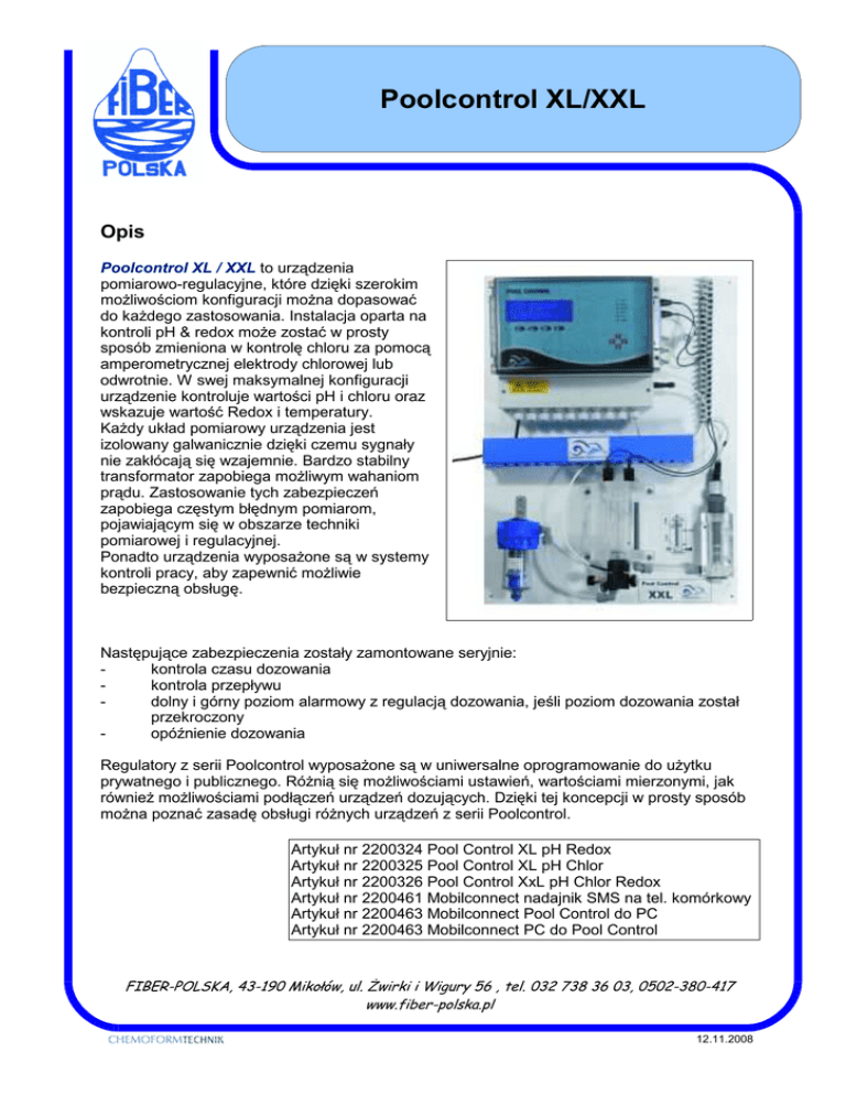 Poolcontrol XL/XXL Opis Poolcontrol XL / XXL to urządzenia pomiarowo-regulacyjne, które dzięki szerokim moŜliwościom konfiguracji moŜna dopasować do kaŜdego zastosowania. Instalacja oparta na kontroli pH & redox moŜe zostać w prosty sposób zmieniona w kontrolę chloru za pomocą amperometrycznej elektrody chlorowej lub odwrotnie. W swej maksymalnej konfiguracji urządzenie kontroluje wartości pH i chloru oraz wskazuje wartość Redox i temperatury. KaŜdy układ pomiarowy urządzenia jest izolowany galwanicznie dzięki czemu sygnały nie zakłócają się wzajemnie. Bardzo stabilny transformator zapobiega moŜliwym wahaniom prądu. Zastosowanie tych zabezpieczeń zapobiega częstym błędnym pomiarom, pojawiającym się w obszarze techniki pomiarowej i regulacyjnej. Ponadto urządzenia wyposaŜone są w systemy kontroli pracy, aby zapewnić moŜliwie bezpieczną obsługę. Następujące zabezpieczenia zostały zamontowane seryjnie: kontrola czasu dozowania kontrola przepływu dolny i górny poziom alarmowy z regulacją dozowania, jeśli poziom dozowania został przekroczony opóźnienie dozowania Regulatory z serii Poolcontrol wyposaŜone są w uniwersalne oprogramowanie do uŜytku prywatnego i publicznego. RóŜnią się moŜliwościami ustawień, wartościami mierzonymi, jak równieŜ moŜliwościami podłączeń urządzeń dozujących. Dzięki tej koncepcji w prosty sposób moŜna poznać zasadę obsługi róŜnych urządzeń z serii Poolcontrol. Artykuł nr 2200324 Pool Control XL pH Redox Artykuł nr 2200325 Pool Control XL pH Chlor Artykuł nr 2200326 Pool Control XxL pH Chlor Redox Artykuł nr 2200461 Mobilconnect nadajnik SMS na tel. komórkowy Artykuł nr 2200463 Mobilconnect Pool Control do PC Artykuł nr 2200463 Mobilconnect PC do Pool Control FIBER-POLSKA, 43-190 Mikołów, ul. świrki i Wigury 56 , tel. 032 738 36 03, 0502-380-417 www.fiber-polska.pl 12.11.2008 Tekstowy wyświetlacz LCD ułatwia odczytywanie danych, które wyświetlane są stale, w celu zapewnienia lepszej kontroli mierzonych wartości. Dodatkowo urządzenie wyposaŜone jest w świecące diody sygnalizacyjne na płycie frontowej, dzięki czemu informacje o zakłóceniach pracy widoczne są w najciemniejszym miejscu. Urządzenia Poolcontrol przeznaczone do zastosowania na obiektach publicznych (XL / XXL) wyposaŜone są dodatkowo w przyciski na płycie frontowej, za pomocą których moŜliwy jest dostęp do niektórych funkcji bez konieczności wchodzenia w menu urządzenia. W ten sposób moŜna np. wyświetlić protokoły zdarzeń, historię alarmów oraz aktualnie ustawione parametry. Właściwości Obudowa o klasie bezpieczeństwa IP 64 Wyświetlacz czasu i godziny Wyświetlacz temperatury i wartości redox Dopasowuje się do róŜnych parametrów pomiarowych chloru organicznego i nieorganicznego Wł./wył. dozowania, dozowanie proporcjonalne i PID Wyłączalne parametry bezpieczeństwa Tekstowy wyświetlacz menu i parametrów Stan dozowania sygnalizowany diodami Wybór języka 2 poziomy obsługi Monitoring przepływu w komorze pomiarowej Podłączenie na pompę koagulacyjną Napięcie sieci od 100 do 240 volt Galwaniczna izolacja dla kaŜdej wartości pomiarowej Przekaźnik wyjściowy 1 A Dopasowanie wydajności dozowania przez pompy do parametrów basenu Wejście wolne od potencjału Bezpośrednie wywołanie parametrów roboczych klawiaturą Bezpośrednie podłączenie do drukarki lub komputera PC (opcja dodatkowa) Zalety - Poolcontrol modułowo dopasowuje się do Państwa Ŝyczeń MoŜe sterować pompą Floc Prosta regulacja poprzez łatwe w obsłudze menu Stabilne parametry pomiarowe nawet przy wahaniach pH i przepływu MoŜliwe ustalenie związanego chloru Wysyłanie informacji na telefon komórkowy (opcja dodatkowa) Informacje wyświetlane w formie czytelnego tekstu Wszystkie urządzenia z serii Poolcontrol obsługiwane są w ten sam sposób Sygnalizacja pomocnicza przez diody świetlne FIBER-POLSKA, 43-190 Mikołów, ul. świrki i Wigury 56 , tel. 032 738 36 03, 0502-380-417 www.fiber-polska.pl 12.11.2008
