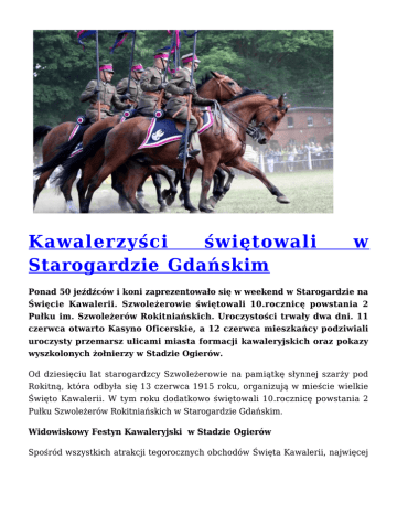 Kawalerzyści świętowali Starogardzie Gdańskim w Ponad 50 jeźdźców i koni zaprezentowało się w weekend w Starogardzie na Święcie Kawalerii. Szwoleżerowie świętowali 10.rocznicę powstania 2 Pułku im. Szwoleżerów Rokitniańskich. Uroczystości trwały dwa dni. 11 czerwca otwarto Kasyno Oficerskie, a 12 czerwca mieszkańcy podziwiali uroczysty przemarsz ulicami miasta formacji kawaleryjskich oraz pokazy wyszkolonych żołnierzy w Stadzie Ogierów. Od dziesięciu lat starogardzcy Szwoleżerowie na pamiątkę słynnej szarży pod Rokitną, która odbyła się 13 czerwca 1915 roku, organizują w mieście wielkie Święto Kawalerii. W tym roku dodatkowo świętowali 10.rocznicę powstania 2 Pułku Szwoleżerów Rokitniańskich w Starogardzie Gdańskim. Widowiskowy Festyn Kawaleryjski w Stadzie Ogierów Spośród wszystkich atrakcji tegorocznych obchodów Święta Kawalerii, najwięcej emocji przyniosło starogardzianom widowisko, przygotowane przez organizatorów w Stadzie Ogierów. Mieszkańcy obok akrobatycznych popisów konnych kaskaderów i musztry paradnej zobaczyli inscenizację historyczną pt. „Mjr Hubal – ostatni żołnierz września.” Major Henryk Dobrzański należał do tej grupy kawalerzystów polskich, którzy byli podziwiani przez całą Europę podczas konkursów hippicznych w latach 1924-1926. Był świetnym jeźdźcem, wielkim znawcą koni i najwierniejszym z wiernych synów Ojczyzny. Historię jego zaciekłej walki przeciw niemieckiemu okupantowi na przełomie 1939/40 roku zaprezentowały grupy rekonstrukcyjne, a pasjonujący komentarz dodał Jerzy Hanisz. Tumany kurzu wydobywające się spod kopyt galopujących koni i monocyklów, świst szabli, hurkot karabinów i grzmot dział na długo pozostaną w pamięci widzów. Skupieni wokół dużego placu manewrowego z zapartym tchem oglądali i słuchali opowieści plenerowej o historii działań wojennych majora Dorzańskiego i jego kawalerzystów, którzy nie zdjęli mundurów i pozostając w Polsce, walczyli o jej wolność. Nie kryli swojego zachwytu, nagradzając uczestników pokazu gromkimi brawami. Msza polowa i uroczysta parada na Rynku Kilka godzin wcześniej ulicami miasta przemaszerowali żołnierze Kompanii Honorowej IX Brygady Kawalerii pod dowództwem por. Kamila Ksok, szwadron 2 Pułku Szwoleżerów Rokitniańskich pod dowództwem rtm. Krzysztofa Landowskiego, sekcja kolarska z Ozorkowa oraz sekcja jeździecka Joker. Setki mieszkańców Starogardu podziwiało grację i wdzięk defiladujących żołnierzy, którym do marszu przygrywała orkiestra Wojsk Lądowych z Elbląga. Uroczystą paradę poprzedziła msza polowa na Rynku. Koncelebrował ją proboszcz parafii św. Katarzyny w Kolonówce ks. dr Przemysław Piwowarczyk. Oprócz Kawalerzystów uczestniczyli w niej zastępca szefa Urzędu do spraw Kombatantów i Osób Represjonowanych Jan Józef Kasprzyk, poseł na sejm RP Jan Kilian, władze samorządowe miasta, poczty sztandarowe, Bractwo Kurkowe i harcerze. Podczas gdy niedziela upłynęła pod hasłem pokazów szwoleżerskich umiejętności jeździeckich i władania białą bronią oraz znakomicie przygotowanych i opracowanych inscenizacji historycznych z udziałem ciężkiego sprzętu bojowego, sobotnie popołudnie wypełniły bardziej oficjalne uroczystości. Muzeum 2 Pułku im. Szwoleżerów Rokitniańskich powróciło do dawnej siedziby Kasyna Oficerskiego 11 czerwca obchody Święta Pułku zainaugurowała uroczysta akademia w kinie „Sokół” . Medale i krzyże otrzymało wielu zasłużonych kawalerzystów i przyjaciół Pułku. Wśród odznaczonych znaleźli się m.in. prezydent miasta Janusz Stankowiak i jego zastępca Przemysław Biesek –Talewski. Zaraz po części oficjalnej zaproszeni goście przemaszerowali do Kasyna Oficerskiego, które wróciło do swojej dawnej siedziby przy ul. Sobieskiego 14. Kawalerzyści z dumą prezentowali nowe Muzeum 2 Pułku im. Szwoleżerów Rokitniańskich, do którego powróciła dusza i klimat czasów świetności II Rzeczypospolitej, kiedy budynek tętnił życiem towarzyskim i kulturalnym miasta garnizonowego Starogard Gdański. – Odtworzyliśmy sale prezydencką, generalska i kancelarię – powiedział podczas otwarcia muzeum dowódca Pułku Krzysztof Landowski. Zgromadziliśmy tu bezcenne pamiątki po 2 Pułku Ułanów Legionów Polskich i 2 Pułku Szwoleżerów Rokitniańskich, a na ścianach w sali prezydenckiej jak niegdyś zawisły obrazy wybitnych dowódców Pułku. Jestem przekonany, że od dzisiaj budynek będzie służył społeczeństwu jak dawniej. A dzieci i młodzież w salach tradycji znajdą kawałek pięknej, ciekawej i wzruszającej historii starogardzkich szwoleżerów. Na zakończenie podziękował wszystkim, którzy pomogli im w odbudowie Kasyna.
