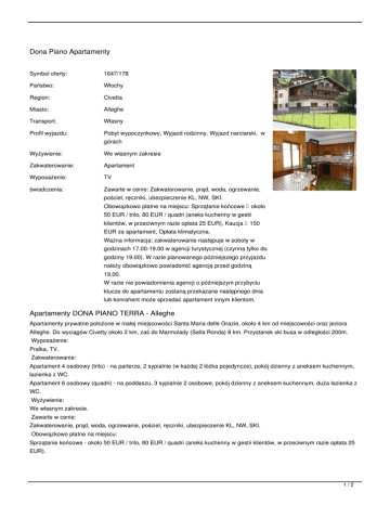 Dona Piano Apartamenty Symbol oferty: 1647/178 Państwo: Włochy Region: Civetta Miasto: Alleghe Transport: Własny Profil wyjazdu: Pobyt wypoczynkowy, Wyjazd rodzinny, Wyjazd narciarski, w Wyżywienie: We własnym zakresie Zakwaterowanie: Apartament Wyposażenie: TV świadczenia: Zawarte w cenie: Zakwaterowanie, prąd, woda, ogrzewanie, górach pościel, ręczniki, ubezpieczenie KL, NW, SKI. Obowiązkowo płatne na miejscu: Sprzątanie końcowe około 50 EUR / trilo, 80 EUR / quadri (aneks kuchenny w gestii klientów, w przeciwnym razie opłata 25 EUR), Kaucja 150 EUR za apartament, Opłata klimatyczna. Ważna informacja: zakwaterowanie następuje w soboty w godzinach 17.00-19.00 w agencji turystycznej (czynna tylko do godziny 19.00). W razie planowanego późniejszego przyjazdu należy obowiązkowo powiadomić agencję przed godziną 19.00. W razie nie powiadomienia agencji o późniejszym przybyciu klucze do apartamentu zostaną przekazane następnego dnia lub konrahent może sprzedać apartament innym klientom. Apartamenty DONA PIANO TERRA - Alleghe Apartamenty prywatne położone w małej miejscowości Santa Maria delle Grazie, około 4 km od miejscowości oraz jeziora Alleghe. Do wyciągów Civetty około 2 km, zaś do Marmolady (Sella Ronda) 8 km. Przystanek ski busa w odległości 200m. Wyposażenie: Pralka, TV. Zakwaterowanie: Apartament 4 osobowy (trilo) - na parterze, 2 sypialnie (w każdej 2 łóżka pojedyncze), pokój dzienny z aneksem kuchennym, łazienka z WC. Apartament 6 osobowy (quadri) - na poddaszu, 3 sypialnie 2 osobowe, pokój dzienny z aneksem kuchennym, duża łazienka z WC. Wyżywienie: We własnym zakresie. Zawarte w cenie: Zakwaterowanie, prąd, woda, ogrzewanie, pościel, ręczniki, ubezpieczenie KL, NW, SKI. Obowiązkowo płatne na miejscu: Sprzątanie końcowe - około 50 EUR / trilo, 80 EUR / quadri (aneks kuchenny w gestii klientów, w przeciwnym razie opłata 25 EUR). 1/2 Kaucja - 150 EUR za apartament Opłata klimatyczna Ważna informacja: zakwaterowanie następuje w soboty w godzinach 17.00-19.00 w agencji turystycznej (czynna tylko do godziny 19.00). W razie planowanego późniejszego przyjazdu należy obowiązkowo powiadomić agencję przed godziną 19.00. W razie nie powiadomienia agencji o późniejszym przybyciu klucze do apartamentu zostaną przekazane następnego dnia lub konrahent może sprzedać apartament innym klientom. Wykwaterowanie w obiekcie do godziny 9.00. TERMINY: od: 2017-03-11 do: 2017-03-18 (8 dni), miejsca: zamów cena od: 831 PLN = 201 EUR od: 2017-03-18 do: 2017-03-25 (8 dni), miejsca: zamów cena od: 721 PLN = 174 EUR od: 2017-03-25 do: 2017-04-01 (8 dni), miejsca: zamów cena od: 721 PLN = 174 EUR CENNIK: Długość pobytu: 8 dni 8 dni Grupa cenowa: D E 14 14 2.5 2.5 Ubezpieczenie (obligatoryjne) (*) Ubezpieczenie KL, NW, SKI (*) Turystyczny Fundusz Gwarancyjny Pobyt w obiekcie (do wyboru) Apart. 6 os. standardowo dla osób: 6 minimalnie: 1 919 (*) Trilo 4 os./Apart. 4 osobowy standardowo dla osób: 4 minimalnie: 1 746 Rodzaj osoby (do wyboru) (*) Uczestnik (-) 788 640 (-) Waluta: EUR Aktualne ceny z systemu S.A.R.T. (-) - cena usługi, podatku kalkulowana przy osobie lub gratis (*) - kwota wliczona w cenę standardową 2/2
