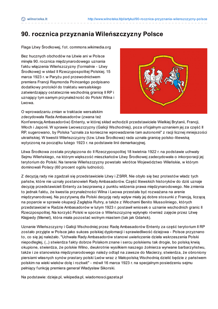 wilno t e ka.lt http://www.wilno teka.lt/pl/artykul/90-ro cznica-przyznania-wilenszczyzny-po lsce 90. rocznica przyznania Wileńszczyzny Polsce Flaga Litwy Środkowej, f ot. commons.wikimedia.org Bez hucznych obchodów na Litwie ani w Polsce minęła 90. rocznica międzynarodowego uznania f aktu włączenia Wileńszczyzny (f ormalnie - Litwy Środkowej) w skład II Rzeczypospolitej Polskiej. 15 marca 1923 r. w Paryżu pod przewodnictwem premiera Francji Raymonda Poincarégo podpisano dodatkowy protokół do traktatu wersalskiego zatwierdzający ostatecznie wschodnią granicę II RP i uznający tym samym przynależność do Polski Wilna i Lwowa. O wprowadzaniu zmian w traktacie wersalskim zdecydowała Rada Ambasadorów (zwana też Konf erencją Ambasadorów) Ententy, w której skład wchodzili przedstawiciele Wielkiej Brytanii, Francji, Włoch i Japonii. W sprawie Lwowszczyzny (Galicji Wschodniej), poza of icjalnym uznaniem jej za część II RP, sugerowano, by Polska "uznała za konieczne wprowadzenie tam autonomii" z racji licznej mniejszości ukraińskiej. W kwestii Wileńszczyzny (tzw. Litwa Środkowa) rada uznała granicę polsko-litewską wytyczoną na początku lutego 1923 r. na podstawie linii demarkacyjnej. Litwa Środkowa została przyłączona do II Rzeczypospolitej 18 kwietnia 1922 r. na podstawie uchwały Sejmu Wileńskiego, na którym większość mieszkańców Litwy Środkowej zadecydowała o inkorporacji jej terytorium do Polski. Na terenie Wileńszczyzny powstało wkrótce Województwo Wileńskie, w którym dominowali Polacy (60 procent ogółu ludności). Z decyzją rady nie zgadzali się przedstawiciele Litwy i Z SRR. Nie obyło się bez protestów władz tych państw, które nie uznały postanowień Rady Ambasadorów. Część litewskich historyków do dziś uznaje decyzję przedstawicieli Ententy za bezprawną z punktu widzenia prawa międzynarodowego. Nie zmienia to jednak f aktu, że kwestia przynależności Wilna i Lwowa przestała być rozważana na arenie międzynarodowej. Na pozytywną dla Polski decyzję rady wpływ miały jej dobre stosunki z Francją, liczącą na poparcie w sprawie okupacji Z agłębia Ruhry, a także z Włochami Benito Mussoliniego, których przedstawiciel w Radzie Ambasadorów w lutym 1923 r. postawił wniosek o uznanie wschodnich granic II Rzeczpospolitej. Na korzyść Polski w sporze o Wileńszczyznę wpłynęło również zajęcie przez Litwę Kłajpedy (Memel), która miała pozostać wolnym miastem (tak jak Gdańsk). Uznanie Wileńszczyzny i Galicji Wschodniej przez Radę Ambasadorów Ententy za część terytorium II RP zostało przyjęte w Polsce jako sukces polskiej dyplomacji i sprawiedliwość dziejowa - Polsce przyznano to, co się jej należało. "Uchwała Rady Ambasadorów stanowi uwieńczenie dzieła wskrzeszenia Polski niepodległej, (...) stwierdza f akty dobrze Polakom znane i sercu polskiemu tak drogie, bo polską krwią okupione, stwierdza, że polskie Wilno, dwukrotnie wysiłkiem naszego żołnierza wyrwane barbarzyństwu, także i ze stanowiska międzynarodowego należy odtąd na zawsze do Macierzy, stwierdza, że obroniony piersiami własnych synów prastary polski Lwów wraz z Małopolską Wschodnią dzielić będzie z państwem polskim na wieki wieków dolę i rozkwit" - mówił 16 marca 1923 r. na specjalnym posiedzeniu sejmu pełniący f unkcję premiera generał Władysław Sikorski. Na podstawie: dzieje.pl, wikipedia.pl, wiadomosci.gazeta.pl