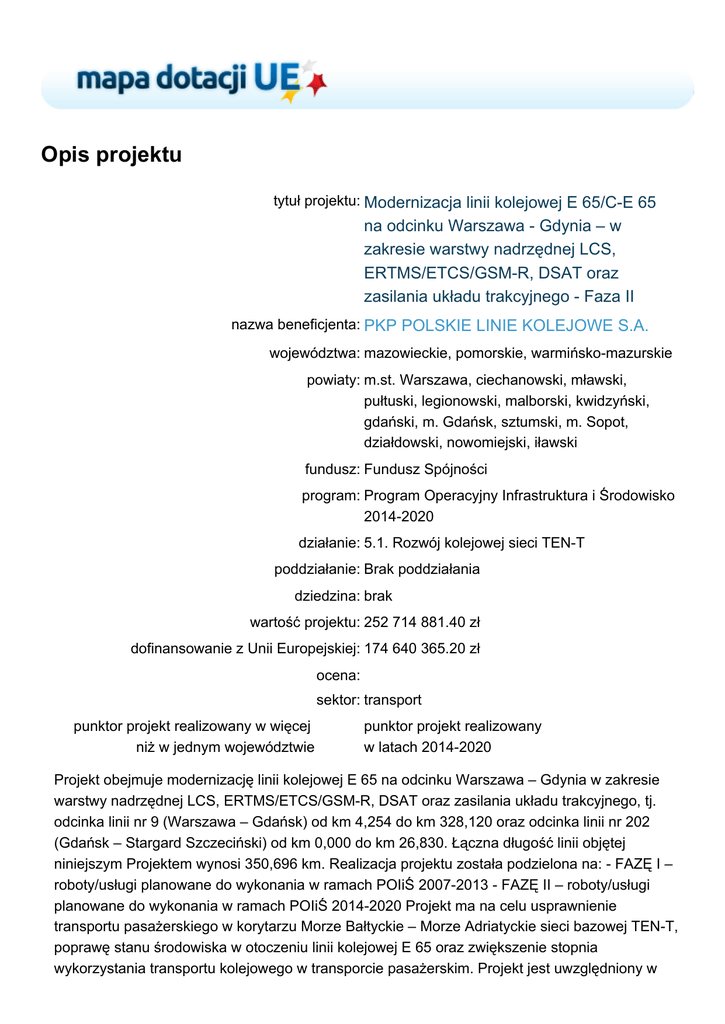 Opis projektu tytuł projektu: Modernizacja linii kolejowej E 65/C-E 65 na odcinku Warszawa - Gdynia – w zakresie warstwy nadrzędnej LCS, ERTMS/ETCS/GSM-R, DSAT oraz zasilania układu trakcyjnego - Faza II nazwa beneficjenta: PKP POLSKIE LINIE KOLEJOWE S.A. województwa: mazowieckie, pomorskie, warmińsko-mazurskie powiaty: m.st. Warszawa, ciechanowski, mławski, pułtuski, legionowski, malborski, kwidzyński, gdański, m. Gdańsk, sztumski, m. Sopot, działdowski, nowomiejski, iławski fundusz: Fundusz Spójności program: Program Operacyjny Infrastruktura i Środowisko 2014-2020 działanie: 5.1. Rozwój kolejowej sieci TEN-T poddziałanie: Brak poddziałania dziedzina: brak wartość projektu: 252 714 881.40 zł dofinansowanie z Unii Europejskiej: 174 640 365.20 zł ocena: sektor: transport punktor projekt realizowany w więcej niż w jednym województwie punktor projekt realizowany w latach 2014-2020 Projekt obejmuje modernizację linii kolejowej E 65 na odcinku Warszawa – Gdynia w zakresie warstwy nadrzędnej LCS, ERTMS/ETCS/GSM-R, DSAT oraz zasilania układu trakcyjnego, tj. odcinka linii nr 9 (Warszawa – Gdańsk) od km 4,254 do km 328,120 oraz odcinka linii nr 202 (Gdańsk – Stargard Szczeciński) od km 0,000 do km 26,830. Łączna długość linii objętej niniejszym Projektem wynosi 350,696 km. Realizacja projektu została podzielona na: - FAZĘ I – roboty/usługi planowane do wykonania w ramach POIiŚ 2007-2013 - FAZĘ II – roboty/usługi planowane do wykonania w ramach POIiŚ 2014-2020 Projekt ma na celu usprawnienie transportu pasażerskiego w korytarzu Morze Bałtyckie – Morze Adriatyckie sieci bazowej TEN-T, poprawę stanu środowiska w otoczeniu linii kolejowej E 65 oraz zwiększenie stopnia wykorzystania transportu kolejowego w transporcie pasażerskim. Projekt jest uwzględniony w dokumencie „Master Plan dla Transportu Kolejowego w Polsce do 2030 roku” (sierpień 2008 r.) i objęty priorytetem „usprawnienie przewozów pasażerów i ładunków w korytarzach transeuropejskiej sieci transportowej (TEN-T)”. Linia kolejowa E 65 na odcinku Warszawa – Działdowo – Gdynia jest częścią podstawowej sieci kolejowej państwa, stanowiąc element korytarza kolejowego Morze Bałtyckie – Morze Adriatyckie sieci TEN-T oraz 23 Projektu Priorytetowego (PP 23) sieci TEN-T. Zakres przedmiotowy Projektu obejmuje wykonanie dokumentacji technicznej oraz przeprowadzenie robót budowlanych w zakresie: • Zabudowy warstwy nadrzędnej urządzeń sterowania ruchem kolejowym w 8 LCS-ach • Zabudowy systemu ERTMS/ETCS Poziom 2 • Zabudowy systemu ERTMS/GSM-R • Zabudowy urządzeń DSAT • Modernizacji systemu zasilania trakcji