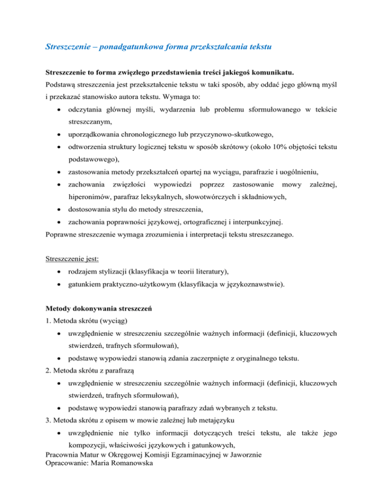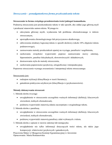 Streszczenie – ponadgatunkowa forma przekształcania tekstu Streszczenie to forma zwięzłego przedstawienia treści jakiegoś komunikatu. Podstawą streszczenia jest przekształcenie tekstu w taki sposób, aby oddać jego główną myśl i przekazać stanowisko autora tekstu. Wymaga to: odczytania głównej myśli, wydarzenia lub problemu sformułowanego w tekście streszczanym, uporządkowania chronologicznego lub przyczynowo-skutkowego, odtworzenia struktury logicznej tekstu w sposób skrótowy (około 10% objętości tekstu podstawowego), zastosowania metody przekształceń opartej na wyciągu, parafrazie i uogólnieniu, zachowania zwięzłości wypowiedzi poprzez zastosowanie mowy zależnej, hiperonimów, parafraz leksykalnych, słowotwórczych i składniowych, dostosowania stylu do metody streszczenia, zachowania poprawności językowej, ortograficznej i interpunkcyjnej. Poprawne streszczenie wymaga zrozumienia i interpretacji tekstu streszczanego. Streszczenie jest: rodzajem stylizacji (klasyfikacja w teorii literatury), gatunkiem praktyczno-użytkowym (klasyfikacja w językoznawstwie). Metody dokonywania streszczeń 1. Metoda skrótu (wyciąg) uwzględnienie w streszczeniu szczególnie ważnych informacji (definicji, kluczowych stwierdzeń, trafnych sformułowań), podstawę wypowiedzi stanowią zdania zaczerpnięte z oryginalnego tekstu. 2. Metoda skrótu z parafrazą uwzględnienie w streszczeniu szczególnie ważnych informacji (definicji, kluczowych stwierdzeń, trafnych sformułowań), podstawę wypowiedzi stanowią parafrazy zdań wybranych z tekstu. 3. Metoda skrótu z opisem w mowie zależnej lub metajęzyku uwzględnienie nie tylko informacji dotyczących treści tekstu, ale także jego kompozycji, właściwości językowych i gatunkowych, Pracownia Matur w Okręgowej Komisji Egzaminacyjnej w Jaworznie Opracowanie: Maria Romanowska wprowadzenie elementów własnej oceny tekstu poprzez zastosowanie słownictwa oceniającego – zwrotów charakterystycznych dla komentarza i opinii. 4. Metoda uogólnienia uwzględnienie w streszczeniu wniosków dotyczących szczególnie ważnych informacji, poszczególnych jednostkowych faktów i przesłanek zawartych w tekście streszczanym, podstawę wypowiedzi stanowią zdania o charakterze ogólnym, syntetycznym. Podział streszczeń ze względu na strukturę tworzoną przez zespół pytań, które zadajemy tekstowi. 1. Streszczenie o strukturze podstawowej Obligatoryjne składniki streszczenia odpowiadają strukturze semantycznej zdania i tekstu. TEMAT – to, o czym się mówi, czego dotyczy zdanie/tekst; w przypadku streszczenia jako całości tekstu mówimy o HIPERTEMACIE. REMAT – to, co się mówi o temacie; W przypadku streszczenia jako całości tekstu mówimy o HIPERREMACIE. Temat i remat są obowiązkowymi elementami streszczenia. Uwaga: Temat można pominąć jedynie wtedy, kiedy informację o nim zawiera tytuł tekstu oryginalnego i tytuł ten zostanie zamieszczony w streszczeniu. Pytania zadawane tekstowi, który podlega streszczeniu: Pytania podstawowe: O czym się mówi w tekście? Czego dotyczy tekst? Jaka jest główna myśl/problem tekstu? Te pytania pozwolą określić TEMAT (hipertemat) tekstu. Co na temat problemu zostało powiedziane w tekście? Co autor tekstu mówi w nim o głównym temacie/problemie? Te pytania pozwolą odtworzyć i zreferować REMAT (hiperremat) tekstu. Pracownia Matur w Okręgowej Komisji Egzaminacyjnej w Jaworznie Opracowanie: Maria Romanowska 2. Streszczenie o strukturze rozbudowanej Obligatoryjnym składnikom streszczenia, TEMATOWI I REMATOWI, towarzyszą takie składniki fakultatywne jak informacja o nadawcy, odbiorcy tekstu, o jego gatunku, elementy oceny i komentarza autorskiego. Pytania zadawane tekstowi, który podlega streszczeniu Pytania podstawowe: O czym jest tekst? O czym się mówi w tekście? Czego dotyczy tekst? te pytania pozwolą określić TEMAT (hipertemat) tekstu Co na temat problemu zostało powiedziane w tekście? Co autor tekstu mówi w nim o głównym temacie/problemie? Pytania fakultatywne: Kto napisał tekst? Kto jest autorem tekstu? Do kogo tekst jest adresowany? Kto jest odbiorcą tekstu? Jakie operacje badawcze, logiczne, kompozycyjne wykonuje autor tekstu? W jaki sposób autor tekstu prowadzi dowodzenie w tekście, relacjonuje wydarzenia/ stan badań, jaką kompozycję przyjmuje? Na czym autor tekstu opiera swoje główne założenia? Na podstawie jakich przesłanek autor opiera swoje tezy? Jakimi metodami autor dochodzi do prezentowanych wniosków? Jakie intencje towarzyszą wypowiedzi? Z jaką intencją wypowiada się autor? Jaka jest ogólna konkluzja płynąca z tekstu? Jaka jest ogólna idea tekstu? Technika pisania streszczeń 1. Dokładna lektura tekstu, który ma zostać streszczony, zrozumienie jego sensu. 2. Wyodrębnienie w tekście części składowych, które rozwijają poruszane problemy. 3. Odnalezienie i wypisanie kluczowych informacji. 4. Rozwinięcie poszczególnych części streszczenia. 5. Dbałość o zwięzłość i klarowność oraz poprawność językową streszczenia. Ad. 1. Uważna lektura tekstu, podkreślenie w nim najważniejszych informacji, zrozumienie związków logicznych i przyczynowo-skutkowych jest podstawą do pracy nad streszczeniem Pracownia Matur w Okręgowej Komisji Egzaminacyjnej w Jaworznie Opracowanie: Maria Romanowska tekstu i operacji przekształcania, których wymaga streszczenie. Należy zwrócić także uwagę na kompozycję i starać się odczytać, z jakich części składa się tekst, w jaki sposób są one ze sobą powiązane i w jaki sposób rozwijają główną myśl tekstu. Ad. 2. Streszczany tekst ma często tytuł. Tytuł jest rodzajem zwięzłej informacji o treści lub problematyce tekstu. Może określać: temat podejmowany w tekście, wskazywać problem i koncentrować na nim uwagę odbiorcy, wskazywać ważne wydarzenie, czas i miejsce z tym wydarzeniem związane i zwracać na nie uwagę odbiorcy. 