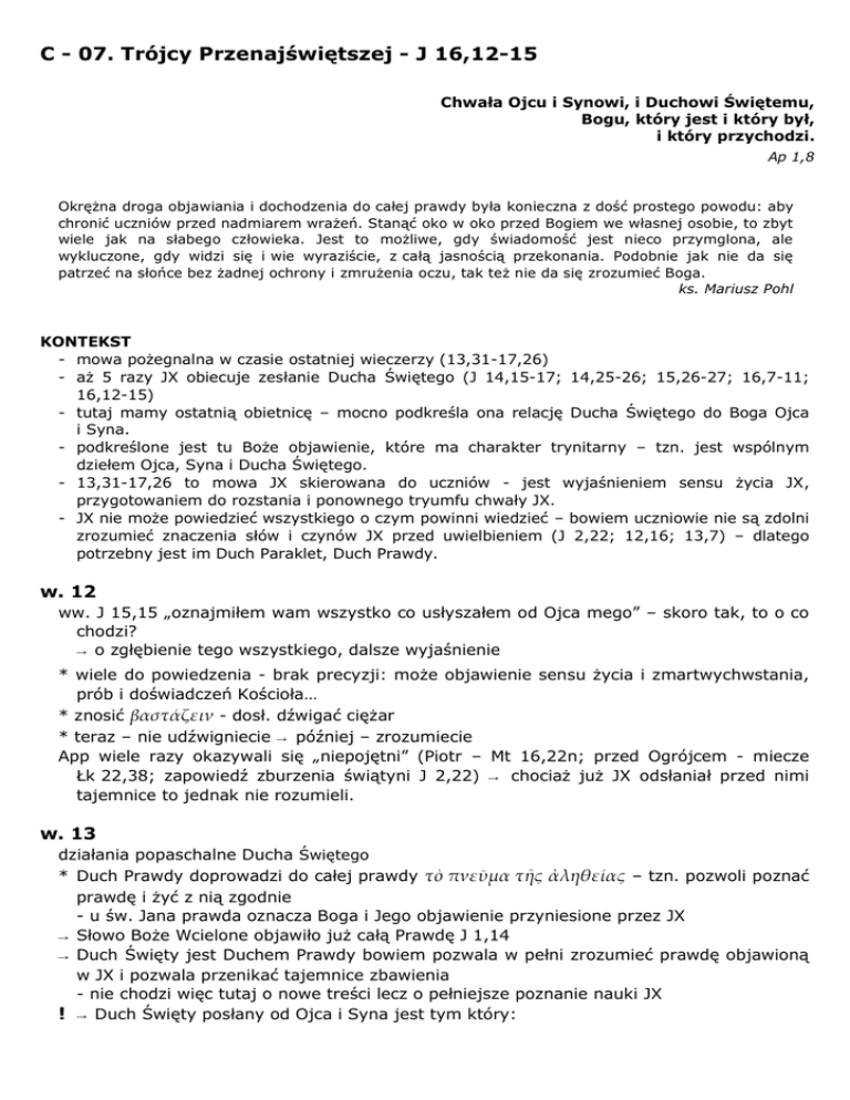 C - 07. Trójcy Przenajświętszej - J 16,12-15 Chwała Ojcu i Synowi, i Duchowi Świętemu, Bogu, który jest i który był, i który przychodzi. Ap 1,8 Okrężna droga objawiania i dochodzenia do całej prawdy była konieczna z dość prostego powodu: aby chronić uczniów przed nadmiarem wrażeń. Stanąć oko w oko przed Bogiem we własnej osobie, to zbyt wiele jak na słabego człowieka. Jest to możliwe, gdy świadomość jest nieco przymglona, ale wykluczone, gdy widzi się i wie wyraziście, z całą jasnością przekonania. Podobnie jak nie da się patrzeć na słońce bez żadnej ochrony i zmrużenia oczu, tak też nie da się zrozumieć Boga. ks. Mariusz Pohl KONTEKST - mowa pożegnalna w czasie ostatniej wieczerzy (13,31-17,26) - aż 5 razy JX obiecuje zesłanie Ducha Świętego (J 14,15-17; 14,25-26; 15,26-27; 16,7-11; 16,12-15) - tutaj mamy ostatnią obietnicę – mocno podkreśla ona relację Ducha Świętego do Boga Ojca i Syna. - podkreślone jest tu Boże objawienie, które ma charakter trynitarny – tzn. jest wspólnym dziełem Ojca, Syna i Ducha Świętego. - 13,31-17,26 to mowa JX skierowana do uczniów - jest wyjaśnieniem sensu życia JX, przygotowaniem do rozstania i ponownego tryumfu chwały JX. - JX nie może powiedzieć wszystkiego o czym powinni wiedzieć – bowiem uczniowie nie są zdolni zrozumieć znaczenia słów i czynów JX przed uwielbieniem (J 2,22; 12,16; 13,7) – dlatego potrzebny jest im Duch Paraklet, Duch Prawdy. w. 12 ww. J 15,15 „oznajmiłem wam wszystko co usłyszałem od Ojca mego” – skoro tak, to o co chodzi? → o zgłębienie tego wszystkiego, dalsze wyjaśnienie * wiele do powiedzenia - brak precyzji: może objawienie sensu życia i zmartwychwstania, prób i doświadczeń Kościoła… * znosić βαστάζειν - dosł. dźwigać ciężar * teraz – nie udźwigniecie → później – zrozumiecie App wiele razy okazywali się „niepojętni” (Piotr – Mt 16,22n; przed Ogrójcem - miecze Łk 22,38; zapowiedź zburzenia świątyni J 2,22) → chociaż już JX odsłaniał przed nimi tajemnice to jednak nie rozumieli. w. 13 działania popaschalne Ducha Świętego * Duch Prawdy doprowadzi do całej prawdy τὸ πνεῦμα τῆς ἀληθείας – tzn. pozwoli poznać prawdę i żyć z nią zgodnie - u św. Jana prawda oznacza Boga i Jego objawienie przyniesione przez JX → Słowo Boże Wcielone objawiło już całą Prawdę J 1,14 → Duch Święty jest Duchem Prawdy bowiem pozwala w pełni zrozumieć prawdę objawioną w JX i pozwala przenikać tajemnice zbawienia - nie chodzi więc tutaj o nowe treści lecz o pełniejsze poznanie nauki JX ! → Duch Święty posłany od Ojca i Syna jest tym który: * doprowadzi ὁδηγήσει (οδος – droga) - wprowadzi, dosł. poprowadzi po drodze - Paraklet będzie Przewodnikiem na drodze → ma wskazywać kierunek i doprowadzić do prawdy ! trzeba poznać drogę Pana i iść nią w życiu → mówienie wewn. w sercach ludzi umożliwiające wsłuchiwanie się w orędzie JX → nie chodzi o jakieś prawdy szczegółowe ale o Prawdę, którą jest JX - J 14,6 (Mówi mu Jezus Ja jestem droga i prawda i życie nikt przychodzi do Ojca jeśli nie przeze Mnie) * mówił λαλήσει – będzie wyrażał, oświadczał – mówienie uroczyste - JX dalej będzie słyszalny dzięki działaniu Ducha Świętego - będzie czynił zrozumiałym to, co usłyszy od Syna (JX głosił co słyszał od Ojca 8,26n; podobnie teraz Duch Święty). * oznajmi ἀναγγελεῖ (ἀνα + άγγελος → przedrostek sugerujący, że chodzi o informacje otrzymane + czasownik posyłać) - odsłonić coś, co dotychczas było nieznane, ukryte, trudne do zrozumienia. - termin mówi o funkcji pośrednika → w utworach apokaliptycznych * rzeczy przyszłe – dotyczy raczej reakcji na wydarzenia, w których będą uczestniczyć w życiu. Duch Święty będzie prowadził wspólnotę Kościoła do zrozumienia JX jako tego, który wypełni wszystko, co zostało obiecane w Piśmie w. 14-15 * otoczy chwałą – atrybut Boży, który ujawnia się w czasie objawień (Wj 16,9; a w Ew. św. Jana: w Osobie JX we Wcieleniu a najbardziej w wywyższeniu na krzyżu) Duch otoczy JX chwałą → tzn. Duch wykaże, że JX już wszedł do chwały Ojca * z mojego weźmie – użyte 2x – wskazuje na „ojcowiznę” JX, posiadłość w domu Ojca. - wszystko co ma Ojciec jest moje! (17,10; 10,30) → chodzi nie tylko o tajemnicę (jakby zasłonięcie), ale także o życie które jest w Ojcu i Synu (5,26) o miłość, która jest z Boga, o chwałę udzieloną Synowi (15,2.22) Skrutacja Uroczystość Trójcy Świętej C - J 16,12-15 w. 12 J 14,30 J 15,15 Dz 1,3 Mk 4,33 1 Kor 3,1-2 Hbr 5,11-14 w. 13 Ps 86,11 J 14,17 1 J 4,6 1 Kor 2,10-13 1 J 2,27 J 3,32 J 7,16 J 8,38 Dz 2,17-18 2Tes 2,1+4 2 Tes 2,11+13 Ap 1,19 Ps 25,5 J 15,26 J 14,26 Ef 4,7-15 1 J 2,19-20 J 12,49 Jl 3,1 Dz 20,22-24 1 J 4,6 J 14,26 w. 14-15 J 16,7-11 1 Kor 12,3 1 P 1,10-12 1 J 4,1-3 1 J 4,13-14 1 Kor 2,7-10 2 Kor 3,14-18 J 3,35 J 10,29-30 J 17,1-4 J 17,10 Mt 28,18 Łk 10,22 Kol 2,9-10 Dz 2,32-36 Dz 4,9-12 1 P 2,7-8 1 J 5,6 J 15,26 Za 12,10 2 Kor 4,6 Gal 5,5-6 1 J 3,23-24 1 J 5,20 Ap 19,10 J 13,1-4 Mt 11,27 Łk 15,31 Kol 1,19-20 Kol 2,3