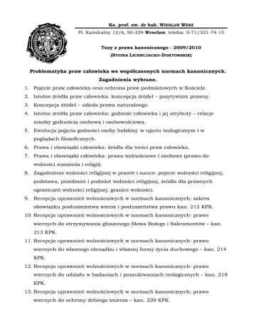 Ks. prof. zw. dr hab. WIESŁAW WENZ Pl. Katedralny 12/6, 50-329 Wrocław, telefax. 0-71/321-74-15 Tezy z prawa kanonicznego - 2009/2010 (STUDIA LICENCJACKO-DOKTORSKIE) Problematyka praw człowieka we współczesnych normach kanonicznych. Zagadnienia wybrane. 1. Pojęcie praw człowieka oraz ochrona praw podmiotowych w Kościele. 2. Istotne źródła praw człowieka: koncepcja źródeł – pozytywizm prawny. 3. Koncepcja źródeł – szkoła prawa naturalnego. 4. Istotne źródła praw człowieka: godność człowieka i jej atrybuty – relacje między godnością osobową i osobowościową. 5. Ewolucja pojęcia godności osoby ludzkiej: w ujęciu teologicznym i w poglądach filozoficznych. 6. Prawa i obowiązki człowieka: źródła dla treści praw człowieka. 7. Prawa i obowiązki człowieka: prawa wolnościowe i osobowe (prawo do wolności sumienia i religii). 8. Zagadnienie wolności religijnej w prawie i nauce: pojęcie wolności religijnej, podstawa, przedmiot i podmiot wolności religijnej, źródła dla prawnych ograniczeń wolności religijnej: granice wolności. 9. Recepcja uprawnień wolnościowych w normach kanonicznych: zakres obowiązku posłuszeństwa wierze i posłuszeństwa prawu kan. 212 KPK. 10. Recepcja uprawnień wolnościowych w normach kanonicznych: prawo wiernych do otrzymywania głoszonego Słowa Bożego i Sakramentów – kan. 213 KPK. 11. Recepcja uprawnień wolnościowych w normach kanonicznych: prawo wiernych do własnego obrządku i własnej formy życia duchowego – kan. 214 KPK. 12. Recepcja uprawnień wolnościowych w normach kanonicznych: prawo wiernych do udziału w badaniach i poszukiwaniach teologicznych – kan. 218 KPK. 13. Recepcja uprawnień wolnościowych w normach kanonicznych: prawo wiernych do ochrony dobrego imienia – kan. 220 KPK. 14. Recepcja uprawnień wolnościowych w normach kanonicznych: prawo wiernych do wyboru stanu życia – kan. 219 KPK. 15. Prawa i obowiązki człowieka: prawa społeczne realizowane przez władze państwowe. 16. Prawa i obowiązki człowieka: prawa solidarnościowe. 17. Prawo do życia: ochrona życia w prawodawstwie kościelnym – przesłanki biblijno-teologiczne. 18. Prawo do życia: ochrona życia w prawodawstwie do Soboru Watykańskiego II. 19. Prawo do życia: ochrona życia w prawodawstwie posoborowym i nauczaniu Jana Pawła II. 20. Ochrona prawa do życia w KPK: kan. 1397. 21. Ochrona prawa do życia w KPK: kan. 1398. LITERATURA: • • • • • • • Kodeks Prawa Kanonicznego z 1983 roku. Kodeks Kanonów Kościołów Wschodnich, Lublin 2002. Syryjczyk J., Niektóre gwarancje sprawiedliwego wymiaru kar w Kodeksie Prawa Kanonicznego z 1983 r., w: Prawo Kanoniczne 34:1991, nr 3-4, s.147-163. Mazurek E., Prawa człowieka w nauczaniu społecznym Kościoła, Lublin 1991. Skorowski H., Problematyka praw człowieka, Warszawa 2005. Wenz W., Kancelaria parafialna jako przestrzeń posługiwania. Studium kanoniczno-pastoralne, Wrocław 2008. Dokumenty Apostolskie cytowane w trakcie wykładów i Komentarze do poszczególnych kanonów KPK. 2