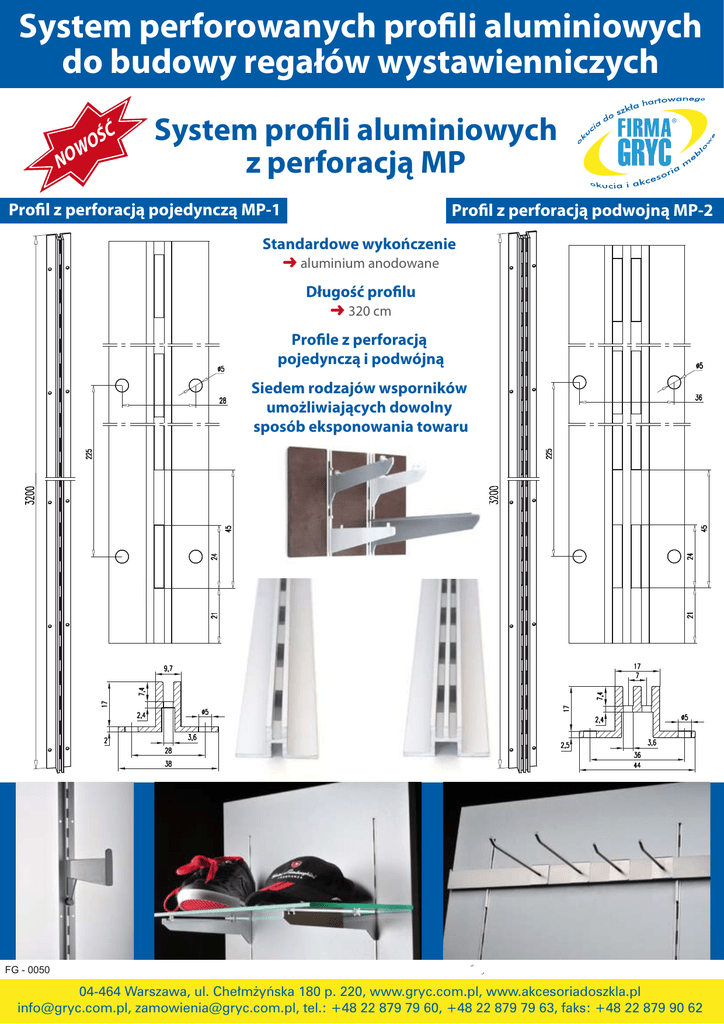System perforowanych profili aluminiowych do budowy regałów wystawienniczych Ć Ś WO NO System profili aluminiowych z perforacją MP Profil z perforacją pojedynczą MP-1 Profil z perforacją podwojną MP-2 Standardowe wykończenie ‹ aluminium anodowane Długość profilu ‹ 320 cm Profile z perforacją pojedynczą i podwójną Siedem rodzajów wsporników umożliwiających dowolny sposób eksponowania towaru FG - 0050 57 04-464 Warszawa, ul. Che³m¿yñska 180 p. 220, www.gryc.com.pl, www.akcesoriadoszkla.pl [email protected], [email protected], tel.: +48 22 879 79 60, +48 22 879 79 63, faks: +48 22 879 90 62