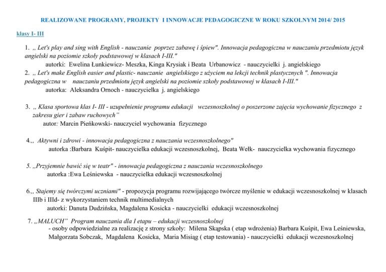 REALIZOWANE PROGRAMY, PROJEKTY I INNOWACJE PEDAGOGICZNE W ROKU SZKOLNYM 2014/ 2015 klasy I- III 1. ,, Let's play and sing with English - nauczanie poprzez zabawę i śpiew". Innowacja pedagogiczna w nauczaniu przedmiotu język angielski na poziomie szkoły podstawowej w klasach I-III." autorki: Ewelina Łunkiewicz- Meszka, Kinga Krysiak i Beata Urbanowicz - nauczycielki j. angielskiego 2. ,, Let's make English easier and plastic- nauczanie angielskiego z użyciem na lekcji technik plastycznych ". Innowacja pedagogiczna w nauczaniu przedmiotu język angielski na poziomie szkoły podstawowej w klasach I-III." autorka: Aleksandra Ornoch - nauczycielka j. angielskiego 3. ,, Klasa sportowa klas I- III - uzupełnienie programu edukacji wczesnoszkolnej o poszerzone zajęcia wychowanie fizycznego z zakresu gier i zabaw ruchowych” autor: Marcin Pieńkowski- nauczyciel wychowania fizycznego 4.,, Aktywni i zdrowi - innowacja pedagogiczna z nauczania wczesnoszkolnego" autorka :Barbara Kuśpit- nauczycielka edukacji wczesnoszkolnej, Beata Wełk- nauczycielka wychowania fizycznego 5. ,,Przyjemnie bawić się w teatr" - innowacja pedagogiczna z nauczania wczesnoszkolnego autorka :Ewa Leśniewska - nauczycielka edukacji wczesnoszkolnej 6.,, Stajemy się twórczymi uczniami" - propozycja programu rozwijającego twórcze myślenie w edukacji wczesnoszkolnej w klasach IIIb i IIId- z wykorzystaniem technik multimedialnych autorki: Danuta Dudzińska, Magdalena Kosicka - nauczycielki edukacji wczesnoszkolnej 7. „MALUCH” Program nauczania dla I etapu – edukacji wczesnoszkolnej - osoby odpowiedzialne za realizację z strony szkoły: Milena Skąpska ( etap wdrożenia) Barbara Kuśpit, Ewa Leśniewska, Małgorzata Sobczak, Magdalena Kosicka, Maria Misiąg ( etap testowania) - nauczycielki edukacji wczesnoszkolnej 8.Ogólnopolski program ,, MAŁY MISTRZ" realizowany przy współpracy z Ministerstwem Sportu i Turystyki - osoby odpowiedzialne za realizację z strony szkoły: Agnieszka Leboda, Jacek Brynkiewicz- nauczyciele wychowania fizycznego; Lucyna Dajnowicz, Helena Szynkiewicz - nauczycielki edukacji wczesnoszkolnej klasy IV- VI 1. ,, Program własny wychowania fizycznego dla klasy sportowej o ukierunkowaniu ogólnorozwojowym w Szkole Podstawowej nr 1 w Szczecinku ” autorki: Małgorzata Brynkiewicz, Agnieszka Leboda - nauczyciele wychowania fizycznego 2. ,, Modyfikacja programu własnego wychowania fizycznego dla klasy sportowej o ukierunkowaniu ogólnorozwojowym w Szkole Podstawowej nr 1 w Szczecinku ” autor: Marcin Pieńkowski, Jacek Brynkiewicz - nauczyciele wychowania fizycznego 3. ,, Modyfikacja programu własnego wychowania fizycznego dla klasy sportowej o ukierunkowaniu ogólnorozwojowym w Szkole Podstawowej nr 1 w Szczecinku ” autorka: Beata Wełk, Marzena Zyśko- nauczycielki wychowania fizycznego 4. ,, Program własny z nauki pływania dla klas IV, V, VI” autorka: Beata Wełk – nauczycielka wychowania fizycznego 5. ,,Film animowany w Jedynce. Akcja! Szkolne koło filmu animowanego. Innowacja pedagogiczna uczniów dla klas IV - VI Szkoły Podstawowej nr 1 w Szczecinku realizowana w latach 2013- 2016 " autorki: Alicja Jankowska- nauczyciel bibliotekarz, Anna Mikołajczak- nauczyciel plastyki 6.Program realizowany wspólnie Muzeum Regionalnym w Szczecinku Program edukacji historycznej dla szkół podstawowych ,, Moje spotkania z Muzeum" - osoby odpowiedzialne za realizację z strony szkoły: Anna Mikołajczak, Alicja Jankowska 7. ,, Czwartki lekkoatletyczne"- cykl imprez organizowanych przez nauczycieli wychowania fizycznego ze Szkoły Podstawowej nr 1 w Szczecinku w ramach współpracy ze Stowarzyszeniem ,, Sport Dzieci i Młodzieży" - osoby odpowiedzialne za realizację z strony szkoły: Małgorzata Brynkiewicz, Jacek Brynkiewicz- nauczyciele wychowania fizycznego