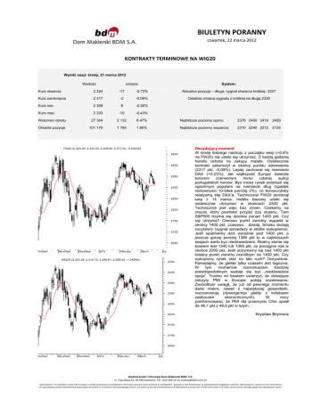 BIULETYN PORANNY czwartek, 22 marca 2012 KONTRAKTY TERMINOWE NA WIG20 Wyniki sesji: środa, 21 marca 2012 Wartość zmiana System: Kurs otwarcia 2 324 -17 -0.73% Aktualna pozycja – długa, sygnał otwarcia krótkiej- 2307 Kurs zamknięcia 2 317 -2 -0.09% Ostatnia zmiana sygnału z krótkiej na długą 2320 Kurs min. 2 309 -6 -0.26% Kurs max. 2 333 -10 -0.43% Wolumen obrotu 27 304 2 132 8.47% Najbliższe poziomy oporu: 2378 2400 2418 2450 Otwarte pozycje 101 170 1 784 1.80% Najbliższe poziomy wsparcia: 2310 2240 2212 2135 FW20 (2,324.00, 2,333.00, 2,309.00, 2,317.00, -2.00000) 2450 2400 2350 2300 2250 2200 2150 2100 2050 October November December 2012 February March Ap WIG20 (2,303.28, 2,315.72, 2,290.61, 2,298.42, -1.34009) 2450 2400 2350 2300 2250 Decydujący moment W środę dobrego nastroju z początku sesji (+0,6% na FW20) nie udało się utrzymać. Z każdą godziną handlu ochota na zakupy malała. Ostatecznie kontrakt zakończył w okolicy punktu odniesienia (2317 pkt, -0,09%). Lepiej zachował się niemiecki DAX (+0,23%), ale większość Europy świeciła kolorem czerwonym mimo udanej aukcji portugalskich bonów. Być może rynek przeraził się ogromnym popytem na niemiecki dług (spadek rentowności 10-latek poniżej 2%), co tłumaczyłoby relatywną siłę DAX’a. Technicznie FW20 domknął lukę z 14 marca. Indeks bazowy udało się ostatecznie utrzymać w okolicach 2300 pkt. Technicznie jest więc bez zmian. Czekamy na impuls, który powinien przyjść zza oceanu. Tam S&P500 trzyma się dzielnie ponad 1400 pkt. Czy się utrzyma? Cenowo punkt zwrotny wypada w okolicy 1405 pkt, czasowo... dzisiaj. Smaku dodają oscylatory (sygnał sprzedaży w strefie wykupienia). Jeśli spadniemy dziś wyraźnie pod 1400 pkt, a jeszcze gorzej poniżej 1380 pkt to w najbliższych sesjach warto być niedźwiedziem. Realny stanie się bowiem test 1340 lub 1300 pkt, co pociągnie nas w okolice 2200 pkt. Jeśli utrzymamy się nad 1400 pkt kolejny punkt zwrotny oceniłbym na 1450 pkt. Czy wykupiony rynek stać na taki ruch? Oczywiście. Pamiętajmy, że giełda tylko czasami jest logiczna. W tym momencie scenariuszem bardziej prawdopodobnym wydaje się być „niedźwiedzia opcja”. Trudno mi bowiem uwierzyć, że dzisiejsze odczyty PMI w Europie pobiją oczekiwania. Zwróciłbym uwagę, że już od pewnego momentu dane makro, nawet z największej gospodarki, rozczarowują (dywergencja giełdy z indeksem zaskoczeń ekonomicznych). W nocy poinformowano, że PMI dla przemysłu Chin spadł do 48,1 pkt z 49,6 pkt w lutym. 2200 Krystian Brymora 2150 2100 2050 October November December 2012 February March Ap Wydział Analiz i Informacji Dom Maklerski BDM S.A. ul. 3‐go Maja 23, 40‐096 Katowice, Tel.: 032 208 14 12, [email protected] Opracowanie ma charakter czysto informacyjny i zostało opracowany na podstawie informacji uznanych przez autorów za wiarygodne . Zawarte w nim komentarze są subiektywnymi poglądami autorów. Opracowanie i zawarte w nim komentarze nie są podstawą żadnej rekomendacji kupna bądź sprzedaży w rozumieniu obowiązującego prawa i nie powinny być tak interpretowane. Publikowanie w prasie lub w Internecie całości lub części opracowania wymaga zgody sporządzających raport. BIULETYN PORANNY czwartek, 22 marca 2012 RYNEK AKCJI Wyniki sesji: środa, 21 marca 2012 Zakres wahań Wartość obrotów [mln PLN] 52 tygodnie Indeks Kurs otwarcia Kurs zamknięcia Zmiana [%] Kurs min. Kurs max. Kurs max. Kurs min. WIG20 2 942.4 2 019.0 2 303.28 2 298.42 -0.06% 2 290.61 2 315.72 25.1 552 sWIG80 12 932.0 8 190.8 10 411.01 10 354.78 -0.41% 10 314.05 10 418.37 104.3 47,5 mWIG40 2 993.2 2 054.5 2 538.97 2 522.83 -0.24% 2 514.79 2 544.81 30.0 103 WIG PL 49 765.2 35 670.7 41 316.20 41 121.63 -0.16% 41 046.69 41 316.20 269.5 - WIG 50 501.8 35 349.0 41 654.81 41 529.19 -0.14% 41 405.52 41 829.56 424.0 718 Spółka Cena [PLN] zmiana % Mkt Cap [mln PLN] zmiana % względem WIG20 1M 3M 6M 48.88 3 791 -1.0% -9.6% 2.1% 27.6% -1.0% -8.4% -4.9% 19.3% BANK HANDLOWY 79.90 10 440 0.0% 5.3% 15.8% 19.3% 0.1% 6.6% 8.8% 11.0% BOGDANKA 129.80 4 415 0.1% 0.0% 24.8% 21.8% 0.1% 1.3% 17.8% 13.5% BORYSZEW 0.79 1 783 -1.3% -3.7% 23.4% 75.6% -1.2% -2.4% 16.5% 67.3% BRE 295.00 12 420 -2.9% -0.2% 24.5% 35.9% -2.8% 1.1% 17.5% 27.7% GTC 6.70 1 470 -1.3% -21.5% -28.0% -32.3% -1.3% -20.3% -35.0% -40.6% JSW 95.20 11 349 -1.9% -11.0% 9.4% 5.8% -1.8% -9.7% 2.4% -2.5% KERNEL 69.75 5 558 1.2% -0.7% 4.7% 16.3% 1.3% 0.6% -2.3% 8.0% KGHM 147.90 29 580 0.0% 6.5% 29.7% 6.0% 0.1% 7.8% 22.8% -2.3% ASSECOPOL dzienna 1M 3M 6M dzienna LOTOS 27.14 3 525 -1.6% 0.5% 20.1% 3.6% -1.5% 1.8% 13.1% -4.7% PEKAO 152.20 39 935 0.5% -2.4% 4.4% 22.7% 0.6% -1.2% -2.6% 14.5% PGE 19.30 36 087 -0.2% -4.8% -6.8% 10.9% -0.1% -3.5% -13.7% 2.6% PGNIG 3.93 23 187 -0.5% 5.4% -3.0% -3.0% -0.4% 6.6% -9.9% -11.2% PKNORLEN 38.00 16 253 2.4% 6.1% 13.8% 13.4% 2.5% 7.4% 6.8% 5.1% PKOBP 34.00 42 500 0.0% -2.9% 4.8% 15.3% 0.1% -1.6% -2.2% 7.0% PZU 319.90 27 624 -1.4% -5.9% 3.5% -4.3% -1.4% -4.6% -3.5% -12.6% SYNTHOS 6.30 8 336 1.9% 23.5% 47.5% 64.5% 2.0% 24.8% 40.6% 56.2% TAURON 5.18 9 078 -1.0% -3.2% 2.2% 6.8% -0.9% -1.9% -4.8% -1.5% TPSA 16.95 22 639 1.1% -0.3% 0.3% -0.3% 1.2% 1.0% -6.7% -8.6% TVN 10.85 3 731 -1.4% -5.7% 3.9% -19.6% -1.3% -4.4% -3.1% -27.9% Komentarz po sesji Komentarz przed sesją: Nadal bez atrakcji Chiński PMI w dół Na początku roku mówiono o kilku kluczowych sprawach dla rynków kapitałowych. Główną kwestią, na którą zwracali uwagę inwestorzy, był kryzys zadłużenia w Europie, który aktualnie przesunął się na dalszy plan, choć w każdej chwili może ponownie wysunąć się na pierwsze miejsce w serwisach informacyjnych. Kolejnymi istotnymi tematami były informacje gospodarcze z USA oraz Chin. W przypadku Stanów dane są jak na razie niezłe (choć warto przypomnieć, że tak było też na początku ubiegłego roku), tymczasem w Chinach publikowany dziś indeks PMI spadł piąty miesiąc z rzędu, co staje się c