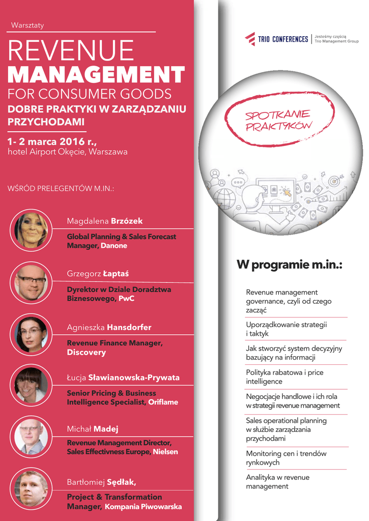 Warsztaty REVENUE MANAGEMENT FOR CONSUMER GOODS DOBRE PRAKTYKI W ZARZĄDZANIU PRZYCHODAMI 1- 2 marca 2016 r., SPOTKANIE PRAKTYKÓW hotel Airport Okęcie, Warszawa WŚRÓD PRELEGENTÓW M.IN.: Magdalena Brzózek Global Planning & Sales Forecast Manager, Danone Grzegorz Łaptaś Dyrektor w Dziale Doradztwa Biznesowego, PwC Revenue management governance, czyli od czego zacząć Agnieszka Hansdorfer Uporządkowanie strategii i taktyk Revenue Finance Manager, Discovery Jak stworzyć system decyzyjny bazujący na informacji Łucja Sławianowska-Prywata Polityka rabatowa i price intelligence Senior Pricing & Business Intelligence Specialist, Oriflame Michał Madej Revenue Management Director, Sales Effectivness Europe, Nielsen Bartłomiej Sędłak, Project & Transformation Manager, Kompania Piwowarska Negocjacje handlowe i ich rola w strategii revenue management Sales operational planning w służbie zarządzania przychodami Monitoring cen i trendów rynkowych Analityka w revenue management Warsztaty REVENUE MANAGEMENT FOR CONSUMER GOODS DOBRE PRAKTYKI W ZARZĄDZANIU PRZYCHODAMI hotel Airport Okęcie, Warszawa główne zagadnienia: JAK ZORGANIZOWAĆ PRACĘ DZIAŁU REVENUE MANAGEMENT TECHNIKI I NARZĘDZIA REVENUE MANAGEMENT MONITORING KONKURENCJI JAKO FILAR EFEKTYWNEJ STRATEGII ZARZĄDZANIA PRZYCHODAMI SPOTKANIE PRAKTYKÓW DOBRE PRAKTYKI ZARZĄDZANIA MARŻĄ POLITYKA RABATOWA I JEJ ZWIĄZEK Z REVENUE MANAGEMENT DATA&ANALYTICS W PROCESIE ZARZĄDZANIA PRZYCHODAMI Strategia revenue management znana jest od lat głównie w branży hotelarsko-turystycznej, jednak jej efektywność zaczyna być dostrzegana również w innych branżach. To jedyne w Polsce warsztaty, podczas których w jednym miejscu i czasie spotkają się ze sobą praktycy odpowiedzialni za zarządzanie i kształtowanie przychodów w firmie. Będzie to zarazem jedyna i unikalna okazja, aby w takim gronie podzielić się i jednocześnie skorzystać z wiedzy i doświadczenia osób, działających w różnych firmach z sektora retail i FMCG. W jaki sposób branża retail może wykorzystać proces revenue management, by lepiej zarządzać przychodami. W jaki sposób wykorzystać mechanizmy zarządzania marżą, cenami i rabatami, by maksymalizować zysk? Dlaczego niezbędny jest rzetelny monitoring konkurencji i skuteczne systemy motywacyjne? Na te i inne pytania odpowiedzą Państwu eksperci-praktycy reprezentujący: Discovery, Kompania Piwowarska, Danone, Nielsen, Oriflame, Netious.com., PwC. Patroni Medialni Serdecznie zapraszam do udziału! Marta Pawlikowska Project Director kom. 519 047 625 [email protected] STR 2 PROGRAM WARSZTATÓW Wtorek, 1 MARCA 2016 9:30 Poranna kawa i rejestracja 9:55 Powitanie uczestników i rozpoczęcie warsztatów 10:00 Revenue Management Governance, czyli od czego zacząć Miejsce działu w strukturze firmy – jak efektywnie zorganizować jego pracę Pozycja revenue management w organizacji – jak zapewnić wsparcie zarządu i senior managementu KPI, które należy stosować, aby mierzyć efektywność pracy działu Jak zapewnić sprawny przepływ informacji pomiędzy działem revenue management a innymi działami: finanse, category management, trade marketing – jakie znaczenie ma sprawna komunikacja i współpraca pomiędzy działami na podejmowanie decyzji w firmie Revenue management – jako usługa, nie produkt – wymaga ciągłego doskonalenia i zaangażowania Internal pricing policy: edukacja i zarządzanie zmianą dla wewnętrznych klientów Agnieszka Hansdorfer, Revenue Finance Manager, Discovery 10:50 Narzędzia Revenue Management/ Elementy efektywnej strategii Revenue Management Strategia cenowa a revenue management Techniki optymalizacji revenue management: polityka handlowa&pricinig, zapasy, kanały Efektywność sieci dystrybucji i jej wpływ na revenue management Które modele przychodów warto znać (revenue models) Mateusz Chołaściński, Założyciel, Netious.com. 11:45 Przerwa na STR 3 www.trioconferences.pl PROGRAM WARSZTATÓW Optymalizacja działań promocyjnych - perspektywa retailera 12:10 Promocje cenowe są szczególnie chętnie wykorzystywanym elementem polityki dystrybutorów. Dla wielu segmentów klientów stanowią również bardzo istotny magnes przyciągający do sklepów. Praktyka pokazuje jednak 60% promocji nie przynosi zakładanych wyników. Podczas warsztatu szczegółowo omówimy najczęściej popełniane błędy oraz najlepsze praktyki w zakresie: Doboru produktów na potrzeby promocji Optymalnego zarządzania mechanizmami promocyjnymi Klasycznych wrogów działań promocyjnych takich jak kanibalizacja i nie wykorzystany cross selling Strategii komunikacji wspierających działania promocyjne Oceny skuteczności działań i skutecznego prognozowania efektów przyszłych promocji Grzegorz Łaptaś, Dyrektor działu doradztwa biznesowego, PwC Optymalizacja działań promocyjnych - perspektywa producenta 13:00 Racjonalizacja inwestycji handlowych na poziomie grup klientów Przegląd mechanizmów promocyjnych kontraktowych i pozakontraktowych – rabaty frontowe, rabaty retro, pakiety, usługi marketingowe, itd. Popyt bazowy jako podstawa zrozumienia efektywności działań promocyjnych Dodatkowe składowe modeli analizy efektywności działań promocyjnych – efekt popromocyjny, kanibalizacja produktów substytucyjnych, utracona marża w okresie towarowania, itd. Preferowane narzędzia promocyjne z perspektywy producenta Grzegorz Łaptaś, Dyrektor działu doradztwa biznesowego, PwC 13:45 Lunch 14:30 Sztuka czy Nauka? Analiza Danych w procesie zarządzania przychodami Rola danych i analiz w procesie zarządzania przychodami w FMCG Analiza od kuchni (integracja danych i narzędzia analityczne) Szybkość podejmowania decyzji jest równie istotna jak ich trafność – jak uniknąć zbędnej biurokracji Michał Madej, Revenue Management Director, Sales Effectivness Europe, Nielsen 15:30 STR 4 Zarządzanie ceną – podejście bazujące na informacji Pricing intelligence