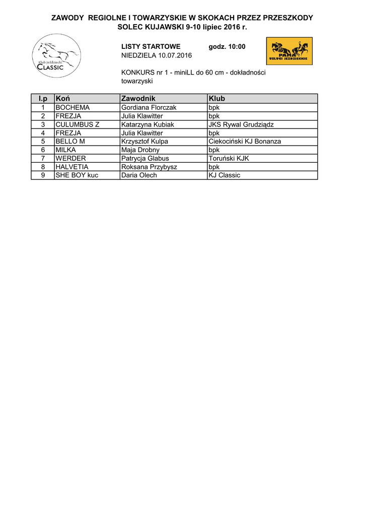 ZAWODY REGIOLNE I TOWARZYSKIE W SKOKACH PRZEZ PRZESZKODY SOLEC KUJAWSKI 9-10 lipiec 2016 r. LISTY STARTOWE NIEDZIELA 10.07.2016 godz. 10:00 KONKURS nr 1 - miniLL do 60 cm - dokładności towarzyski l.p 1 2 3 4 5 6 7 8 9 Koń Zawodnik Klub BOCHEMA FREZJA CULUMBUS Z FREZJA BELLO M MILKA WERDER HALVETIA SHE BOY kuc Gordiana Florczak Julia Klawitter Katarzyna Kubiak Julia Klawitter Krzysztof Kulpa Maja Drobny Patrycja Glabus Roksana Przybysz Daria Olech bpk bpk JKS Rywal Grudziądz bpk Ciekociński KJ Bonanza bpk Toruński KJK bpk KJ Classic ZAWODY REGIOLNE I TOWARZYSKIE W SKOKACH PRZEZ PRZESZKODY SOLEC KUJAWSKI 9-10 lipiec 2016 r. LISTY STARTOWE NIEDZIELA 10.07.2016 KONKURS nr 2 - LL - z trafieniem w normę czasu towarzyski l.p Koń Zawodnik Klub 1 2 3 4 5 6 7 8 9 10 11 12 13 14 15 16 17 18 19 20 21 22 23 24 25 26 27 28 29 SHE BOY kuc BOCHEMA CULUMBUS Z BELLO M MILKA WERDER HALVETIA EL DORADO PROGIS EL DORADO PROGIS PASJA HURAGAN PASJA HURAGAN GEORGIA LAMÓWKA NEVADA MALMO CYTRA GINGER ARCONTENDRA BARTONIA JASPER HOSSA KASJER DIMROY MEYBE ME NEKTARYNKA kuc Daria Olech Gordiana Florczak Katarzyna Kubiak Krzysztof Kulpa Maja Drobny Patrycja Glabus Roksana Przybysz Agnieszka Woś Klaudia Jakubowska Agnieszka Woś Klaudia Jakubowska Natalia Gwardzik Wojciech Laskowski Natalia Gwardzik Wojciech Laskowski Angelika Ojczenasz Dominika Gawlik Jagoda Tomaszewska Michał Pszczółkowski Józefina Siałkowska Marcelina Detmer Michalina Krzyżyńska Monika Zielińska Nina Szafrańska Oliwia Pasiut Sandra Skwarczyńska Tomasz Miśkiewicz Zofia Kowalska Małgorzata Zubrycka KJ Classic bpk JKS Rywal Grudziądz Ciekociński KJ Bonanza bpk Toruński KJK bpk KJ Classic KJ Młyńska Struga KJ Classic KJ Młyńska Struga bpk Gminny KJ Bogucin bpk Gminny KJ Bogucin Kujawsko-Pomorski KJ Toruński KJK JKS Rywal Grudziądz Ciechociński KJ Bonanza Toruński KJK Toruński KJK KJ Skok-Agrofood Kujawsko-Pomorski KJ bpk Kujawsko-Pomorski KJ PKJ Górki Zagajne LKS Nadwiślanin KJ Stajnia Jarużyn JKS Rywal Grudziądz ZAWODY REGIOLNE I TOWARZYSKIE W SKOKACH PRZEZ PRZESZKODY SOLEC KUJAWSKI 9-10 lipiec 2016 r. LISTY STARTOWE NIEDZIELA 10.07.2016 KONKURS nr 3 - L - dwufazowy art. 274.5.3 towarzyski l.p Koń Zawodnik Klub 1 2 3 4 5 6 7 8 9 10 11 12 13 14 15 16 17 18 19 20 21 22 23 24 25 26 27 28 29 30 31 32 33 34 35 36 37 38 NEKTARYNKA kuc TOGA DIMROY TOGA GEORGIA LAMÓWKA NEVADA MALMO CYTRA GINGER TINKA'S BOY ARCONTENDRA BARTONIA JASPER HOSSA KASJER MEYBE ME SALVADOR SELENA SALVADOR SELENA LADY STAR GRACJA ILEX EGRA SYLUR DEVITA BEJRA WINDY BOY DIAVOJ RINGO STAR MORGAN NASZA MI MALINA ERRATA TAVIANO ALCADO NIMBUS kuc Małgorzata Zubrycka Mateusz Olszewski Tomasz Miśkiewicz Mateusz Olszewski Angelika Ojczenasz Dominika Gawlik Jagoda Tomaszewska Michał Pszczółkowski Józefina Siałkowska Marcelina Detmer Tomasz Miśkiewicz Michalina Krzyżyńska Monika Zielińska Nina Szafrańska Oliwia Pasiut Sandra Skwarczyńska Zofia Kowalska Kamila Pabian Tomasz Miśkiewicz Kamila Pabian Tomasz Miśkiewicz Agata Włodarczyk Dominika Streich Julia Machalewska Kinga Kozłowska Krzysztof Kulpa Maja Wolny Marta Barzyk Marta Gapska Tomasz Miśkiewicz Milena Lisińska Paulina Zaleska Renata Kotkiewicz Roksana Wielicka Zbigniew Szrejder Mateusz Olszewski Tomasz Miśkiewicz Małgorzata Zubrycka JKS Rywal Grudziądz JKS Rywal Grudziądz LKS Nadwiślanin JKS Rywal Grudziądz Kujawsko-Pomorski KJ Toruński KJK JKS Rywal Grudziądz Ciechociński KJ Bonanza Toruński KJK Toruński KJK LKS Nadwiślanin KJ Skok-Agrofood Kujawsko-Pomorski KJ bpk Kujawsko-Pomorski KJ PKJ Górki Zagajne KJ Stajnia Jarużyn KJ Młyńska Struga LKS Nadwiślanin KJ Młyńska Struga LKS Nadwiślanin KJ Oxer Inowrocław KJ Oxer Inowrocław JKS Rywal Grudziądz Toruński KJK Ciekociński KJ Bonanza KJ Dilmar Sekcja Jeździecka Turzyn Kujawsko-Pomorski KJ LKS Nadwiślanin JKS Rywal Grudziądz bpk KJ Skok-Agrofood Kujawsko-Pomorski KJ JKS Rywal Grudziądz JKS Rywal Grudziądz LKS Nadwiślanin JKS Rywal Grudziądz ZAWODY REGIOLNE I TOWARZYSKIE W SKOKACH PRZEZ PRZESZKODY SOLEC KUJAWSKI 9-10 lipiec 2016 r. LISTY STARTOWE NIEDZIELA 10.07.2016 KONKURS nr 4 - zwykły art. 238.2.1 l.p Koń Zawodnik Klub 1 2 3 4 5 6 7 8 9 10 11 12 13 14 15 16 17 18 19 20 21 22 23 24 25 26 27 28 29 30 31 32 33 34 35 36 37 ALCADO BRISLA V.D. NORTHSIDE LADY STAR MORGAN WINDY BOY GRACJA ILEX EGRA SYLUR DEVITA NIMBUS kuc BEJRA TAVIANO RINGO STAR NASZA MI MALINA ERRATA TINKA'S BOY ARPEGGIO GWIAZDA NILU CALICOST FIGA KAMEAL RUBIN CASMARON K CON CONTADOR NEVA EXPERT KOLUMBIA ONLY YOU ROXAVEL III CENTILLE S CASSA CIARA FALCO LANDCASTER WERISA DIAVOJ Tomasz Miśkiewicz Rafał Perlikowski Agata Włodarczyk Paulina Zaleska Marta Gapska Dominika Streich Julia Machalewska Kinga Kozłowska Krzysztof Kulpa Maja Wolny Małgorzata Zubrycka Marta Barzyk Mateusz Olszewski Milena Lisińska Renata Kotkiewicz Roksana Wielicka Zbigniew Szrejder Tomasz Miśkiewicz Agata Gietka Alicja Olszewska Anna Górska Daniel Zieliński Julianna Gawęda Karolina Tracewicz Klaudyna Jędrzejewska Marcin Olszewski Marta Balicka Natalia Garbacz Oliwia Rogalewska Rafał Miszewski Wojciech Laskowski Zuzanna Łukasiak Rafał Perlikowski Agata Włodarczyk Paulina Zaleska Marta Gapska Tomasz Miśkiewicz LKS Nadwiślanin SSOJ Jaszczółtowo KJ Oxer Inowrocław bpk Kujawsko-Pomorski KJ KJ Oxer Inowrocław JKS Rywal Grudziądz Toruński KJK Ciekociński KJ Bonanza KJ Dilmar JKS Rywal Grudziądz Sekcja Jeździecka Turzyn JKS Rywal Grudziądz JKS Rywal Grudziądz KJ Skok-Agrofood Kujawsko-Pomorski KJ JKS Rywal Grudziądz LKS Nadwiślanin KJ Młyńska Struga LKS Nadwiślanin Sopocki KJ KJ Stajnia Jarużyn Stow. VitaSport Brachlewo KJ Skok-Agrofood Sopocki KJ LKS Nadwiślanin KJK Joker Działowo Stow. KJ Konrona Wałcz LKS Nadwiślanin KJ Sokół Damasławek Gminny KJ Bogucin KJ Młyńska Struga SSOJ Jaszczółtowo KJ Oxer Inowrocław bpk Kujawsko-Pomorski KJ LKS Nadwiślanin ZAWODY REGIOLNE I TOWARZYSKIE W SKOKACH PRZEZ PRZESZKODY SOLEC KUJAWSKI 9-10 li