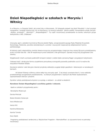 Gmina Moryń Dzień Niepodległości w szkołach w Moryniu i Witnicy A w Moryniu, w Zespole Szkół, jak przed laty w Warszawie, 10 listopada pojawił się Józef Piłsudski! I choć przybył niezgodnie z prawdą historyczną, bo na Kasztance, to emocje wzbudził równie wielkie. Komendanta witały okrzyki: „Wodzu, prowadź!", „Wolność!", „Niepodległość!". Tę część inscenizacji przedstawiła na boisku szkolnym grupa woltyżerska z UKS „Podkowa”. Uroczysty apel z udziałem burmistrza Morynia Józefa Piątka, wiceprzewodniczącego Rady Miejskiej Krzysztofa Koneckiego, Rodziców, pocztów sztandarowych, uczniów i nauczycieli rozpoczął się odśpiewaniem hymnu państwowego. W dalszej części obejrzeliśmy montaż słowno-muzyczny przypominający tragiczne losy naszej Ojczyzny przedstawiony przez uczniów klas IIIa i IIIb SP wspieranych przez koleżanki z IIIA gimnazjum. Oprawę muzyczną przygotował chór szkolny. Wyjątkowość chwili uczniowie podkreślili strojami (ułożyli z siebie biało-czerwoną flagę) i przypiętymi kotylionami. Ciekawa treść i atrakcyjna forma uzupełnione pomysłową scenografią pozwoliły podniośle uczcić to ważne dla wszystkich Polaków Święto. Korytarze szkolne i sale lekcyjne również przybrały odświętny wygląd dzięki gazetkom i dekoracjom w narodowych barwach. W Szkole Filialnej w Witnicy także odbył się uroczysty apel. Z tej okazji uczniowie klas II, I oraz oddziału przedszkolnego przygotowali przedstawienie, na którym przypomnieli o ważnych dla Polski wydarzeniach, zaprezentowali wiersze i piosenki. Dyrektor szkoły podziękował artystom za występ, a widowni - za udział w akademii. Narodowe Święto Niepodległości uczciliśmy godnie i ciekawie. Apele w szkołach przygotowały panie : Benedykta Mularczyk Dorota Pietrzak Beata Dziedzic-Szewczyk Ilona Włodarczyk Iwona Hirt Karolina Bielawska Kamila Tomala Ewa Ziętek Pragniemy podziękować serdecznie p. Wojciechowi Fragstein – Niemsdorffowi za użyczenie konia na potrzeby inscenizacji. 1 Gmina Moryń 2
