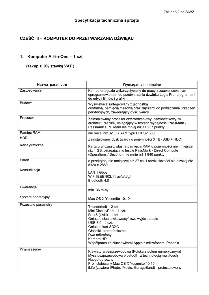 Zał. nr 6.2 do SIWZ Specyfikacja techniczna sprzętu CZEŚĆ II – KOMPUTER DO PRZETWARZANIA DŹWIĘKU 1. Komputer All-in-One – 1 szt. (zakup z 0% stawką VAT ) Nazwa parametru Wymagania minimalne Zastosowanie Komputer będzie wykorzystywany do pracy z zaawansowanym oprogramowaniem do przetwarzania dźwięku Logic Pro, programami do edycji filmów i grafiki Budowa Wyświetlacz zintegrowany z jednostką centralną, pamięcią masową oraz złączami do podłączania urządzeń peryferyjnych, zawierający dysk twardy Procesor Zainstalowany procesor czterordzeniowy, ośmiowątkowy, w architekturze x86, osiągający w testach wydajności PassMark Passmark CPU Mark nie mniej niż 11 237 punkty Pamięć RAM nie mniej niż 32 GB RAM typu DDR3-1600 HDD Zainstalowany dysk twardy o pojemności 3 TB (SSD + HDD) Karta graficzna Karta graficzna z własną pamięcią RAM o pojemności nie mniejszej niż 4 GB, osiągająca w teście PassMark - Direct Compute (Operations / Second), nie mnie niż 1 940 punkty Ekran o przekątnej nie mniejszej niż 27 cali i rozdzielczości nie niższej niż 5120 x 2880 Komunikacja Gwarancja System operacyjny Pozostałe parametry Wyposażenie LAN 1 Gbps WiFi IEEE 802.11 ac/a/b/g/n Bluetooth 4.0 min. 36 m-cy Mac OS X Yosemite 10.10 Thunderbolt – 2 szt. Mini DisplayPort – 1 szt. RJ-45 (LAN) - 1 szt. Gniazdo słuchawkowe/cyfrowe wyjście audio USB 3.0 - 4 szt. Gniazdo kart SDXC Głośniki stereofoniczne Dwa mikrofony Kamera HD Współpraca ze słuchawkami Apple z mikrofonem iPhone’a Klawiatura bezprzewodowa (Polska z polem numerycznym) Mysz bezprzewodowa bluetooth z technologią multitouch Napęd optyczny Preinstalowany Mac OS X Yosemite 10.10 iLife (zawiera iPhoto, iMovie, GarageBand) - preinstalowany Dodatkowe oprogramowanie Zainstalowany i uruchomiony Apple Logic Pro X (licencja, nośnik z kopią programu) Urządzenia powinny być produktem wysokiej jakości, fabrycznie nowe z bieżącej produkcji, wolne od wad materiałowych i prawnych, pochodzące z oficjalnego kanału dystrybucji zgodnie z wymaganiami ich odpowiednich producentów. Zamawiający wymaga, aby dostarczone oprogramowanie było oprogramowaniem w wersji aktualnej (opublikowanej przez producenta). Urządzenia powinny być oznakowane w taki sposób, aby możliwa była identyfikacja zarówno produktu i producenta. Dostarczone urządzenia muszą zawierać wszystkie niezbędne elementy umożliwiające rozpoczęcie pracy takie jak oprogramowanie, sterowniki, kable, itp. Urządzenia muszą spełniać wymagania wynikające z przepisów bezpieczeństwa i higieny pracy oraz wymagania i normy określone w opisach technicznych. Wszelkie wymagania techniczne dotyczące przedmiotu zamówienia należy traktować jako minimalne graniczne, brak możliwości spełnienia przez proponowaną aparaturę lub oprogramowanie któregokolwiek z wymienionych parametrów, wyklucza je z dalszej oceny. Przedmiot zamówienia powinien być dostarczony i rozładowany przez dostawcę do siedziby Zamawiającego: Akademia Muzyczna im. I.J. Paderewskiego , ul. Św. Marcin 87, 61-808 Poznań. W celu potwierdzenia, że oferowany sprzęt odpowiada wymaganiom określonym przez Zamawiającego, Zamawiający wymaga dołączenia do oferty szczegółowego opisu technicznego oferowanego sprzętu i oprogramowania. Opis powinien zawierać, co najmniej nazwę, typ, model/wersję, specyfikację techniczną oferowanego przez Wykonawcę przedmiotu zamówienia.