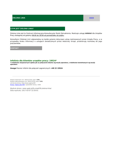 ZIELONA LINIA WWW CZYM JEST ZIELONA LINIA? Zielona Linia jest to Centrum Informacyjno-Konsultacyjne Służb Zatrudnienia. Realizuje usługę infolinii dla Urzędów Pracy dostępnej od godziny 08:00 do 18:00 od poniedziałku do piątku. Konsultanci Zielonej Linii odpowiedzą na każde pytanie dotyczące usług realizowanych przez Urzędy Pracy, a w przypadku braku informacji o usługach świadczonych przez właściwy Urząd, przekierują rozmowę do jego pracowników. KONTAKT Infolinia dla klientów urzędów pracy: 19524* *z telefonów stacjonarnych opłata jak za połączenie lokalne wg taryfy operatora, z telefonów komórkowych wg taryfy operatora Uwaga! Numer infolinii dla połączeń zagranicznych +48 22 19524 Artykuł utworzono: dn. 2016-10-28, autor: CMS. Artykuł zaktualizowano: dn. 2016-10-28, autor: CMS. Link do tej strony: http://www.uppk.pl/30 Drukuj, Zapisz jako PDF, wyświetleń strony: 1538 Wydruk strony: www.uppk.pl/6,urzad/30,zielona-linia/ Data wydruku: 2017-03-07 22:50:01