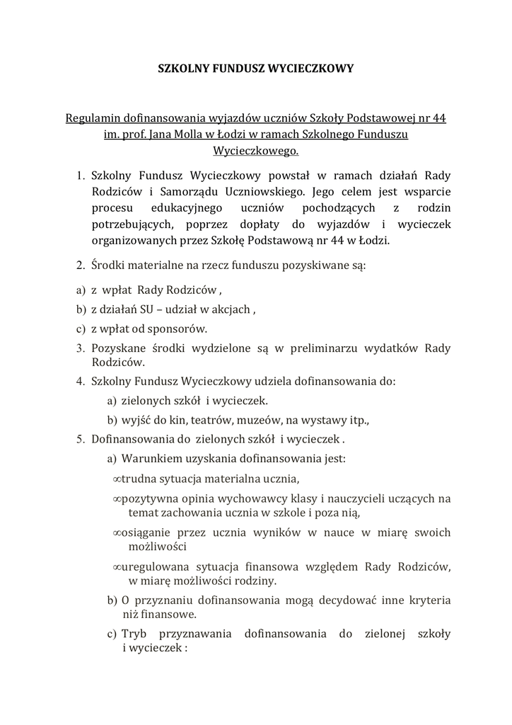 SZKOLNY FUNDUSZ WYCIECZKOWY Regulamin dofinansowania wyjazdów uczniów Szkoły Podstawowej nr 44 im. prof. Jana Molla w Łodzi w ramach Szkolnego Funduszu Wycieczkowego. 1. Szkolny Fundusz Wycieczkowy powstał w ramach działań Rady Rodziców i Samorządu Uczniowskiego. Jego celem jest wsparcie procesu edukacyjnego uczniów pochodzących z rodzin potrzebujących, poprzez dopłaty do wyjazdów i wycieczek organizowanych przez Szkołę Podstawową nr 44 w Łodzi. 2. Środki materialne na rzecz funduszu pozyskiwane są: a) z wpłat Rady Rodziców , b) z działań SU – udział w akcjach , c) z wpłat od sponsorów. 3. Pozyskane środki wydzielone są w preliminarzu wydatków Rady Rodziców. 4. Szkolny Fundusz Wycieczkowy udziela dofinansowania do: a) zielonych szkół i wycieczek. b) wyjść do kin, teatrów, muzeów, na wystawy itp., 5. Dofinansowania do zielonych szkół i wycieczek . a) Warunkiem uzyskania dofinansowania jest: • trudna sytuacja materialna ucznia, • pozytywna opinia wychowawcy klasy i nauczycieli uczących na temat zachowania ucznia w szkole i poza nią, • osiąganie przez ucznia wyników w nauce w miarę swoich możliwości • uregulowana sytuacja finansowa względem Rady Rodziców, w miarę możliwości rodziny. b) O przyznaniu dofinansowania mogą decydować inne kryteria niż finansowe. c) Tryb przyznawania i wycieczek : dofinansowania do zielonej szkoły • rodzic ucznia spełniającego określone warunki zawarte w punkcie 5a lub 5b składa do wychowawcy pisemny wniosek z prośbą o wsparcie, ( wg załączonego wzoru), d) Wniosek rozpatrzony zostaje przez komisję w składzie: dyrektor, wychowawca i pedagog szkolny. e) Przyznana przez komisję kwota jest wpłacana bezpośrednio do organizatora wyjazdu. f) Kwota dofinansowania następujących kryteriów: przyznawana jest według • uczeń, którego rodzina osiąga miesięczny dochód na jednego członka do 600 zł netto otrzymuje 80 % kwoty stanowiącej koszt wyjazdu, • uczeń, którego rodzina osiąga miesięczny dochód na jednego członka powyżej 600 zł netto otrzymuje 50 % kwoty stanowiącej koszt wyjazdu, 6. Dofinansowania do wyjść do kin, teatrów, muzeów, na wystawy itp.: a) warunkiem uzyskania dofinansowania jest: • pozytywna opinia wychowawcy klasy b) Tryb przyznawania dofinansowania: • rodzic ucznia spełniającego warunki zawarte w punkcie 6 składa do wychowawcy pisemny wniosek, c) Wniosek rozpatrzony zostaje przez komisję w składzie: wychowawca i pedagog szkolny, d) Przyznana przez komisję kwota jest wpłacana bezpośrednio do organizatora wyjścia. 7. Formy wsparcia na jeden wniosek nie mogą się pokrywać/ sumować. 8. W roku szkolnym można skorzystać z dofinansowania ze SFW maksymalnie dwa razy. 9. Postanowienia końcowe: a) regulamin dofinansowania zatwierdza dyrektor szkoły i Rada Rodziców, b) regulamin wchodzi w życie z dniem zatwierdzenia. Łódź dn. 21.09.2015 r.