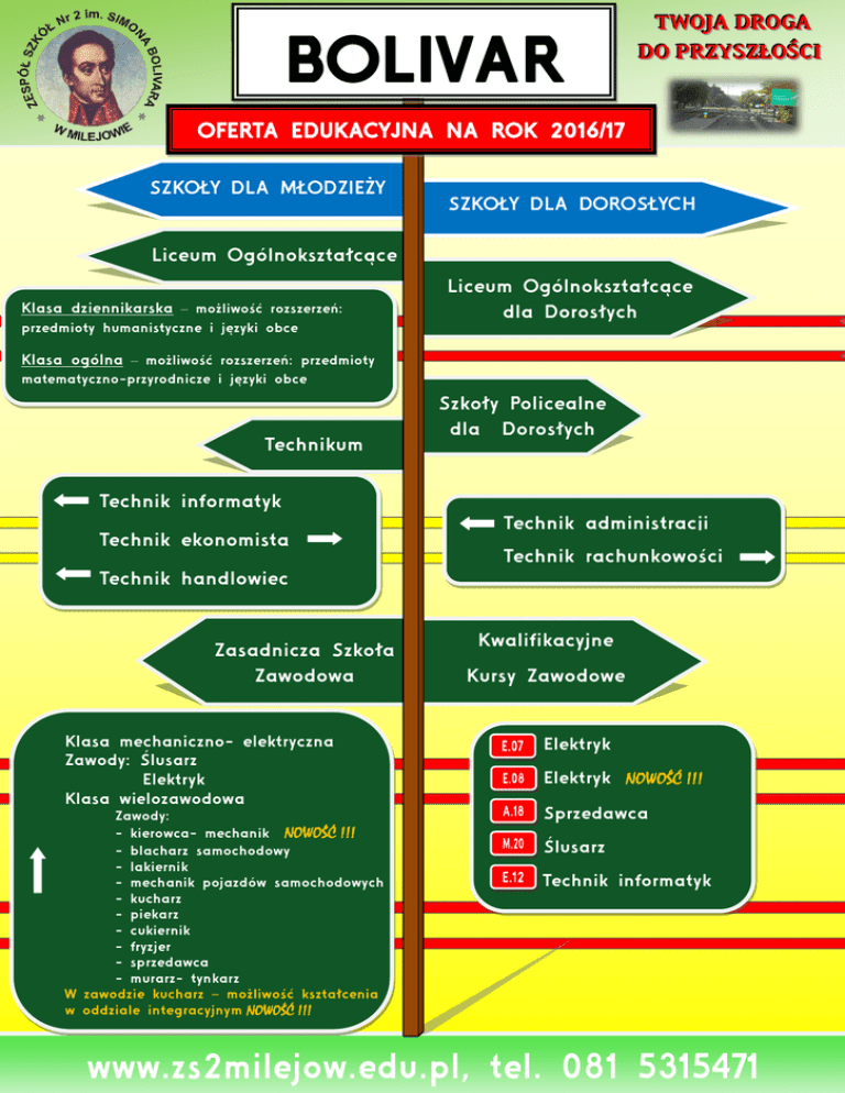 BOLIVAR TTW WO OJJA AD DR RO OGGA A D DO O PPR RZZY YSSZZŁŁO OŚŚCCII OFERTA EDUKACYJNA NA ROK 2016/17 SZKOŁY DLA MŁODZIEŻY SZKOŁY DLA DOROSŁYCH Liceum Ogólnokształcące Klasa dziennikarska – możliwość rozszerzeń: Klasa dziennikarska przedmioty humanistyczne i języki obce Liceum Ogólnokształcące dla Dorosłych Klasaddziennikarskadziennikarska ogólna – możliwość rozszerzeń: przedmioty matematyczno-przyrodnicze i języki obce Technikum Szkoły Policealne dla Dorosłych Technik informatyk Technik ekonomista Technik administracji Technik rachunkowości Technik handlowiec Zasadnicza Szkoła Zawodowa Klasa mechaniczno- elektryczna Zawody: Ślusarz Elektryk Klasa wielozawodowa Zawody: - kierowca- mechanik NOWOŚĆ !!! - blacharz samochodowy - lakiernik - mechanik pojazdów samochodowych - kucharz - piekarz - cukiernik - fryzjer - sprzedawca - murarz- tynkarz W zawodzie kucharz – możliwość kształcenia w oddziale integracyjnym NOWOŚĆ !!! Kwalifikacyjne Kursy Zawodowe Elektryk Elektryk NOWOŚĆ !!! Sprzedawca Ślusarz Technik informatyk