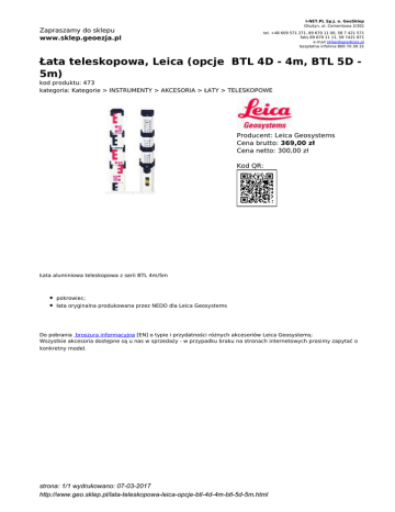 Zapraszamy do sklepu www.sklep.geoezja.pl I-NET.PL Sp.J. o. GeoSklep Olsztyn, ul. Cementowa 3/301 tel. +48 609 571 271, 89 670 11 00, 58 7 421 571 faks 89 670 11 11, 58 7421 871 e-mail [email protected] bezpłatna infolinia 800 70 30 31 Łata teleskopowa, Leica (opcje BTL 4D - 4m, BTL 5D 5m) kod produktu: 473 kategoria: Kategorie > INSTRUMENTY > AKCESORIA > ŁATY > TELESKOPOWE Producent: Leica Geosystems Cena brutto: 369,00 zł Cena netto: 300,00 zł Kod QR: Łata aluminiowa teleskopowa z serii BTL 4m/5m pokrowiec; łata oryginalna produkowana przez NEDO dla Leica Geosystems Do pobrania broszura informacyjna [EN] o typie i przydatności różnych akcesoriów Leica Geosystems; Wszystkie akcesoria dostępne są u nas w sprzedaży - w przypadku braku na stronach internetowych prosimy zapytać o konkretny model. strona: 1/1 wydrukowano: 07-03-2017 http://www.geo.sklep.pl/lata-teleskopowa-leica-opcje-btl-4d-4m-btl-5d-5m.html