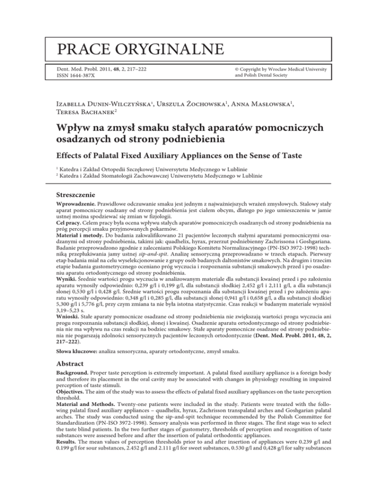 PRACE oryginalne Dent. Med. Probl. 2011, 48, 2, 217–222 ISSN 1644-387X © Copyright by Wroclaw Medical University and Polish Dental Society Izabella Dunin-Wilczyńska1, Urszula Żochowska1, Anna Masłowska1, Teresa Bachanek2 Wpływ na zmysł smaku stałych aparatów pomocniczych osadzanych od strony podniebienia Effects of Palatal Fixed Auxiliary Appliances on the Sense of Taste 1 2 Katedra i Zakład Ortopedii Szczękowej Uniwersytetu Medycznego w Lublinie Katedra i Zakład Stomatologii Zachowawczej Uniwersytetu Medycznego w Lublinie Streszczenie Wprowadzenie. Prawidłowe odczuwanie smaku jest jednym z najważniejszych wrażeń zmysłowych. Stalowy stały aparat pomocniczy osadzany od strony podniebienia jest ciałem obcym, dlatego po jego umieszczeniu w jamie ustnej można spodziewać się zmian w fizjologii. Cel pracy. Celem pracy była ocena wpływu stałych aparatów pomocniczych osadzanych od strony podniebienia na próg percepcji smaku przyjmowanych pokarmów. Materiał i metody. Do badania zakwalifikowano 21 pacjentów leczonych stałymi aparatami pomocniczymi osadzanymi od strony podniebienia, takimi jak: quadhelix, hyrax, przerzut podniebienny Zachrissona i Goshgariana. Badanie przeprowadzono zgodnie z zaleceniami Polskiego Komitetu Normalizacyjnego (PN-ISO 3972-1998) techniką przepłukiwania jamy ustnej sip-and-spit. Analizę sensoryczną przeprowadzano w trzech etapach. Pierwszy etap badania miał na celu wyselekcjonowanie z grupy osób badanych daltonistów smakowych. Na drugim i trzecim etapie badania gustometrycznego oceniano próg wyczucia i rozpoznania substancji smakowych przed i po osadzeniu aparatu ortodontycznego od strony podniebienia. Wyniki. Średnie wartości progu wyczucia w analizowanym materiale dla substancji kwaśnej przed i po założeniu aparatu wynosiły odpowiednio: 0,239 g/l i 0,199 g/l, dla substancji słodkiej 2,452 g/l i 2,111 g/l, a dla substancji słonej 0,530 g/l i 0,428 g/l. Średnie wartości progu rozpoznania dla substancji kwaśnej przed i po założeniu aparatu wynosiły odpowiednio: 0,348 g/l i 0,285 g/l, dla substancji słonej 0,941 g/l i 0,658 g/l, a dla substancji słodkiej 5,300 g/l i 5,776 g/l, przy czym zmiana ta nie była istotna statystycznie. Czas reakcji w badanym materiale wyniósł 3,19–5,23 s. Wnioski. Stałe aparaty pomocnicze osadzane od strony podniebienia nie zwiększają wartości progu wyczucia ani progu rozpoznania substancji słodkiej, słonej i kwaśnej. Osadzenie aparatu ortodontycznego od strony podniebienia nie ma wpływu na czas reakcji na bodziec smakowy. Stałe aparaty pomocnicze osadzane od strony podniebienia nie pogarszają zdolności sensorycznych pacjentów leczonych ortodontycznie (Dent. Med. Probl. 2011, 48, 2, 217–222). Słowa kluczowe: analiza sensoryczna, aparaty ortodontyczne, zmysł smaku. Abstract Background. Proper taste perception is extremely important. A palatal fixed auxiliary appliance is a foreign body and therefore its placement in the oral cavity may be associated with changes in physiology resulting in impaired perception of taste stimuli. Objectives. The aim of the study was to assess the effects of palatal fixed auxiliary appliances on the taste perception threshold. Material and Methods. Twenty-one patients were included in the study. Patients were treated with the following palatal fixed auxiliary appliances – quadhelix, hyrax, Zachrisson transpalatal arches and Goshgarian palatal arches. The study was conducted using the sip-and-spit technique recommended by the Polish Committee for Standardization (PN-ISO 3972-1998). Sensory analysis was performed in three stages. The first stage was to select the taste blind patients. In the two further stages of gustometry, thresholds of perception and recognition of taste substances were assessed before and after the insertion of palatal orthodontic appliances. Results. The mean values of perception thresholds prior to and after insertion of appliances were 0.239 g/l and 0.199 g/l for sour substances, 2.452 g/l and 2.111 g/l for sweet substances, 0.530 g/l and 0,428 g/l for salty substances 218 I. Dunin-Wilczyńska et al. retrospectively. The mean values of recognition thresholds for sour substances before and after the placement of orthodontic appliances were 0.348 g/l and 0.285 g/l, for salty 0.941 g/l and 0.658 g/l, for sweet substances 5.300 g/l and 5.776 g/l retrospectively, however the increase was not statistically significant. The mean reaction time ranged from 3.19 to 5.23 sec. Conclusions. Palatal fixed auxiliary appliances do not cause a statistically significant increase in thresholds of perception and recognition of sweet, salty and sour substances nor affect significantly the reaction time to a taste stimulus. Hence, the orthodontic appliances assessed were not found to deteriorate the sensory capacities (Dent. Med. Probl. 2011, 48, 2, 217–222). Key words: sensory analysis, orthodontic appliances, sense of taste. Prawidłowe odczuwanie smaku, jako jedno z najważniejszych wrażeń zmysłowych, przyczynia się w znacznym stopniu do dobrego samopoczucia człowieka, zarówno w sensie fizycznym, jak i psychicznym, co jest warunkiem zdrowia – jak podaje definicja WHO [1]. Z badań Bernebé et al. [2] wynika, że pacjenci leczeni ortodontycznie zgłaszają utrudnienia w przyjmowaniu pokarmów. Umieszczenie aparatu ortodontycznego w jamie ustnej może zaburzać funkcjonowanie zmysłu smaku [3]. Wynika to z faktu, że jest on ciałem obcym umieszczanym w jamie ustnej właściwej, w obszarze wrażliwym zarówno pod względem fizycznym, jak i psychicznym [4]. Z klinicznego punktu widzenia interesujące wydaje się określenie zależności między użytkowaniem tych aparatów a fizjologią zmysłu smaku, tak istotną w codziennym życiu pacjentów. Celem pracy była ocena wpływu stałych aparatów pomocniczych osadzanych od strony podniebienia na próg percepcji smaku przyjmowanych pokarmów. Materiał i metody liczba badanych osób 