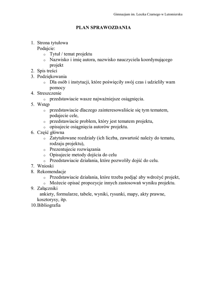 Gimnazjum im. Leszka Czarnego w Lutomiersku PLAN SPRAWOZDANIA 1. Strona tytułowa Podajcie: o Tytuł / temat projektu o Nazwisko i imię autora, nazwisko nauczyciela koordynującego projekt 2. Spis treści 3. Podziękowania o Dla osób i instytucji, które poświęciły swój czas i udzieliły wam pomocy 4. Streszczenie o przedstawiacie wasze najważniejsze osiągnięcia. 5. Wstęp o przedstawiacie dlaczego zainteresowaliście się tym tematem, podajecie cele, o przedstawiacie problem, który jest tematem projektu, o opisujecie osiągnięcia autorów projektu. 6. Część główna o Zatytułowane rozdziały (ich liczba, zawartość należy do tematu, rodzaju projektu), o Prezentujecie rozwiązania o Opisujecie metody dojścia do celu o Przedstawiacie działania, które pozwoliły dojść do celu. 7. Wnioski 8. Rekomendacje o Przedstawiacie działania, które trzeba podjąć aby wdrożyć projekt, o Możecie opisać propozycje innych zastosowań wyniku projektu. 9. Załączniki ankiety, formularze, tabele, wyniki, rysunki, mapy, akty prawne, kosztorysy, itp. 10. Bibliografia