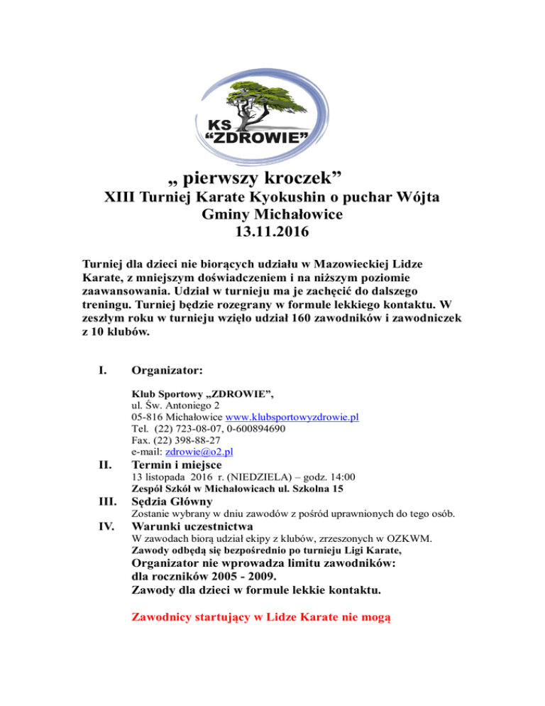 „ pierwszy kroczek” XIII Turniej Karate Kyokushin o puchar Wójta Gminy Michałowice 13.11.2016 Turniej dla dzieci nie biorących udziału w Mazowieckiej Lidze Karate, z mniejszym doświadczeniem i na niższym poziomie zaawansowania. Udział w turnieju ma je zachęcić do dalszego treningu. Turniej będzie rozegrany w formule lekkiego kontaktu. W zeszłym roku w turnieju wzięło udział 160 zawodników i zawodniczek z 10 klubów. I. Organizator: Klub Sportowy „ZDROWIE”, ul. Św. Antoniego 2 05-816 Michałowice www.klubsportowyzdrowie.pl Tel. (22) 723-08-07, 0-600894690 Fax. (22) 398-88-27 e-mail: [email protected] II. Termin i miejsce 13 listopada 2016 r. (NIEDZIELA) – godz. 14:00 Zespół Szkół w Michałowicach ul. Szkolna 15 III. Sędzia Główny Zostanie wybrany w dniu zawodów z pośród uprawnionych do tego osób. IV. Warunki uczestnictwa W zawodach biorą udział ekipy z klubów, zrzeszonych w OZKWM. Zawody odbędą się bezpośrednio po turnieju Ligi Karate, Organizator nie wprowadza limitu zawodników: dla roczników 2005 - 2009. Zawody dla dzieci w formule lekkie kontaktu. Zawodnicy startujący w Lidze Karate nie mogą brać udziału w turnieju. Do startu dopuszczeni zostają zawodnicy posiadający: dokument tożsamości ze zdjęciem potwierdzający wiek zawodnika, zgoda rodziców (opiekunów prawnych) na udział w zawodach, czyste białe karate- gi. Zawody rozegramy na 3 matach. Niezbędne jest, aby kluby wydelegowały odpowiednią liczbę sędziów. Razem ze zgłoszeniem proszę wysłać kandydatury sędziów!! Prosimy o zgłoszenie ekip na załączniku Excel w terminie do 10.XI. 2016 V. Zawody rozegrane będą w następujących kategoriach: 1. Konkurencja i przepisy Konkurencja kumite rozegrana zostanie systemem pucharowym w formule „lekkiego kontaktu” Konkurencja KATA: a) DOBÓR ZAWODNIKÓW: - w zawodach mogą wziąć udział zawodnicy z klubów zrzeszonych w OZKWM - każdy klub może zgłosić dowolną liczbę zawodników - nie ma limitu stopni b) WARUNKI UCZESTNICTWA: - dokument tożsamości ze zdjęciem potwierdzający wiek zawodnika - zgoda rodziców na start według załączonego wzoru c) KATEGORIE KUMITE: o przydziale do kategorii decyduje rok urodzenia, chłopcy i dziewczynki oddzielnie: - 11 lat (rocznik 2005) - 10 lat (rocznik 2006) - 9 lat (rocznik 2007) - 8 lat (rocznik 2008) - 7 lat (rocznik 2009) Kategorie wagowe: - chłopcy 2005 4 kat. wagowe - chłopcy 2006 4 kat. wagowe - chłopcy 2007 5 kat . wagowych - chłopcy 2008 4 kat. wagowe - chłopcy 2009 4 kat. wagowe - dziewczynki 2005 3 kat. wagowe - dziewczynki 2006 3 kat. wagowe - dziewczynki 2007 3 kat. wagowe - dziewczynki 2008 i 2009 3 kat. wagowe Uwaga !!! Podane kategorie wagowe mogą ulec zmianie. Organizator nie podaje szczegółowego podziału wagowego jak w turnieju Mazowieckiej Ligi Karate, aby podziały elastycznie dopasować do zgłoszonych zawodników. Dopiero po otrzymanym zgłoszeni w każdym przedziale rocznikowym dokonamy weryfikacji podziału na kategorie wagowe. Prosimy o podanie dokładnej wagi zawodnika . Konkurencja KATA: a. Kata indywidualnie dziewczynki i chłopcy rocznik 2007. b. Kata indywidualnie dziewczynki i chłopcy rocznik 2008. c. Kata indywidualnie dziewczynki i chłopcy rocznik 2009. d) PRZEPISY KONKURENCJI KUMITE Konkurencja kumite rozegrana zostanie systemem pucharowym w formule „lekkiego kontaktu” ZABRONIONE JEST STOSOWANIE PEŁNEJ SIŁY KOPNIĘĆ I UDERZEŃ!!! Na strefę jodan dozwolone będą kopnięcia: mawashi-geri, uchi-geri, kake geri Na strefę chudan dozwolone będą wszystkie techniki ręczne i nożne stosowane w karate kyokushin. Na strefę gedan dozwolone jest stosowanie techniki mawashi geri – z kontrolowaną siłą. Walka będzie oceniana za pomocą liczników trafień. PUNKTACJA: Punkty naliczane bez przerywania walki: 1 pkt - chudan tsuki, gedan geri 2 pkt - chudan geri Punkty naliczane po przerwaniu walki na podstawie głosowania sędziów: 5 pkt, - jodan geri, drugie zaliczone jodan geri kończy walkę przed czasem KARY: Za zbyt mocne wykonanie przepisowej techniki w dozwoloną do atakowania strefę lub atak na strefy zakazane zawodnik może zostać ukarany lub zdyskwalifikowany. Sędzia nie udziela upomnień słownych bez przyznania ostrzeżenia lub kary. Kary nadawane są kolejno: - ostrzeżenie bez straty punktu – chui-ichi - ostrzeżenie bez straty punktu – chui-ni - kara – 5 pkt. – genten-ichi - kara - genten-ni, równoznaczna z shikaku, dyskwalifikacja W szczególnej sytuacji rażącego naruszenia przepisów skład sędziowski, po naradzie może przyznać karę genten-ichi lub shikaku bez wcześniejszych ostrzeżeń. . Zawodnicy podczas walki są chronieni przez ochraniacze wg poniższej tabeli: Kategoria obowiązkowe ochraniacze osobiste obowiązkowe ochraniacze zapewniane przez organizatora ochraniacze zalecane nieobowiązkowe Lekki kontakt - białe ochraniacze goleństopa, - piąstkówki - mężczyźni-suspensorium, - ochraniacz tułowia hogo, - kask z ochroną twarzy (kratą) - miękkie ochraniacze na kolana, - dziewczętasuspensorium Organizator nie zapewnia obowiązkowych osobistych ochraniaczy. Obowiązkiem zawodnika jest stawienie się do walki w regulaminowy czasie 1 minuty w komplecie ochraniaczy. e. KONKURENCJI KATA Konkurencje Kata rozegrane zostaną zgodnie z przepisami PZK (tablice punktowe) KATEGORIA I TURA II TURA DZIECI TAIKYOKU SONO ICHI TAIKYOKU SONO NI VII. Opłata startowa. Uczestnicy turnieju wnoszą opłatę startową w wysokości 20 zł. płatna w dniu zawodów przez opiekuna . (za całą drużynę). VIII. Nagrody Za pierwsze, drugie i trzecie miejsce w kumie i kata zawodnicy otrzymują puchar i dyplom. IX. Zgłoszenie Zgłoszenia zawodników należy przesłać NAJPÓŹNIEJ do dnia 10.XI. br. Na adrese-mail: [email protected] W razie pytań i wątpliwości prosimy o kontakt: Jarosław Gajek 22723-08-07, 600894690 Przypominamy o załączniku Excel ! Losowanie odbędzie się 11.XI. br. na podstawie zg