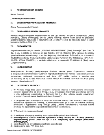 I. POSTANOWIENIA OGÓLNE Nazwa Promocji „Jesienne przyspieszenie” II. OBSZAR PRZEPROWADZENIA PROMOCJI Obszar Rzeczypospolitej Polskiej. III. CHARAKTER PRAWNY PROMOCJI Promocja objęta niniejszym Regulaminem nie jest „grą losową”, w tym w szczególności „loterią pieniężną”, „loterią promocyjną”, ani też „loterią fantową”, których wynik zależy od przypadku (przeprowadzenia losowania) w rozumieniu art. 2 ustawy z dnia 19 listopada 2009r. o grach hazardowych (Dz.U.2016.471). IV. ORGANIZATOR Organizatorem Promocji o nazwie: „JESIENNE PRZYSPIESZENIE" (dalej „Promocja”) jest Orlen Oil Sp. z o.o. z siedzibą w Krakowie 31-323 Kraków, przy ul. Opolskiej 114, wpisana do rejestru przedsiębiorców prowadzonego przez Sąd Rejonowy dla Krakowa - Śródmieścia, w Krakowie XI Wydział Gospodarczy Krajowego Rejestru Sądowego pod numerem KRS 0000102722 NIP 675-1190-702, REGON 351492391, o kapitale zakładowym w wysokości 75 093 000 zł (dalej zwana „Organizatorem”). V. KOORDYNATOR Koordynatorem Promocji podejmującym działania zlecone przez Organizatora związane z przeprowadzeniem Promocji i wydaniem nagród jest Przemysław Kamola i Wojciech Koprowski prowadzący działalność gospodarczą pod firmą „G3” spółka cywilna z siedzibą przy ul. Gilarskiej 86 D, 03-589 Warszawa, numer REGON 015604203, NIP 952-193-29-00 (dalej zwanym „Koordynatorem”) VI. UCZESTNICY PROMOCJI 1. W Promocji mogą brać udział wyłącznie hurtownie olejowe i motoryzacyjne dokonujące zakupów bezpośrednio od Orlen Oil sp. z o.o., prowadzący działalność gospodarczą zarówno w dniu zgłoszenia uczestnictwa w Promocji, jak i w dniu odbioru nagród przyznanych w ramach Promocji (zwani dalej Uczestnikami Promocji). 2. W przypadku gdy przedsiębiorca nabył na podstawie faktury VAT Produkty Promocyjne i dokonał ich zgłoszenia w Promocji, a jednocześnie łączy go z Orlen Oil Umowa sprzedaży produktów i wyposażenia stacji obsługi (dalej „Umowa warsztatowa”), wówczas nabyte produkty nie są zaliczane na poczet realizacji umowy warsztatowej. 3. W Promocji nie mogą uczestniczyć: a) Przedsiębiorcy kupujący produkty promocyjne nie bezpośrednio w Orlen Oil, b) przedsiębiorcy, którzy dokonali zgłoszenia danej faktury VAT w innej promocji organizowanej przez Orlen Oil sp. z o.o. dotyczącej tych samych produktów promocyjnych, c) osoby fizyczne nie prowadzące działalności gospodarczej, d) stacje własne paliw PKN Orlen S.A., Regulamin promocji „JESIENNE PRZYSPIESZENIE” e) pracownicy Orlen Oil sp. z o.o. oraz członkowie ich rodzin. Za członków rodziny uważa się współmałżonków, rodzeństwo, małżonków rodzeństwa, zstępnych, wstępnych, kuzynów oraz osoby pozostające w stosunku przysposobienia. VII. PRODUKTY OBJĘTE PROMOCJĄ Promocja pod nazwą „PRZYSPIESZAMY Z MAXEXPERTEM - BECZKA” dotyczy olejów wymienionych w Tabeli nr 1, zwanych dalej Produktami Promocyjnymi. Tabela nr 1 PRODUKTY PROMOCYJNE NAZWA OPAKOWANIE PLATINUM MAXEXPERT XF 5W-30 PLATINUM MAXEXPERT XF 5W-30 PLATINUM MAXEXPERT F 5W-30 PLATINUM MAXEXPERT F 5W-30 PLATINUM MAXEXPERT XD 5W-30 PLATINUM MAXEXPERT XD 5W-30 PLATINUM MAXEXPERT V 5W-30 PLATINUM MAXEXPERT V 5W-30 PLATINUM MAXEXPERT XJ 5W-30 PLATINUM MAXEXPERT XJ 5W-30 PLATINUM MAXEXPERT FT 5W-30 PLATINUM MAXEXPERT FT 5W-30 PLATINUM MAXEXPERT C3 5W-40 PLATINUM MAXEXPERT C3 5W-40 PLATINUM MAXEXPERT C4 5W-30 PLATINUM MAXEXPERT C4 5W-30 PLATINUM MAXEXPERT A3/B4 10W-40 PLATINUM MAXEXPERT A3/B4 10W-40 kanister 60L beczka 205L kanister 60L beczka 205L kanister 60L beczka 205L kanister 60L beczka 205L kanister 60L beczka 205L kanister 60L beczka 205L kanister 60L beczka 205L kanister 60L beczka 205L kanister 60L beczka 205L VIII. CZAS TRWANIA AKCJI PROMOCYJNEJ Promocja trwa od dnia 14.09.2016r. do dnia 21.10.2016r. lub do wyczerpania puli nagród. IX. ZGŁOSZENIA DO PROMOCJI Zgłoszenia do promocji należy rejestrować niezwłocznie po dokonaniu zakupu na stronie www.orlenoilpromocje.pl, w terminie od dnia 14.09.2016r. do dnia 04.11.2016r. X. CAŁKOWITY CZAS TRWANIA PROMOCJI Całkowity czas trwania Promocji obejmuje: czas rejestracji Uczestników, przyznawanie nagród oraz przekazanie nagród tj. okres od dnia 14.09.2016 r. do dnia 02.12.2016 r. Regulamin promocji „JESIENNE PRZYSPIESZENIE” XI. 1. 2. PRZEDMIOT PROMOCJI Przedmiotem Promocji jest zakup wybranych Produktów Promocyjnych w pakietach na jednej fakturze VAT w czasie trwania akcji promocyjnej zrealizowany wyłącznie w Orlen Oil Sp. z o.o. Zakup Produktów Promocyjnych musi być udokumentowany fakturą VAT. XII. NAGRODY a) Nagrodą w Promocji są Motocykle Junak RS 122 oraz iPhone’y 5S w zależności od rodzaju zakupionego pakietu Produktów Promocyjnych. b) Nagroda Motocykl Junak RS 122 przysługuje za jednorazowy zakup zestawu 8 dowolnych beczek o pojemności 205 L oraz 6 dowolnych beczek o pojemności 60L stanowiących Produkty Promocyjne. c) Nagroda iPhone 5S, 16 GB przysługuje za jednorazowy zakup zestawu 5 dowolnych beczek o pojemności 205 L oraz 3 dowolnych beczek o pojemności 60L stanowiących Produkty Promocyjne. d) Pula nagród jest ograniczona, o kolejności wydania nagrody decyduje kolejność zgłoszenia faktury zakupowej, dotyczącej Produktów Promocyjnych, poprzez elektroniczny formularz na stronie www.orlenoilpromocje.pl. e) Organizator zastrzega sobie prawo do wydania innej nagrody niż wskazane powyżej o podobnej wartości i porównywalnych parametrach. Modele i typy nagród przedstawione w materiałach reklamowych promocji mają charakter wyłącznie poglądowy. f) Decyzję o przyznaniu nagród podejmuje Organizator. Reguły przyznawania nagród określa punkt XIII Regulaminu. XIII. ZASADY UCZESTNICTWA W PROMOCJI I UBIEGANIA SIĘ O NAGRODY 1. Warunkiem ubiegania się przez Uczestnika Promocji o nagrodę jest: a) dokonanie bezpośrednio w Orlen Oil zakupów produktów objętych przedmiotem Promocji - zgodnie z punktem VII niniejszego Regul