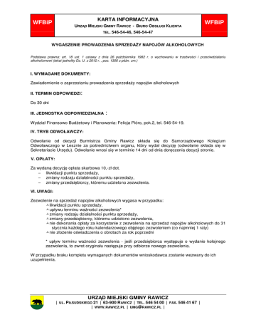 WFBiP KARTA INFORMACYJNA URZĄD MIEJSKI GMINY RAWICZ - BIURO OBSŁUGI KLIENTA WFBiP TEL. 546-54-46, 546-54-47 WYGASZENIE PROWADZENIA SPRZEDAŻY NAPOJÓW ALKOHOLOWYCH Podstawa prawna: art. 18 ust. 1 ustawy z dnia 26 października 1982 r. o wychowaniu w trzeźwości i przeciwdziałaniu alkoholizmowi (tekst jednolity Dz. U. z 2012 r. , poz. 1356 z późn. zm.) I. WYMAGANE DOKUMENTY: Zawiadomienie o zaprzestaniu prowadzenia sprzedaży napojów alkoholowych II. TERMIN ODPOWIEDZI: Do 30 dni III. JEDNOSTKA ODPOWIEDZIALNA : Wydział Finansowo Budżetowy i Planowania: Felicja Pióro, pok.2, tel. 546-54-19. IV. TRYB ODWOŁAWCZY: Odwołanie od decyzji Burmistrza Gminy Rawicz składa się do Samorządowego Kolegium Odwoławczego w Lesznie za pośrednictwem organu, który wydał decyzję (odwołanie składa się w Sekretariacie Urzędu). Odwołanie wnosi się w terminie 14 dni od dnia doręczenia decyzji stronie. V. OPŁATY: Za wydaną decyzję opłata skarbowa 10,-zł dot. − likwidacji punktu sprzedaży, − zmiany rodzaju działalności punktu sprzedaży, − zmiany przedsiębiorcy, któremu udzielono zezwolenia. VI. UWAGI: Zezwolenie na sprzedaż napojów alkoholowych wygasa w przypadku: likwidacji punktu sprzedaży, upływu terminu ważności zezwolenia* zmiany rodzaju działalności punktu sprzedaży, zmiany przedsiębiorcy, któremu udzielono zezwolenia, nie dokonania opłaty za korzystanie z zezwolenia na sprzedaż napojów alkoholowych do 31 stycznia każdego roku kalendarzowego objętego zezwoleniem (co najmniej 1 raty) nie złożenie oświadczenia o obrotach za rok poprzedni * upływ terminu ważności zezwolenia - jeśli przedsiębiorca występuje o wydanie kolejnego zezwolenia, to zwrot oryginału następuje przy odbiorze nowego zezwolenia. W przypadku braku kompletu wymaganych dokumentów wnioskodawca zostanie wezwany do ich uzupełnienia. URZĄD MIEJSKI GMINY RAWICZ | UL. PIŁSUDSKIEGO 21 | 63-900 RAWICZ | TEL. 546 54 00 | FAX. 546 41 67 | | WWW.RAWICZ.PL | [email protected] |