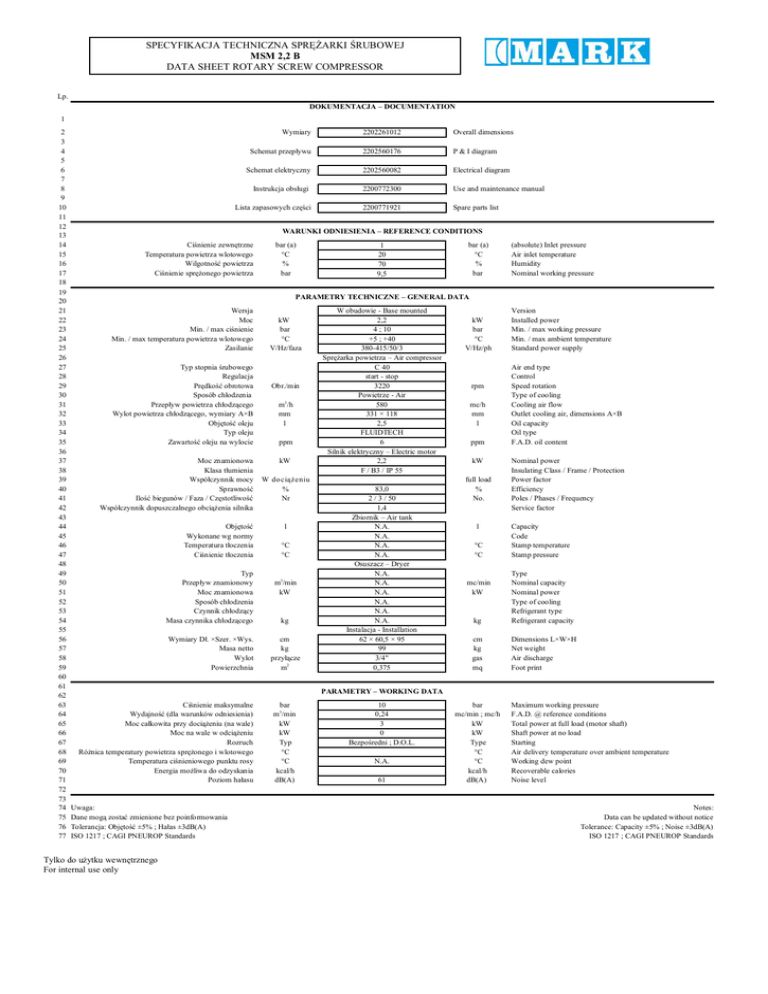 SPECYFIKACJA TECHNICZNA SPR ARKI RUBOWEJ MSM 2,2 B DATA SHEET ROTARY SCREW COMPRESSOR Lp. DOKUMENTACJA – DOCUMENTATION 1 2 3 4 5 6 7 8 9 10 11 12 13 14 15 16 17 18 19 20 21 22 23 24 25 26 27 28 29 30 31 32 33 34 35 36 37 38 39 40 41 42 43 44 45 46 47 48 49 50 51 52 53 54 55 56 57 58 59 60 61 62 63 64 65 66 67 68 69 70 71 72 73 74 75 76 77 Wymiary 2202261012 Overall dimensions Schemat przep ywu 2202560176 P & I diagram Schemat elektryczny 2202560082 Electrical diagram Instrukcja obs ugi 2200772300 Use and maintenance manual 2200771921 Spare parts list Lista zapasowych cz ci WARUNKI ODNIESIENIA – REFERENCE CONDITIONS Ci nienie zewn trzne Temperatura powietrza wlotowego Wilgotno powietrza Ci nienie spr onego powietrza bar (a) °C % bar 1 20 70 9,5 bar (a) °C % bar (absolute) Inlet pressure Air inlet temperature Humidity Nominal working pressure PARAMETRY TECHNICZNE – GENERAL DATA Wersja Moc Min. / max ci nienie Min. / max temperatura powietrza wlotowego Zasilanie Typ stopnia rubowego Regulacja Pr dko obrotowa Sposób ch odzenia Przep yw powietrza ch odz cego Wylot powietrza ch odz cego, wymiary A×B Obj to oleju Typ oleju Zawarto oleju na wylocie Moc znamionowa Klasa t umienia Wspó czynnik mocy Sprawno Ilo biegunów / Faza / Cz stotliwo Wspó czynnik dopuszczalnego obci enia silnika Obj to Wykonane wg normy Temperatura t oczenia Ci nienie t oczenia Typ Przep yw znamionowy Moc znamionowa Sposób ch odzenia Czynnik ch odz cy Masa czynnika ch odz cego Wymiary D . ×Szer. ×Wys. Masa netto Wylot Powierzchnia kW bar °C V/Hz/faza Obr./min 3 m /h mm l ppm kW W doci eniu % Nr l °C °C m3/min kW kg cm kg przy cze m2 W obudowie - Base mounted 2,2 4 ; 10 +5 ; +40 380-415/50/3 Spr arka powietrza – Air compressor C 40 start - stop 3220 Powietrze - Air 580 331 × 118 2,5 FLUIDTECH 6 Silnik elektryczny – Electric motor 2,2 F / B3 / IP 55 83,0 2 / 3 / 50 1,4 Zbiornik – Air tank N.A. N.A. N.A. N.A. Osuszacz – Dryer N.A. N.A. N.A. N.A. N.A. N.A. Instalacja - Installation 62 × 60,5 × 95 99 3/4" 0,375 kW bar °C V/Hz/ph rpm mc/h mm l ppm kW full load % No. l °C °C Version Installed power Min. / max working pressure Min. / max ambient temperature Standard power supply Air end type Control Speed rotation Type of cooling Cooling air flow Outlet cooling air, dimensions A×B Oil capacity Oil type F.A.D. oil content Nominal power Insulating Class / Frame / Protection Power factor Efficiency Poles / Phases / Frequency Service factor Capacity Code Stamp temperature Stamp pressure kg Type Nominal capacity Nominal power Type of cooling Refrigerant type Refrigerant capacity cm kg gas mq Dimensions L×W×H Net weight Air discharge Foot print mc/min kW PARAMETRY – WORKING DATA Ci nienie maksymalne Wydajno (dla warunków odniesienia) Moc ca kowita przy doci eniu (na wale) Moc na wale w odci eniu Rozruch Ró nica temperatury powietrza spr onego i wlotowego Temperatura ci nieniowego punktu rosy Energia mo liwa do odzyskania Poziom ha asu Uwaga: Dane mog zosta zmienione bez poinformowania Tolerancja: Obj to ±5% ; Ha as ±3dB(A) ISO 1217 ; CAGI PNEUROP Standards Tylko do u ytku wewn trznego For internal use only bar m3/min kW kW Typ °C °C kcal/h dB(A) 10 0,24 3 0 Bezpo redni ; D.O.L. N.A. 61 bar mc/min ; mc/h kW kW Type °C °C kcal/h dB(A) Maximum working pressure F.A.D. @ reference conditions Total power at full load (motor shaft) Shaft power at no load Starting Air delivery temperature over ambient temperature Working dew point Recoverable calories Noise level Notes: Data can be updated without notice Tolerance: Capacity ±5% ; Noise ±3dB(A) ISO 1217 ; CAGI PNEUROP Standards