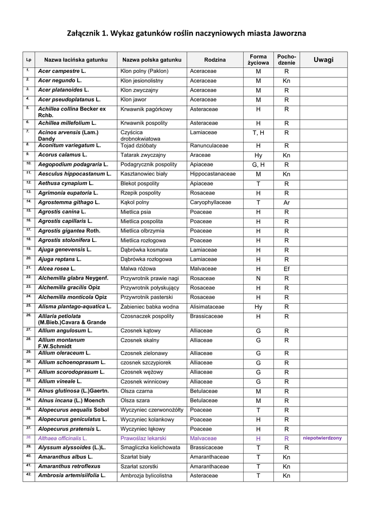 Załącznik 1. Wykaz gatunków roślin naczyniowych