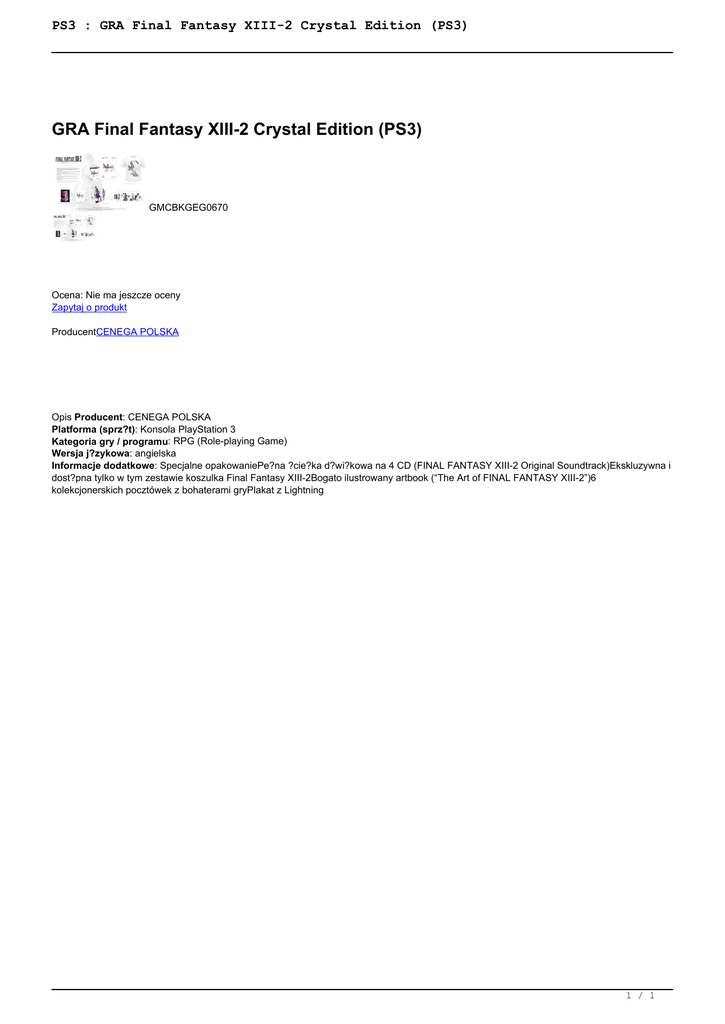 PS3 : GRA Final Fantasy XIII-2 Crystal Edition (PS3) GRA Final Fantasy XIII-2 Crystal Edition (PS3) GMCBKGEG0670 Ocena: Nie ma jeszcze oceny Zapytaj o produkt ProducentCENEGA POLSKA Opis Producent: CENEGA POLSKA Platforma (sprz?t): Konsola PlayStation 3 Kategoria gry / programu: RPG (Role-playing Game) Wersja j?zykowa: angielska Informacje dodatkowe: Specjalne opakowaniePe?na ?cie?ka d?wi?kowa na 4 CD (FINAL FANTASY XIII-2 Original Soundtrack)Ekskluzywna i dost?pna tylko w tym zestawie koszulka Final Fantasy XIII-2Bogato ilustrowany artbook (“The Art of FINAL FANTASY XIII-2”)6 kolekcjonerskich pocztówek z bohaterami gryPlakat z Lightning 1 / 1 Powered by TCPDF (www.tcpdf.org)