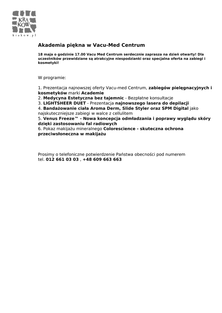 Akademia piękna w Vacu-Med Centrum 18 maja o godzinie 17.00 Vacu Med Centrum serdecznie zaprasza na dzień otwarty! Dla uczestników przewidziane są atrakcyjne niespodzianki oraz specjalna oferta na zabiegi i kosmetyki! W programie: 1. Prezentacja najnowszej oferty Vacu-med Centrum, zabiegów pielęgnacyjnych i kosmetyków marki Academie 2. Medycyna Estetyczna bez tajemnic - Bezpłatne konsultacje 3. LIGHTSHEER DUET - Prezentacja najnowszego lasera do depilacji 4. Bandażowanie ciała Aroma Derm, Slide Styler oraz SPM Digital jako najskuteczniejsze zabiegi w walce z cellulitem 5. Venus Freeze™ - Nowa koncepcja odmładzania i poprawy wyglądu skóry dzięki zastosowaniu fal radiowych 6. Pokaz makijażu mineralnego Colorescience - skuteczna ochrona przeciwsłoneczna w makijażu Prosimy o telefoniczne potwierdzenie Państwa obecności pod numerem tel. 012 661 03 03 , +48 609 663 663 Powered by TCPDF (www.tcpdf.org)