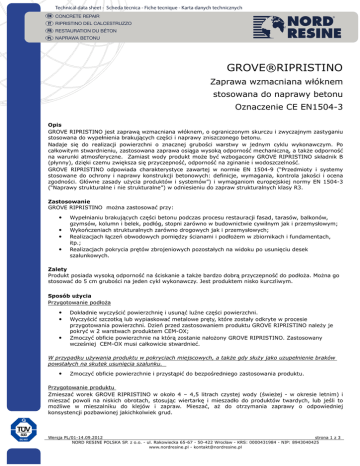 Technical data sheet - Scheda tecnica - Fiche tecnique - Karta danych technicznych CONCRETE REPAIR RIPRISTINO DEL CALCESTRUZZO RESTAURATION DU BÉTON NAPRAWA BETONU GROVE®RIPRISTINO Zaprawa wzmacniana włóknem stosowana do naprawy betonu Oznaczenie CE EN1504-3 Opis GROVE RIPRISTINO jest zaprawą wzmacniana włóknem, o ograniczonym skurczu i zwyczajnym zastyganiu stosowana do wypełnienia brakujących części i naprawy zniszczonego betonu. Nadaje się do realizacji powierzchni o znacznej grubości warstwy w jednym cyklu wykonawczym. Po całkowitym stwardnieniu, zastosowana zaprawa osiąga wysoką odporność mechaniczną, a także odporność na warunki atmosferyczne. Zamiast wody produkt może być wzbogacony GROVE RIPRISTINO składnik B (płynny), dzięki czemu zwiększa się przyczepność, odporność na zginanie i wodoszczelność. GROVE RIPRISTINO odpowiada charakterystyce zawartej w normie EN 1504-9 (“Przedmioty i systemy stosowane do ochrony i naprawy konstrukcji betonowych: definicje, wymagania, kontrola jakości i ocena zgodności. Główne zasady użycia produktów i systemów”) i wymaganiom europejskiej normy EN 1504-3 (“Naprawy strukturalne i nie strukturalne”) w odniesieniu do zapraw strukturalnych klasy R3. Zastosowanie GROVE RIPRISTINO można zastosować przy: • • • • Wypełnianiu brakujących części betonu podczas procesu restauracji fasad, tarasów, balkonów, gzymsów, kolumn i belek, podłóg, stopni zarówno w budownictwie cywilnym jak i przemysłowym; Wykończeniach strukturalnych zarówno drogowych jak i przemysłowych; Realizacjach łączeń obwodowych pomiędzy ścianami i podłożem w zbiornikach i fundamentach, itp.; Realizacjach pokrycia prętów zbrojeniowych pozostałych na widoku po usunięciu desek szalunkowych. Zalety Produkt posiada wysoką odporność na ściskanie a także bardzo dobrą przyczepność do podłoża. Można go stosować do 5 cm grubości na jeden cykl wykonawczy. Jest produktem nisko kurczliwym. Sposób użycia Przygotowanie podłoża • • • Dokładnie wyczyścić powierzchnię i usunąć luźne części powierzchni. Wyczyścić szczotką lub wypiaskować metalowe pręty, które zostały odkryte w procesie przygotowania powierzchni. Dzień przed zastosowaniem produktu GROVE RIPRISTINO należy je pokryć w 2 warstwach produktem CEM-OX; Zmoczyć obficie powierzchnie na którą zostanie nałożony GROVE RIPRISTINO. Zastosowany wcześniej CEM-OX musi całkowicie stwardnieć. W przypadku używania produktu w pokryciach miejscowych, a także gdy służy jako uzupełnienie braków powstałych na skutek usunięcia szalunku. • Zmoczyć obficie powierzchnie i przystąpić do bezpośredniego zastosowania produktu. Przygotowanie produktu Zmieszać worek GROVE RIPRISTINO w około 4 – 4,5 litrach czystej wody (świeżej - w okresie letnim) i mieszać powoli na niskich obrotach, stosując wiertarkę i mieszadło do produktów twardych, lub jeśli to możliwe w mieszalniku do klejów i zapraw. Mieszać, aż do otrzymania zaprawy o odpowiedniej konsystencji pozbawionej jakichkolwiek grud. Wersja PL/01-14.09.2012 strona 1 z 3 NORD RESINE POLSKA SP. z o.o. - ul. Rakowiecka 65-67 - 50-422 Wrocław - KRS: 0000431984 - NIP: 8943040425 www.nordresine.pl - [email protected] Technical data sheet - Scheda tecnica - Fiche tecnique - Karta danych technicznych CONCRETE REPAIR RIPRISTINO DEL CALCESTRUZZO RESTAURATION DU BÉTON NAPRAWA BETONU GROVE®RIPRISTINO Zaprawa wzmacniana włóknem stosowana do naprawy betonu Oznaczenie CE EN1504-3 Nakładanie produktu W miejscach przeznaczonych do wypełnienia stosować produkt kielnią, aż do uzyskania żądanej grubości, która jednak w dwóch warstwach nie może być większa niż 10 cm. Jeśli tylko zaprawa zacznie wiązać przystąpić do zacierania pacą z gąbką. Wykończenie powierzchni Po zakończeniu wypełniania brakujących części, jeśli zachodzi potrzeba wykończenia powierzchnię delikatną drobną warstwą, należy jeden raz zastosować GROVE RASANTE i wykończyć warstwę zacierając pacą z gąbką. Dojrzewanie produktu W okresie letnim obowiązkowo należy zadbać o właściwe twardnienie produktu, zwilżając powierzchnie przez co najmniej 48 godzin od momentu wykonania. Zużycie Chcąc uzyskać warstwę o grubości 1cm należy zastosować około 19 kg produktu na 1 m². Czyszczenie narzędzi • Świeży produkt czyścić za pomocą czystej wody; • Zaschnięty produkt czyścić jedynie mechanicznie. Ostrzeżenia i specjalne zalecenia • Stosować w temperaturze od +5/do +35 °C. • Stosowanie produktu w nieprzyjaznych warunkach atmosferycznych wiąże się z przestrzeganiem zaleceń właściwego utrzymania świeżo wykonanej warstwy. • Nie wykonywać powierzchni poniżej 1 cm grubości. • Gdy produkt zaczyna wiązanie nie można na nowo rozmieszać go dolewając do niego wody. Kolor Produkt dostępny jest w kolorze szarym. Specyfikacja techniczna DANE IDENTYFIKACYJNE PRODUKTU Klasa przynależności według EN 1504-3 Typologia Konsystencja Maksymalna granulometria (ziarnistość) zawartości chlorków rozpuszczalnych w wodzie- wymagane minimum ≤ 0,05%-EN 1015-17 DANE APLIKACYJNE (w 23 °C – 50 % wilgotności względnej) Wodny dodatek Gęstość dojrzałej zaprawy Pot-life, PN EN ISO 9514 Czas schnięcia powierzchniowego, UNI8904 Temperatura stosowania Możliwa grubość jednej warstwy Maksymalna możliwa grubość (w dwóch warstwach) ------mm R3 CC sypka 2,5 % ≤0,05 % 16-18 3 kg/cm min godz. C° mm mm 2.100 60 8±1 Od +5do +35 Od 10 do 50 100 Wersja PL/01-14.09.2012 strona 2 z 3 NORD RESINE POLSKA SP. z o.o. - ul. Rakowiecka 65-67 - 50-422 Wrocław - KRS: 0000431984 - NIP: 8943040425 www.nordresine.pl - [email protected] Technical data sheet - Scheda tecnica - Fiche tecnique - Karta danych technicznych CONCRETE REPAIR RIPRISTINO DEL CALCESTRUZZO RESTAURATION DU BÉTON NAPRAWA BETONU GROVE®RIPRISTINO Zaprawa wzmacniana włóknem stosowana do naprawy betonu O