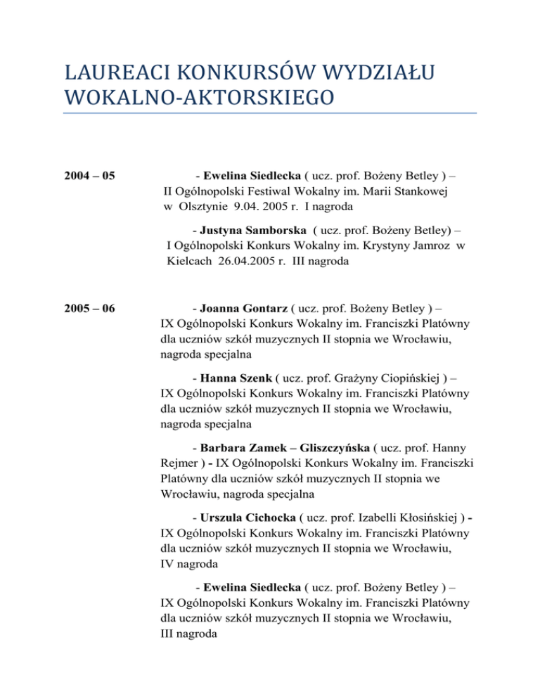 LAUREACI KONKURSÓW WYDZIAŁU WOKALNO-AKTORSKIEGO 2004 – 05 - Ewelina Siedlecka ( ucz. prof. Bożeny Betley ) – II Ogólnopolski Festiwal Wokalny im. Marii Stankowej w Olsztynie 9.04. 2005 r. I nagroda - Justyna Samborska ( ucz. prof. Bożeny Betley) – I Ogólnopolski Konkurs Wokalny im. Krystyny Jamroz w Kielcach 26.04.2005 r. III nagroda 2005 – 06 - Joanna Gontarz ( ucz. prof. Bożeny Betley ) – IX Ogólnopolski Konkurs Wokalny im. Franciszki Platówny dla uczniów szkół muzycznych II stopnia we Wrocławiu, nagroda specjalna - Hanna Szenk ( ucz. prof. Grażyny Ciopińskiej ) – IX Ogólnopolski Konkurs Wokalny im. Franciszki Platówny dla uczniów szkół muzycznych II stopnia we Wrocławiu, nagroda specjalna - Barbara Zamek – Gliszczyńska ( ucz. prof. Hanny Rejmer ) - IX Ogólnopolski Konkurs Wokalny im. Franciszki Platówny dla uczniów szkół muzycznych II stopnia we Wrocławiu, nagroda specjalna - Urszula Cichocka ( ucz. prof. Izabelli Kłosińskiej ) IX Ogólnopolski Konkurs Wokalny im. Franciszki Platówny dla uczniów szkół muzycznych II stopnia we Wrocławiu, IV nagroda - Ewelina Siedlecka ( ucz. prof. Bożeny Betley ) – IX Ogólnopolski Konkurs Wokalny im. Franciszki Platówny dla uczniów szkół muzycznych II stopnia we Wrocławiu, III nagroda - Michał Sławecki ( ucz. prof. Jadwigi Rappe ) IX Ogólnopolski Konkurs Wokalny im. Franciszki Platówny dla uczniów szkół muzycznych II stopnia we Wrocławiu, wyróżnienie - Urszula Cichocka ( ucz. prof. Izabelli Kłosińskiej ) II Ogólnopolski Konkurs Wokalny im. Krystyny Jamroz dla uczniów szkół muzycznych II stopnia w Kielcach, wyróżnienie 2006 - 07 - Barbara Zamek – Gliszczyńska ( ucz. prof. Hanny Rejmer ) – I Konkurs Wokalny Europejskiej Fundacji Promocji Sztuki Wokalnej „Złote Głosy Mazowsza” w Warszawie, 17. 09.2006 r., II nagroda - Piotr Jabłoński ( ucz. prof. Jerzego Knetiga ) – I Ogólnopolski Konkurs Wokalny im. Mieczysława Karłowicza w Krakowie 27.10.2006 r. , III nagroda - Hubert Stolarski ( ucz. prof. Jerzego Knetiga ) I Ogólnopolski Konkurs Wokalny im. Mieczysława Karłowicza w Krakowie 27.10.2006 r., I wyróżnienie - Hubert Stolarski ( ucz. prof. Jerzego Knetiga ) V Konkurs Wokalny „Polska Muzyka Wokalna” w Warszawie , 4.11.2006 r. , III nagroda - Piotr Jabłoński ( ucz. prof. Jerzego Knetiga ) – I Konkurs Wokalny Europejskiej Fundacji Promocji Sztuki Wokalnej „Złote Głosy Mazowsza” w Warszawie, 17. 09.2006 r., I nagroda - Joanna Freszel ( ucz. prof. Hanny Rejmer ) I Ogólnopolski Konkurs Wokalny im. Mieczysława Karłowicza w Krakowie 27.10.2006 r., nagroda specjalna - Piotr Jabłoński ( ucz. prof. Jerzego Knetiga ) – I Ogólnopolski Konkurs Wokalny im. Mieczysława Karłowicza w Krakowie 27.10.2006 r., nagroda specjalna - Barbara Zamek – Gliszczyńska ( ucz. prof. Hanny Rejmer ) – I Ogólnopolski Konkurs Wokalny im. Mieczysława Karłowicza w Krakowie 27.10.2006 r., II nagroda - Ewelina Siedlecka ( ucz. prof. Bożeny Betley ) – I Konkurs Wokalny Europejskiej Fundacji Promocji Sztuki Wokalnej „Złote Głosy Mazowsza” w Warszawie, 17. 09.2006 r., III nagroda - Joanna Freszel ( ucz. prof. Hanny Rejmer ) I Ogólnopolski Konkurs Wokalny im. Mieczysława Karłowicza w Krakowie 27.10.2006 r., II wyróżnienie - Urszula Cichocka ( ucz. prof. Izabelli Kłosińskiej ) – IV Konkurs Wokalny „Polska Muzyka Wokalna” w Warszawie , 4.11. 2006 r. III nagroda 2007 – 08 - Hubert Stolarski ( ucz. prof. Jerzego Knetiga ) – Finał Ogólnopolskich Przesłuchań uczniów klas śpiewu solowego Szkół Muzycznych II stopnia Centrum Edukacji Artystycznej w Olsztynie , 15.03. 2008 r. , I nagroda - Hubert Stolarski ( ucz. prof. Jerzego Knetiga ) – X Ogólnopolski Konkurs Wokalny im. Franciszki Platówny dla uczniów szkół muzycznych II stopnia we Wrocławiu, 5.04.2008 r. , I nagroda - Joanna Freszel ( ucz. prof. Hanny Rejmer ) X Ogólnopolski Konkurs Wokalny im. Franciszki Platówny dla uczniów szkół muzycznych II stopnia we Wrocławiu, 5.04.2008 r. , II nagroda - Mirosława Florczak ( ucz. prof. Beaty Wardak ) X Ogólnopolski Konkurs Wokalny im. Franciszki Platówny dla uczniów szkół muzycznych II stopnia we Wrocławiu 5.04.2008 r. ( w grupie do 21 lat), II nagroda - Klaudia Kulik ( ucz. prof. Hanny Rejmer ) X Ogólnopolski Konkurs Wokalny im. Franciszki Platówny dla uczniów szkół muzycznych II stopnia we Wrocławiu 5.04.2008 r. ( w grupie do 21 lat), II nagroda - Barbara Zamek – Gliszczyńska ( ucz. prof. Hanny Rejmer ) – X Ogólnopolski Konkurs Wokalny im. Franciszki Platówny dla uczniów szkół muzycznych II stopnia we Wrocławiu 5.04.2008 r. ( w grupie do 21 lat), III nagroda - Aleksandra Orłowska ( ucz. prof. Izabelli Kłosińskiej ) – X Ogólnopolski Konkurs Wokalny im. Franciszki Platówny dla uczniów szkół muzycznych II stopnia we Wrocławiu 5.04.2008 r. ( w grupie do 21 lat), III nagroda - Piotr Wojciechowski ( ucz. prof. Jerzego Knetiga ) – Finał Ogólnopolskich Przesłuchań uczniów klas śpiewu solowego Szkół Muzycznych II stopnia Centrum Edukacji Artystycznej w Olsztynie , 15.03. 2008 r. , IV nagroda - Aleksandra Klimczak ( ucz. prof. Bożeny Betley ) – X Ogólnopolski Konkurs Wokalny im. Franciszki Platówny dla uczniów szkół muzycznych II stopnia we Wrocławiu 5.04.2008 r. , wyróżnienie - Urszula Cichocka ( ucz. prof. Izabelli Kłosińskiej ) X Ogólnopolski Konkurs Wokalny im. Franciszki Platówny dla uczniów szkół muzycznych II stopnia we Wrocławiu 5.04.2008 r. , wyróżnienie - Piotr Wojciechowski ( ucz. prof. Jerzego Knetiga ) X Ogólnopolski Konkurs Wokalny im. Franciszki Platówny dla uczniów szkół muzycznych II stopnia we Wrocławiu 5.04.2008 r. , wyróżnienie - Sławomir Urmański ( ucz. prof. Jerzego Knetiga ) X Ogólnopolski Konkurs Wokalny im. Franciszki Platówny dla uczniów szkół muzycznych II stopnia we Wrocławiu 5.04.2008 r. , wyróżnienie - Sławomir Urmański ( ucz. prof. Je