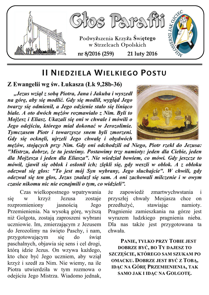 Podwyższenia Krzyża Świętego w Strzelcach Opolskich nr 8/2016 (259) 21 luty 2016 II N IEDZIELA W IELKIEGO P OSTU Z Ewangelii wg św. Łukasza (Łk 9,28b-36) „Jezus wziął z sobą Piotra, Jana i Jakuba i wyszedł na górę, aby się modlić. Gdy się modlił, wygląd Jego twarzy się odmienił, a Jego odzienie stało się lśniąco białe. A oto dwóch mężów rozmawiało z Nim. Byli to Mojżesz i Eliasz. Ukazali się oni w chwale i mówili o Jego odejściu, którego miał dokonać w Jerozolimie. Tymczasem Piotr i towarzysze snem byli zmorzeni. Gdy się ocknęli, ujrzeli Jego chwałę i obydwóch mężów, stojących przy Nim. Gdy oni odchodzili od Niego, Piotr rzekł do Jezusa: "Mistrzu, dobrze, że tu jesteśmy. Postawimy trzy namioty: jeden dla Ciebie, jeden dla Mojżesza i jeden dla Eliasza". Nie wiedział bowiem, co mówi. Gdy jeszcze to mówił, zjawił się obłok i osłonił ich; zlękli się, gdy weszli w obłok. A z obłoku odezwał się głos: "To jest mój Syn wybrany, Jego słuchajcie". W chwili, gdy odezwał się ten głos, Jezus znalazł się sam. A oni zachowali milczenie i w owym czasie nikomu nic nie oznajmili o tym, co widzieli”. Czas wielkopostnego wpatrywania się w krzyż Jezusa zostaje rozpromieniony jasnością Jego Przemienienia. Na wysoką górę, wyższą niż Golgota, zostają zaproszeni wybrani uczniowie. Im, zmierzającym z Jezusem do Jerozolimy na święto Paschy, i nam, przygotowującym się do świąt paschalnych, objawia się sens i cel drogi, którą idzie Jezus. On wzywa każdego, kto chce być Jego uczniem, aby wziął krzyż i szedł za Nim. Nie wiemy, na ile Piotra utwierdziła w tym rozmowa o odejściu Jego Mistrza. Wiadomo jednak, że zapowiedź zmartwychwstania i przyszłej chwały Mesjasza chce on przedłużyć, stawiając namioty. Pragnienie zamieszkania na górze jest wyrazem ludzkiego pragnienia nieba. Dla nas także jest przygotowana ta chwała. PANIE, TYLKO PRZY TOBIE JEST DOBRZE BYĆ, BO TY DAJESZ TO SZCZĘŚCIE, KTÓREGO SAM SZUKAM PO OMACKU. DOBRZE JEST BYĆ Z TOBĄ, IDĄC NA GÓRĘ PRZEMIENIENIA, TAK SAMO JAK I IDĄC NA GOLGOTĘ. 2 Gazetka Parafii Podwyższenia Krzyża Świętego w Strzelcach Opolskich PONIEDZIAŁEK – 22.02.2016 – REKOLEKCJE WIELKOPOSTNE 8.00 - Do B. Op. i MB Fatm… z ok. 80 rocz. ur. Marii Sichman oraz o błog. Boże dla rodziny. - Za ++ Jerzego, Antoniego i Krystynę oraz za dusze w czyśćcu. 18.00 - Za + męża Romana Przeździak w 5 rocz. śm. i ++ rodziny Przeździak i Maksel. - Za + Wioletę Dudek w 30 dzień po śmierci. WTOREK – 23.02.2016 – REKOLEKCJE WIELKOPOSTNE 8.00 - Do B. Op. i MB Fatm…w intencji Jolanty z ok. kol. rocz. urodzin. - Za + ojca Kazimierza, mamę Stanisławę, ++ z rodziny i dusze w czyśćcu. 18.00 - Za + męża Jerzego w 13 rocz. śm., + ojca, teściów i ++ z rodziny Woźnica i Wacławczyk. - Za + ojca Jana, mamę Anielę i ++ z rodziny. ŚRODA – 24.02.2016 – REKOLEKCJE WIELKOPOSTNE 8.00 - Do B. Op. i MB Fatm. z prośbą o błog. Boże i zdrowie dla Zygfryda i całej rodziny. - Za ++ Antoniego i Franciszka, Jana i Gerarda oraz za dusze w czyśćcu. 18.00 - Za + męża Franciszka, syna Sławomira, wnuka Dariusza, synową Genowefę, zięcia Eugeniusza, za ++ z rodziny Florek, Petrykowski i d. w c. - Do B. Op. i MB Fatm… w int. Józefa z ok. 60 rocz. ur. oraz o błog. Boże dla dzieci i wnuków. CZWARTEK – 25.02.2016 7.00 - O nawrócenie grzeszników. 16.30 - Do B. Op. i MB Fatm…w int. Jagody z ok. 10 rocz. ur. oraz o błog. Boże w rodzinie. 18.00 - Za + siostrę Urszulę, + szwagra Zenona, ++ z rodziny Spuła i Janocha. - Za ++ Jana i Grażynę Góreckich. PIĄTEK – 26.02.2016 7.00 - Za dusze w czyśćcu cierpiące. 18.00 - Do B. Op. i MB Fatm… z ok. 77 rocz. ur. Józefy oraz o błog. Boże i zdrowie dla całej rodziny. - Za + ojca Franciszka Antosiak w kol. rocz. śm., + mamę Helenę, + szwagra Janusza i ++ z rodziny. SOBOTA – 27.02.2016 7.00 - Za + bratową Izabelę Marnik ++ jej rodziców, rodzeństwo i ++ z rodziny. 18.00 - Za ++ rodziców Wincentego i Różę, braci Romana i Ryszarda, siostrę Magdalenę, bratowe Antoninę i Gertrudę, szwagrów Tomasza, Józefa i Gintra, siostrzeńca Andrzeja i d. w c. - Za + mamę Mieczysławę z ok. ur., + tatę, dziadków i ++ z rodziny i pokrew. i d. w c. III NIEDZIELA WIELKIEGO POSTU – 28.02.2016 7.00 - Za Parafian. 8.30 - Za + ojca Kazimierza, + mamę Anastazję, + siostrę Henrykę, dziadków Krajewskich i Czerwińskich - Za + mamę Wiesławę Sznapka w 1 rocz. śm. + Szymona Kożuchowicz w 30 dz. po śmierci. 10.00 - Za + Jadwigę Pawłowską w 7 rocz. śm. i d. w c. - Za + Tomasza Jodła w 15 rocz. śm.,++ dziadków Kazimierę i Michała Jodła i Mariannę i Jana Jon. 11.15 - Za ++ dziadków Klarę i Ryszarda Malewskich i + wujka Tadeusza. - Za + Dariusza Mocza. 15.00 - Za + Ilonę Kubik w 2 rocz. śm., + męża Franciszka, ks. Antoniego Kubik, Ks. Prałata Antoniego Jokiel oraz za ++ z rodziny Kubik, Moczygęba i Chudalla. - Za + Stefanię Błaszczyk i ++ z rodziny obu stron. 16.00 - Gorzkie Żale. Gazetka parafii pw. Podwyższenia Krzyża Świętego w Strzelcach Opolskich 3 ♦ Dzisiaj II Niedziela Wielkiego Postu, zwana Niedzielą „Ad Gentes”, która jest dniem ♦ ♦ ♦ ♦ ♦ ♦ ♦ ♦ ♦ ♦ ♦ ♦ ♦ ♦ ♦ ♦ ♦ solidarności i modlitwy w intencji misjonarzy, którzy w krajach misyjnych, mimo różnych trudności i przeciwności, głoszą Ewangelię Chrystusa. Dzisiaj w naszej parafii rozpoczęły się doroczne rekolekcje wielkopostne, które trwać będą do środy włącznie. Zapraszamy wszystkich parafian do udziału. Rekolekcjom przewodniczy Ojciec Andrzej, którego bardzo serdecznie witamy i życzymy Bożego błog. Informujemy parafian, że w poniedziałek, wtorek i środę rano Msza św. z nauką rekolekcyjną będzie o godz. 8.00. O godz. 7.30 zapraszamy na modlitwę różańcową. Dzisiaj o godz. 16.00 - Gorzkie Żale z kazaniem pasyjnym. Po nabożeństwie nauka stanowa dla