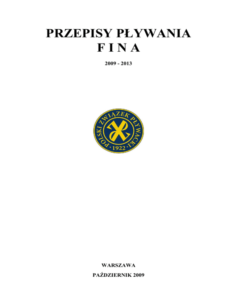 PRZEPISY PŁYWANIA FINA 2009 - 2013 WARSZAWA PAŹDZIERNIK 2009 Polski Związek Pływacki - Przepisy FINA 2009 – 2013 Niniejsze przepisy pływania są tłumaczeniem z języka angielskiego przepisów FINA 2009 - 2013. Tłumaczył: Konsultacja: Jerzy Kowalski Eugeniusz Waraksa 2 Polski Związek Pływacki - Przepisy FINA 2009 – 2013 PRZEPISY PŁYWANIA F I N A 1. 2. 3. 4. 5. 6. 7. 8. 9. 10. 11. 12. 13. SW 1 Kierownictwo zawodów SW 2 Sędziowie SW 3 Rozstawienie wyścigów eliminacyjnych i finałowych SW 4 Start SW 5 Styl dowolny SW 6 Styl grzbietowy SW 7 Styl klasyczny SW 8 Styl motylkowy SW 9 Styl zmienny SW 10 Wyścig SW 11 Pomiar czasu SW 12 Rekordy świata i rekordy Polski SW 13 Procedura postępowania przy automatycznym sędziowaniu Str. 4 Str. 5 Str. 12 Str. 15 Str. 16 Str. 16 Str. 17 Str. 18 Str. 19 Str. 19 Str. 21 Str. 22 Str. 26 PRZEPISY F I N A DOTYCZĄCE OBIEKTÓW 14. 15. 16. 17. FR 1 Uwagi Generalne FR 2 Pływalnia FR 3 Pływalnie przeznaczone do organizowania igrzysk olimpijskich i mistrzostw świata FR 4 Automatyczna aparatura do sędziowania 3 Str. 28 Str. 29 Str. 35 Str. 37 Polski Związek Pływacki - Przepisy FINA 2009 – 2013 SW 1 Kierownictwo zawodów. SW 1.1 Kierownictwo zawodów powołane przez właściwe władze posiada prawo rozstrzygania wszystkich spraw nie podlegających w myśl przepisów sędziemu głównemu, sędziom lub innym osobom i jest w mocy wstrzymać odbywanie się konkurencji i dać wskazówki zgodne z przepisami co do sposobu przeprowadzenia każdej konkurencji. SW 1.2 Na igrzyskach olimpijskich, mistrzostwach świata i zawodach o puchar świata, Biuro FINA wyznacza następujące minimalne ilości sędziów dla kierowania zawodami: sędzia główny (1) kierownik pomieszczenia kontrolnego (1) sędziowie stylu (4) starterzy (2) kierownicy inspektorów nawrotów (2, 1 na każdym końcu pływalni) inspektorzy nawrotów (1 na każdym końcu pływalni) kierownik sekretariatu (1) kierownicy wyścigów (2) obsługa linki przedwczesnego startu (1) informator (1) SW 1.2.2 Na wszystkich innych zawodach międzynarodowych właściwe władze wyznaczają taką samą lub mniejszą ilość sędziów, co podlega, tam gdzie jest to stosowne, zatwierdzeniu przez odpowiednie regionalne lub międzynarodowe władze. SW 1.2.3 Gdy automatyczna aparatura do sędziowania jest niedostępna to musi ona być zastąpiona przez kierownika sędziów mierzących czas, 3 sędziów mierzących czas na każdym torze i 2 sędziów mierzących czas dodatkowo. SW 1.2.4 Gdy nie jest stosowany automatyczny pomiar czasu i/lub czasu nie mierzy się trzema (3) czasomierzami cyfrowymi na każdym torze, wymagany jest sędzia - kierownik sędziów celowniczych i sędziowie celowniczy. 4 Polski Związek Pływacki - Przepisy FINA 2009 – 2013 Uwaga: Na wszystkich zawodach pływackich w kraju obowiązują niżej wymienione minimalne ilości sędziów: na pływalni 25 m - 20 sędziów + sekretariat na pływalni 50 m - 24 sędziów + sekretariat SW 1.3 Pływalnia i wyposażenie techniczne na igrzyska olimpijskie i mistrzostwa świata muszą być poddane inspekcji i zostać zatwierdzone we właściwym czasie przed zawodami pływackimi przez delegata FINA oraz członka Komitetu Technicznego Pływania FINA. SW 1.4 Gdy telewizja używa podwodnego sprzętu do filmowania, musi on być zdalnie sterowany i nie powinien ograniczać widzenia lub toru zawodników i nie może zmienić konfiguracji pływalni ani zasłaniać wymaganych oznaczeń FINA. SW 2 Sędziowie. SW 2.1 Sędzia główny. SW 2.1.1 Sędzia główny sprawuje pełną kontrolę i władzę nad wszystkimi sędziami, zatwierdza przydzielone im stanowiska i instruuje ich w zakresie specjalnych wymagań lub przepisów związanych z tymi zawodami. Egzekwuje wszystkie przepisy i decyzje FINA oraz rozstrzyga wszystkie kwestie związane z aktualnym prowadzeniem mitingu, konkurencji, czy zawodów, których rozstrzygnięcie nie jest określone przepisami. SW 2.1.2 Sędzia główny może interweniować w zawodach, w każdej ich fazie, dla zapewnienia aby były przestrzegane przepisy FINA, rozpatruje wszystkie protesty dotyczące trwających zawodów. SW 2.1.3 Gdy korzysta się z sędziów celowniczych bez stosowania trzech (3) czasomierzy cyfrowych i jest to konieczne, o kolejności decyduje sędzia główny. Jeśli jest dostępna automatyczna aparatura do pomiaru czasu i funkcjonuje, wyniki z niej muszą być wzięte pod uwagę jak to przedstawiono w p. SW 13. SW 2.1.4 Sędzia główny powinien zapewnić, aby wszyscy niezbędni sędziowie znajdowali się na przydzielonych im 5 Polski Związek Pływacki - Przepisy FINA 2009 – 2013 stanowiskach dla prowadzenia zawodów. Może wyznaczyć zastępców za jakichkolwiek nieobecnych, niezdolnych do pełnienia funkcji lub uznanych za nieefektywnych. Może wyznaczyć dodatkowych sędziów o ile uzna to za konieczne. SW 2.1.5 Przy rozpoczęciu każdego wyścigu sędzia główny daje sygnał pływakom poprzez serie krótkich gwizdków, zapraszających do zdjęcia ubrania z wyjątkiem stroju pływackiego, po których następuje długi gwizdek sygnalizujący, że powinni oni zająć swoje miejsca na platformie startowej (lub dla stylu grzbietowego i sztafet zmiennych, sygnalizujący, że powinni bezzwłocznie wejść do wody). Drugi długi gwizdek jest sygnałem dla grzbiecisty lub pływaka sztafety zmiennej do bezzwłocznego zajęcia pozycji startowej. Gdy pływacy i sędziowie są przygotowani do startu, sędzia główny poprzez wyciągnięcie ręki, daje znak starterowi, że pływacy są pod kontrolą startera. Wyciągnięta ręka powinna pozostawać w tej pozycji do wydania komendy startowej. Uwaga: Sędzia główny wyciągniętą rękę w kierunku startera trzyma tak długo, aż starter da sygnał do startu. Jeżeli sędzia główny w międzyczasie opuści rękę jest to znak dla startera, że ma on wstrzymać start. SW 2.1.6 Sędzia główny dyskwalifikuje każdego pływaka za każde naruszenie przepisów, które