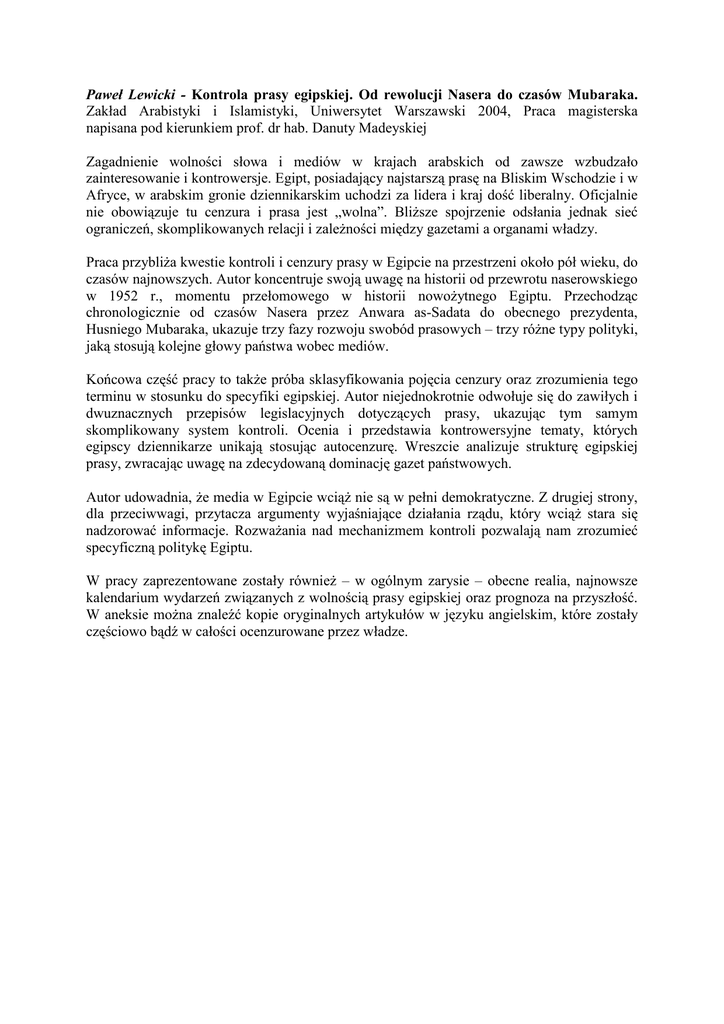 Paweł Lewicki - Kontrola prasy egipskiej. Od rewolucji Nasera do czasów Mubaraka. Zakład Arabistyki i Islamistyki, Uniwersytet Warszawski 2004, Praca magisterska napisana pod kierunkiem prof. dr hab. Danuty Madeyskiej Zagadnienie wolności słowa i mediów w krajach arabskich od zawsze wzbudzało zainteresowanie i kontrowersje. Egipt, posiadający najstarszą prasę na Bliskim Wschodzie i w Afryce, w arabskim gronie dziennikarskim uchodzi za lidera i kraj dość liberalny. Oficjalnie nie obowiązuje tu cenzura i prasa jest „wolna”. BliŜsze spojrzenie odsłania jednak sieć ograniczeń, skomplikowanych relacji i zaleŜności między gazetami a organami władzy. Praca przybliŜa kwestie kontroli i cenzury prasy w Egipcie na przestrzeni około pół wieku, do czasów najnowszych. Autor koncentruje swoją uwagę na historii od przewrotu naserowskiego w 1952 r., momentu przełomowego w historii nowoŜytnego Egiptu. Przechodząc chronologicznie od czasów Nasera przez Anwara as-Sadata do obecnego prezydenta, Husniego Mubaraka, ukazuje trzy fazy rozwoju swobód prasowych – trzy róŜne typy polityki, jaką stosują kolejne głowy państwa wobec mediów. Końcowa część pracy to takŜe próba sklasyfikowania pojęcia cenzury oraz zrozumienia tego terminu w stosunku do specyfiki egipskiej. Autor niejednokrotnie odwołuje się do zawiłych i dwuznacznych przepisów legislacyjnych dotyczących prasy, ukazując tym samym skomplikowany system kontroli. Ocenia i przedstawia kontrowersyjne tematy, których egipscy dziennikarze unikają stosując autocenzurę. Wreszcie analizuje strukturę egipskiej prasy, zwracając uwagę na zdecydowaną dominację gazet państwowych. Autor udowadnia, Ŝe media w Egipcie wciąŜ nie są w pełni demokratyczne. Z drugiej strony, dla przeciwwagi, przytacza argumenty wyjaśniające działania rządu, który wciąŜ stara się nadzorować informacje. RozwaŜania nad mechanizmem kontroli pozwalają nam zrozumieć specyficzną politykę Egiptu. W pracy zaprezentowane zostały równieŜ – w ogólnym zarysie – obecne realia, najnowsze kalendarium wydarzeń związanych z wolnością prasy egipskiej oraz prognoza na przyszłość. W aneksie moŜna znaleźć kopie oryginalnych artykułów w języku angielskim, które zostały częściowo bądź w całości ocenzurowane przez władze.