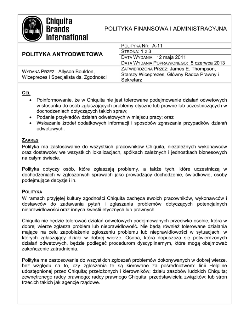 POLITYKA FINANSOWA I ADMINISTRACYJNA POLITYKA ANTYODWETOWA WYDANA PRZEZ: Allyson Bouldon, Wiceprezes i Specjalista ds. Zgodności CEL POLITYKA NR: A-11 STRONA: 1 z 3 DATA WYDANIA: 12 maja 2011 DATA WYDANIA POPRAWIONEGO: 5 czerwca 2013 ZATWIERDZONA PRZEZ: James E. Thompson, Starszy Wiceprezes, Główny Radca Prawny i Sekretarz Poinformowanie, że w Chiquita nie jest tolerowane podejmowanie działań odwetowych w stosunku do osób zgłaszających problemy etyczne lub prawne lub uczestniczących w dochodzeniach dotyczących takich spraw; Podanie przykładów działań odwetowych w miejscu pracy; oraz Wskazanie źródeł dodatkowych informacji i sposobów zgłaszania przypadków działań odwetowych. ZAKRES Polityka ma zastosowanie do wszystkich pracowników Chiquita, niezależnych wykonawców oraz dostawców we wszystkich lokalizacjach, spółkach zależnych i jednostkach biznesowych na całym świecie. Polityka dotyczy osób, które zgłaszają problemy, a także tych, które uczestniczą w dochodzeniach w zgłoszonych sprawach jako prowadzący dochodzenie, świadkowie, osoby podejmujące decyzje i in. POLITYKA W ramach przyjętej kultury zgodności Chiquita zachęca swoich pracowników, wykonawców i dostawców do zadawania pytań i zgłaszania problemów dotyczących potencjalnych nieprawidłowości oraz innych kwestii etycznych lub prawnych. Chiquita nie będzie tolerować działań odwetowych podejmowanych przeciwko osobie, która w dobrej wierze zgłasza problem lub nieprawidłowość. Nie będą również tolerowane działania mające na celu zapobieżenie zgłoszeniu problemu lub nieprawidłowości w sytuacjach, w których zgłaszający działa w dobrej wierze. Osoba, która dopuszcza się potwierdzonych działań odwetowych, będzie podlegać procedurom dyscyplinarnym, które mogą obejmować zakończenie zatrudnienia. Polityka ma zastosowanie do wszystkich zgłoszeń problemów dokonywanych w dobrej wierze, bez względu na to, czy zgłoszenia te są kierowane za pośrednictwem: linii Helpline udostępnionej przez Chiquita; przełożonych i kierowników; działu zasobów ludzkich Chiquita; zewnętrznego radcy prawnego; radcy prawnego Chiquita; przedstawiciela związków; lub stron trzecich takich jak agencje rządowe. POLITYKA ANTYODWETOWA POLITYKA NR: A-11 STRONA: 2 z 3 DATA WYDANIA: 12 maja 2011 DATA WYDANIA POPRAWIONEGO: 5 czerwca 2013 Niżej podano przykłady zachowań, które nie będą tolerowane, jeśli będą one stanowić część działań odwetowych w związku ze zgłoszeniem pytań lub problemów lub udziałem w dochodzeniu: Wykluczenie z podejmowania decyzji i działań związanych z pracą; Okazywanie lekceważenia/wrogości przez przełożonych lub współpracowników; Werbalne obrażanie przez przełożonego lub innego członka kadry zarządzającej; Zwolnienie, degradacja lub groźby dotyczące zwolnienia lub degradacji; Odmowa awansu, podwyżki, przydzielenia pracownika do określonych zadań lub jego przeniesienia; Przydzielenie pracownikowi mniej pożądanych przez niego zmian lub zadań; Zmniejszenie liczby godzin pracy; Przemoc fizyczna skierowana przeciwko osobom lub mieniu oraz groźby dotyczące takiej przemocy; lub Inne negatywne działania odwetowe związane z zatrudnieniem. Postanowienia Polityki nie odbierają jednak firmie Chiquita prawa podejmowania decyzji kadrowych wynikających ze zgodnych z prawem powodów biznesowych, niemających charakteru odwetowego. ZGŁASZANIE PROBLEMÓW Przypadki działań odwetowych oraz inne problemy etyczne lub prawne mogą być zgłaszane bezpośredniemu przełożonemu lub innemu przełożonemu Chiquita, pracownikowi działu zasobów ludzkich Chiquita, Dyrektorowi ds. Zgodności w Chiquita; mogą one również być zgłaszane za pośrednictwem udostępnionej przez Chiquita linii Helpline. Helpline umożliwia pracownikom Chiquita, dostawcom i innym stronom trzecim zgłaszanie problemów natury etycznej lub prawnej. Linia jest dostępna 24 godziny na dobę przez 7 dni w tygodniu, a zgłoszenia są przyjmowane we wszystkich językach. Aby połączyć się z linią Helpline, należy wybrać numer 1 888 749 1952 lub wejść na stronę www.chiquitahelpline.ethicspoint.com. Tożsamość osób dokonujących zgłoszeń, zgłaszających pytania lub problemy lub uczestniczących w dochodzeniach nie będzie ujawniana i będzie chroniona w największym możliwym stopniu. W niektórych przypadkach zachowanie pełnej poufności może jednak nie być możliwe. Osoby, którym udowodniono dokonanie zgłoszeń w złej wierze lub udział w innych wykroczeniach, mogą być poddane procedurom dyscyplinarnym, które mogą obejmować zakończenie zatrudnienia. WDROŻENIE Polityka stanowi skonsolidowaną wersję już obowiązujących wytycznych antyodwetowych, ma więc skutek natychmiastowy. POLITYKA ANTYODWETOWA POLITYKA NR: A-11 STRONA: 3 z 3 DATA WYDANIA: 12 maja 2011 DATA WYDANIA POPRAWIONEGO: 5 czerwca 2013 POWIĄZANE POLITYKI Kodeks postępowania Chiquita ZAKRES ODPOWIEDZIALNOŚCI Dział zgodności i dział zasobów ludzkich będą wspólnie podejmować działania mające na celu zapobieganie działaniom odwetowym przeciwko osobom, które zgłosiły problemy lub wzięły udział w dochodzeniu. Dyrektor ds. Zgodności jest odpowiedzialny za dokonywanie przeglądów i aktualizacji Polityki. Wszelkie pytania dotyczące stosowania lub interpretacji Polityki powinny być kierowane do Dyrektora ds. Zgodności lub pracownika działu zasobów ludzkich. Zgodność z Polityką będzie na bieżąco monitorowana, a jej przestrzeganie będzie badane przez dział audytu wewnętrznego podczas okresowych audytów.
