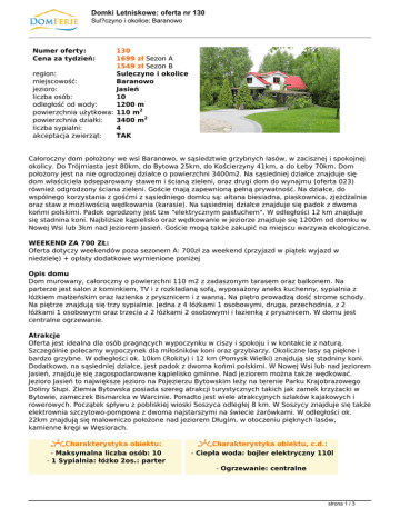 Domki Letniskowe: oferta nr 130 Sul?czyno i okolice; Baranowo Numer oferty: Cena za tydzień: 130 1699 zł Sezon A 1549 zł Sezon B region: Sulęczyno i okolice miejscowość: Baranowo jezioro: Jasień liczba osób: 10 odległość od wody: 1200 m powierzchnia użytkowa: 110 m2 powierzchnia działki: 3400 m2 liczba sypialni: 4 akceptacja zwierząt: TAK Całoroczny dom położony we wsi Baranowo, w sąsiedztwie grzybnych lasów, w zacisznej i spokojnej okolicy. Do Trójmiasta jest 80km, do Bytowa 25km, do Kościerzyny 41km, a do Łeby 70km. Dom położony jest na nie ogrodzonej działce o powierzchni 3400m2. Na sąsiedniej działce znajduje się dom właściciela odseparowany stawem i ścianą zieleni, oraz drugi dom do wynajmu (oferta 023) również odgrodzony ściana zieleni. Goście mają zapewnioną pełną prywatność. Na działce, do wspólnego korzystania z gośćmi z sąsiedniego domku są: altana biesiadna, piaskownica, zjeżdżalnia oraz staw z możliwością wędkowania (karasie). Na sąsiedniej działce znajduje się padok z dwoma końmi polskimi. Padok ogrodzony jest tzw "elektrycznym pastuchem". W odległości 12 km znajduje się stadnina koni. Najbliższe kąpielisko oraz wędkowanie w jeziorze znajduje się 1200m od domku w Nowej Wsi lub 3km nad Jeziorem Jasień. Goście mogą także zakupić na miejscu warzywa ekologiczne. WEEKEND ZA 700 ZŁ: Oferta dotyczy weekendów poza sezonem A: 700zł za weekend (przyjazd w piątek wyjazd w niedzielę) + opłaty dodatkowe wymienione poniżej Opis domu Dom murowany, całoroczny o powierzchni 110 m2 z zadaszonym tarasem oraz balkonem. Na parterze jest salon z kominkiem, TV i z rozkładaną sofą, wyposażony aneks kuchenny, sypialnia z łóżkiem małżeńskim oraz łazienka z prysznicem i z wanną. Na piętro prowadzą dość strome schody. Na piętrze znajdują się trzy sypialnie. Jedna z 4 łóżkami 1 osobowymi, druga, przechodnia, z 2 łóżkami 1 osobowymi oraz trzecia z 2 łóżkami 2 osobowymi i łazienką z prysznicem. W domu jest centralne ogrzewanie. Atrakcje Oferta jest idealna dla osób pragnących wypoczynku w ciszy i spokoju i w kontakcie z naturą. Szczególnie polecamy wypoczynek dla miłośników koni oraz grzybiarzy. Okoliczne lasy są piękne i bardzo grzybne. W odległości ok. 10km (Rokity) i 12 km (Pomysk Wielki) znajdują się stadniny koni. Dodatkowo, na sąsiedniej działce, jest padok z dwoma końmi polskimi. W Nowej Wsi lub nad jeziorem Jasień, znajduje się zagospodarowane kąpielisko gminne. Nad jeziorem można także wędkować. Jezioro Jasień to największe jezioro na Pojezierzu Bytowskim leży na terenie Parku Krajobrazowego Doliny Słupi. Ziemia Bytowska posiada szereg atrakcji turystycznych takich jak zamek krzyżacki w Bytowie, zameczek Bismarcka w Warcinie. Ponadto jest wiele atrakcyjnych szlaków kajakowych i rowerowych. Początek spływu z pobliskiej wioski Soszyca odległej 8 km. W Soszycy znajduje się także elektrownia szczytowo-pompowa z dwoma najstarszymi na świecie żarówkami. W odległości ok. 22km znajdują się malowniczo położone nad jeziorem Długim, w otoczeniu pięknych lasów, kamienne kręgi w Węsiorach. Charakterystyka obiektu: - Maksymalna liczba osób: 10 - 1 Sypialnia: łóżko 2os.: parter Charakterystyka obiektu, c.d.: - Ciepła woda: bojler elektryczny 110l - Ogrzewanie: centralne strona 1 / 3 Domki Letniskowe: oferta nr 130 Sul?czyno i okolice; Baranowo - 2 Sypialnia: 4 łóżka 1os.: piętro - 3 Sypialnia, przechodnia: 2 łóżka 1os.: - Grill:piętro przenośny - TV: Polsat Cyfrowy - Pralka: tak - Zwierzęta domowe: tak* -- Wędkowanie 4 Sypialnia: 2włóżka stawie: 1os.: w cenie piętro - Dodatkowe - Wędkowanie spanie: w jeziorze: sofa wwykup salonie: zezwolenia parter na miejscu - Bielizna - Kąpiel pościelowa: w jeziorze: 10zł/os./tydzień 1200 m - Sklep- spożywczy: Aneks kuchenny: 1,5 km, parter Chośnica - Lekarz, ośr. zdrowia: 8 k, Parchowo - Stadnina - Kuchenka koni:49km palniki: (Rokity), gazowa 12 zkm piekarnikiem (Pomysk Wielki) elektr. - Czajnik: tak - Łazienka: z prysznicem i wanną: parter - Łazienka z prysznicem: piętro - Lodówka: tak - Salon z kominkiem: parter * nie ogrodzona działka CENNIK: Podana poniżej i wyróżniona na pomarańczowo cena jest całkowitą ceną wynajmu domu na 1 tydzień - od soboty do soboty (zawiera w sobie kwotę rezerwacji i zaliczki). Dodatkowo dolicza się podane niżej opłady obowiązkowe i/lub nieobowiązkowe. Sezon A Sezon B TYLKO Weekendy: 25.06. - 20.08.2011. Poza sezonem A 29.04 - 03.05 (4 doby) wynajem za 1 tydzień w tym: 1699 zł/tydz 1549 zł/tydz 999 zł za 3 doby 1249 zł za 4 doby - rezerwacja 299 zł/tydz 249 zł/tydz 249 zł/pobyt - zaliczka 200 zł/tydz 200 zł/tydz 200 zł/pobyt OPŁATY DODATKOWE: 1. Zużycie energii elekt. wg wskazań licznika; koszt 90 gr. za 1 kWh. 2. Sprzątanie domu po zakończeniu turnusu 100 zł jeżeli najemca nie chce sam wykonać tej pracy 3. Drewno do kominka wiązka 30 zł 4. Bielizna pościelowa: 10 zł/osoba 5. Każde zwierzę 50 zł/tydzień (w przypadku krótszych wynajmów opłata jest pobierana jak za cały tydzień) strona 2 / 3 Domki Letniskowe: oferta nr 130 Sul?czyno i okolice; Baranowo KAUCJA 300 zł Kaucja, pobierana przez właściciela w momencie przekazania kluczy, jest zwracana najemcy po potrąceniu kwoty opłat dodatkowych oraz ewentualnych uzasadnionych kosztów szkód powstałych z jego winy. strona 3 / 3 Powered by TCPDF (www.tcpdf.org)