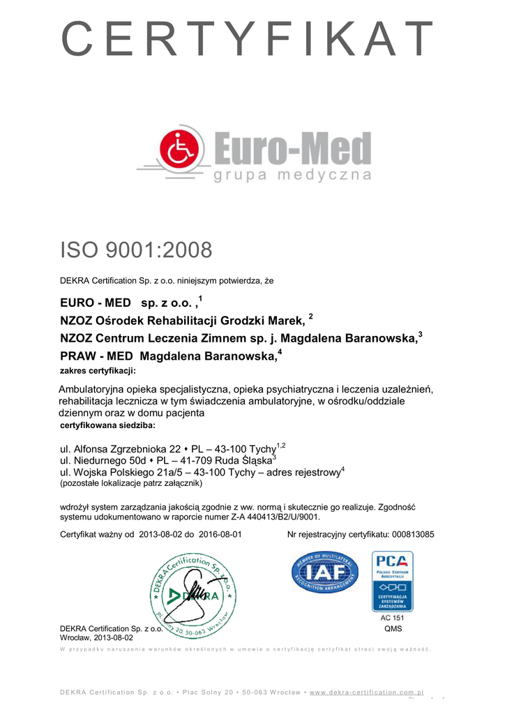 CERTYFIKAT ISO 9001:2008 DEKRA Certification Sp. z o.o. niniejszym potwierdza, że EURO - MED sp. z o.o. ,1 NZOZ Ośrodek Rehabilitacji Grodzki Marek, 2 NZOZ Centrum Leczenia Zimnem sp. j. Magdalena Baranowska,3 PRAW - MED Magdalena Baranowska,4 zakres certyfikacji: Ambulatoryjna opieka specjalistyczna, opieka psychiatryczna i leczenia uzależnień, rehabilitacja lecznicza w tym świadczenia ambulatoryjne, w ośrodku/oddziale dziennym oraz w domu pacjenta certyfikowana siedziba: ul. Alfonsa Zgrzebnioka 22 s PL – 43-100 Tychy1,2 ul. Niedurnego 50d s PL – 41-709 Ruda Śląska3 ul. Wojska Polskiego 21a/5 – 43-100 Tychy – adres rejestrowy4 (pozostałe lokalizacje patrz załącznik) wdrożył system zarządzania jakością zgodnie z ww. normą i skutecznie go realizuje. Zgodność systemu udokumentowano w raporcie numer Z-A 440413/B2/U/9001. Certyfikat ważny od 2013-08-02 do 2016-08-01 DEKRA Certification Sp. z o.o. Wrocław, 2013-08-02 Nr rejestracyjny certyfikatu: 000813085 QMS W przypadku narus zeni a w arunków ok reśl onyc h w um owi e o c ertyfikac ję c ertyfik at s traci swoj ą w ażność . DE K RA Cert i fic ati on S p. z o. o. • Pl ac S ol ny 20 • 50-063 W roc ł aw • ww w. dekra-c ert i fi c at i on.c om . pl Strona 1 z 4 Załącznik do certyfikatu nr 000813085 ważny od 2013-08-02 do 2016-08-01 Powyższym certyfikatem objęte są następujące lokalizacje: oddział certyfikowana siedziba zakres certyfikacji 1. EURO – MED sp. z o.o. PL – 43-100, Tychy ul. Zgrzebnioka 22 2. NZOZ Ośrodek Rehabilitacji Grodzki Marek PL – 43-100, Tychy ul. Zgrzebnioka 22 3. EURO – MED. sp. z o.o. PL – 40-668 Katowice ul. Głuszców 9 4. EURO – MED sp. z o.o. 5. EURO – MED sp. z o.o. PL – 41-103 Siemianowice Śląskie ul. Wiejska 2 PL – 32-600 Oświęcim ul. Dąbrowskiego 30 Ambulatoryjna opieka specjalistyczna, opieka psychiatryczna i leczenia uzależnień, rehabilitacja lecznicza w tym świadczenia ambulatoryjne Ambulatoryjna opieka specjalistyczna, opieka psychiatryczna i leczenia uzależnień rehabilitacja lecznicza w ośrodku/oddziale dziennym Ambulatoryjna opieka specjalistyczna, opieka psychiatryczna i leczenia uzależnień rehabilitacja lecznicza w tym świadczenia ambulatoryjne, w ośrodku/oddziale dziennym Rehabilitacja lecznicza w ośrodku/oddziale dziennym 6. EURO – MED sp. z o.o. EURO – MED sp. z o.o. Opieka psychiatryczna i leczenia uzależnień, rehabilitacja lecznicza w tym świadczenia ambulatoryjne, w ośrodku/oddziale dziennym Rehabilitacja lecznicza w ośrodku/oddziale dziennym Rehabilitacja lecznicza w domu pacjenta 8. EURO – MED sp. z o.o. PL – 32-600 Oświęcim ul. Solna 4 PL – 43-100 Tychy ul. Grota – Roweckiego 42/117 PL – 44-335 Jastrzębie Zdrój ul. Wielkopolska 2a/121 9. EURO – MED sp. z o.o. PL – 43-300 Bielsko - Biała ul. Starobielska 11 Rehabilitacja lecznicza w tym świadczenia ambulatoryjne w domu pacjenta NZOZ Ośrodek Rehabilitacji Grodzki 10. Marek PL – 43-300 Bielsko - Biała ul. Starobielska 11 Rehabilitacja lecznicza w tym świadczenia ambulatoryjne w ośrodku/oddziale dziennym EURO – MED 11. sp. z o.o. PL – 26-600 Radom ul. Pamięci Katynia 12a/3 Rehabilitacja lecznicza w domu pacjenta EURO – MED 12. sp. z o.o. PL – 60-631 Poznań ul. Dojazd 34/8 Rehabilitacja lecznicza w domu pacjenta EURO – MED 13. sp. z o.o. PL – 35-006 Rzeszów ul. Siemiradzkiego 6 Rehabilitacja lecznicza w domu pacjenta 7. Rehabilitacja lecznicza w domu pacjenta DE K RA Cert i fic ati on S p. z o. o. • Pl ac S ol ny 20 • 50-063 W roc ł aw • ww w. dekra-c ert i fi c at i on.c om . pl Strona 2 z 4 Załącznik do certyfikatu nr 000813085 ważny od 2013-08-02 do 2016-08-01 Powyższym certyfikatem objęte są następujące lokalizacje: 14. EURO – MED sp. z o.o. PL – 27-200 Starachowice ul. Jana Pawła II 1 Rehabilitacja lecznicza w domu pacjenta 15. EURO – MED sp. z o.o. Rehabilitacja lecznicza w domu pacjenta 16. EURO – MED sp. z o.o. PL – 27-400 Ostrowiec Świętokrzyski ul. Grabowiecka 3de PL – 16-300 Augustów Mostowa 1/105 17. EURO – MED sp. z o.o. PL – 59-200 Legnica ul. Tatrzańska 2 Rehabilitacja lecznicza w domu pacjenta 18. EURO – MED sp. z o.o. PL – 51-160 Wrocław – Psie Pole ul. Boya-Żeleńskiego 22/6 Rehabilitacja lecznicza w domu pacjenta 19. EURO – MED sp. z o.o. PL – 58-400 Kamienna Góra ul. Broniewskiego 26-26A Rehabilitacja lecznicza w domu pacjenta 20. NZOZ Ośrodek Rehabilitacji Grodzki Marek PL – 43-100 Tychy ul. Nałkowskiej 27 Ambulatoryjna opieka specjalistyczna 21. NZOZ Ośrodek Rehabilitacji Grodzki Marek PL – 47-400 Racibórz ul. Gamowska 3 Rehabilitacja lecznicza w tym świadczenia ambulatoryjne w ośrodku/oddziale dziennym 22. NZOZ Ośrodek Rehabilitacji Grodzki Marek PL – 42-224 Częstochowa ul. Andersa 12 Rehabilitacja lecznicza- świadczenia ambulatoryjne 23. NZOZ Ośrodek Rehabilitacji Grodzki Marek PL – 05-420 Józefów ul. Curie- Skłodowskiej 5/7 Rehabilitacja lecznicza - świadczenia ambulatoryjne 24. NZOZ Ośrodek Rehabilitacji Grodzki Marek PL – 25-315 Kielce ul. Starodomaszowska 15 Rehabilitacja lecznicza w ośrodku/oddziale dziennym 25. NZOZ Ośrodek Rehabilitacji Grodzki Marek PL – 28-300 Osowa ul. Sobków- Osowa 13 Rehabilitacja lecznicza - świadczenia ambulatoryjne 26. NZOZ Ośrodek Rehabilitacji Grodzki Marek PL – 27-640 Klimontów ul. Sandomierska 31 Rehabilitacja lecznicza - świadczenia ambulatoryjne PL – 41-709 Ruda Śląska 27. Centrum Leczenia Zimnem sp. jawna ul. Niedurnego 50d Magdalena Baranowska PL – 41-208 Sosnowiec 28. PRAW – MED Magdalena Baranowska ul. Jedności 10 pok. 48 Rehabilitacja lecznicza w domu pacjenta Ambulatoryjna opieka specjalistyczna, rehabilitacja lecznicza w tym świadczenia ambulatoryjne, w ośrodku/oddziale dziennym Świadczenia medyczne w zakresie rehabilitacji w domu pacjenta. Świadczenia ambulatoryjne w ośrodku/oddziale dziennym. DE K RA Cert i fic ati on S p. z o. o. • Pl ac S ol ny 20 