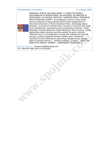ARCHIWALNE | Wszystkie 17 Lutego 2009 w w w .s po jn ik Agencja "Spójnik", Trenton-Filadelfia-Nowy Jork Tel.: 609.393.1660 LUB 215.425.8560 .c o m WSPANIAŁY POMYSŁ NA DZIEN KOBIET !!! SPĘDŹ TEN DZIEŃ Z UKOCHANĄ(YM) W NOWYM JORKU. NA SPACERZE, NA OBIEDZIE W RESTAURACJI I W TEATRZE. SPEKTAKL "SAMOTNE SERCA" PRZENIESIE WAS W SERCOWE KLIMATY. W największym skrócie: cztery osoby, które los połączył ze sobą podczas dwóch godzin spędzonych na wieczorku tanecznym w Klubie Samotnych Serc, przeżywają więcej perypetii i uczuciowych trzęsień ziemi, niż wielu z nas przez całe swoje życie. Bohaterowie, wykreowani przez wyśmienitych aktorów - Edytę Olszówkę, Grażynę Wolszczak, Piotra Machalicę i Piotr Cyrwusa - każdą, najprostszą nawet sytuację, potrafią zawikłać do granic absurdu. "Samotne serca" to przezabawna i prawdziwie inteligentna komedia sercowa, w której wspaniała obsada, świetny tekst i znakomita realizacja Tomasz Dutkiewicza, gwarantują niezapomniany wieczór pełen szczerego śmiechu i... odrobinę refleksji. O miłości... BILETY DO NABYCIA W AGENCJI "SPÓJNIK" - ZAPEWNIAMY TRANSPORT !!!
