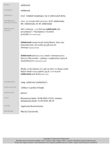 HASŁO subdermal WYMOWA subdermal DEFINICJA środ. «implant znajdujący się w całości pod skórą» INFORMACJA GRAMATYCZNA rzecz. m żywotny lub rzeczowy, lp D. subdermala, Ms. subdermalu, lm M. subdermale PRZYKŁADY UŻYCIA Jak w temacie – czy ktoś ma subdermale [do sprzedania]? / Najchętniej w kształcie gwiazdki (www.tattooart.pl). Subdermale usunie każdy modyfikator, który ma doświadczenie, nie trzeba się udawać do chirurga (zapytaj.onet.pl). Subdermale pierwszy raz zostały wykonane przez Steeve’a Haywortha – jednego z najbardziej znanych modyfikatorów (medioznawcza.pl). Myślę, że doczekamy ery, gdy na ulicy co druga osoba będzie miała rozszczepiony język, a co trzecia subdermale pod skórą (fotka.com). ETYMOLOGIA WIZUALIZACJE <ang. subdermal ‘podskórny’> Zobacz w grafice Google ODSYŁACZE piercer DATA Rejestracja hasła: 10.06.2016, 03.03, ostatnia aktualizacja hasła: 21.09.2016, 08.19 AUTOR Agnieszka Kostrowiecka REDAKTOR Maciej Czeszewski Copyright © Uniwersytet Warszawski Wszelkie prawa zastrzeżone zgodnie z art.17 ustawy z dnia 4 lutego 1994 r. o prawie autorskim i prawach pokrewnych. Teksty oraz zdjęcia zawarte w tym dokumencie nie mogą być publikowane bez wiedzy i zgody właściciela praw autorskich. Powered by TCPDF (www.tcpdf.org)
