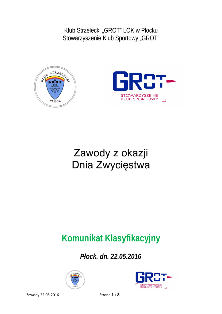 Klub Strzelecki „GROT” LOK w Płocku Stowarzyszenie Klub Sportowy „GROT” Zawody z okazji Dnia Zwycięstwa Komunikat Klasyfikacyjny Płock, dn. 22.05.2016 Zawody 22.05.2016 Strona 1 z 8 Zawody z okazji Dnia Zwycięstwa Obserwator WMZSS Tomasz Ciecierski klasa sędziowska I Sędzia Główny Zawodów Tomasz Ciecierski klasa sędziowska I Przewodniczący komisji klasyfikacyjnej Dariusz Kubiński klasa sędziowska I Sędzia główny strzelań – 25 m Honoriusz Siarkowski Zenon Kamiński klasa sędziowska III klasa sędziowska III Sędzia główny strzelań – 50 m karabin sportowy Tadeusz Babiński klasa sędziowska II Sędzia główny strzelań – 50 m karabin centralnego zapłonu Wojciech Pudlik klasa sędziowska I Sędzia główny strzelań – strzelba dynamiczna Artur Wiśniewski klasa sędziowska III Kierownik biura obliczeń Paweł Ślepowroński Jarosław Walczak klasa sędziowska III klasa sędziowska III Zabezpieczenie medyczne Eryk Matusiak Zawody 22.05.2016 ratownik medyczny uprawnienia Nr 20/2015 Strona 2 z 8 Zawody z okazji Dnia Zwycięstwa Pistolet sportowy – 20 strzałów Rezultaty Przewodniczący Komisji Klasyfikacyjnej Dariusz Kubiński kl. s. I Zawody 22.05.2016 Strona 3 z 8 Zawody z okazji Dnia Zwycięstwa Pistolet centralnego zapłonu – 10 strzałów Rezultaty Przewodniczący Komisji Klasyfikacyjnej Dariusz Kubiński kl. s. I Zawody 22.05.2016 Strona 4 z 8 Zawody z okazji Dnia Zwycięstwa Karabin sportowy – 20 strzałów Rezultaty Przewodniczący Komisji Klasyfikacyjnej Dariusz Kubiński kl. s. I Zawody 22.05.2016 Strona 5 z 8 Zawody z okazji Dnia Zwycięstwa Karabin centralnego zapłonu – 10 strzałów Rezultaty Przewodniczący Komisji Klasyfikacyjnej Dariusz Kubiński kl. s. I Zawody 22.05.2016 Strona 6 z 8 Zawody z okazji Dnia Zwycięstwa Strzelba dynamiczna – 7 strzałów Rezultaty Przewodniczący Komisji Klasyfikacyjnej Dariusz Kubiński kl. s. I Zawody 22.05.2016 Strona 7 z 8 Zawody z okazji Dnia Zwycięstwa Komunikat klasyfikacyjny zawiera protokóły z następujących konkurencji: 1. Pistolet sportowy 20 strzałów – open 2. Pistolet centralnego zapłonu 10 strzałów – open 3. Karabin sportowy 20 strzałów leżąc – open 4. Karabin centralnego zapłonu 10 strzałów leżąc – open 5. Strzelba dynamiczna 7 strzałów – open Zawody przeprowadzono zgodnie z regulaminem zawodów oraz przepisami PZSS i ISSF Protestów nie składano. Sędzia Główny Zawodów Przewodniczący Komisji Klasyfikacyjnej Tomasz Ciecierski s. kl. I Dariusz Kubiński kl. s. I Obserwator WMZSS Tomasz Ciecierski s. kl. P Płock, dn. 22.05.2016 Zawody 22.05.2016 Strona 8 z 8
