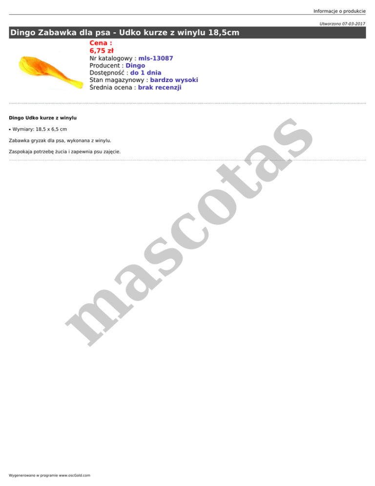 Informacje o produkcie Utworzono 07-03-2017 Dingo Zabawka dla psa - Udko kurze z winylu 18,5cm Cena : 6,75 zł Nr katalogowy : mls-13087 Producent : Dingo Dostępność : do 1 dnia Stan magazynowy : bardzo wysoki Średnia ocena : brak recenzji Dingo Udko kurze z winylu Wymiary: 18,5 x 6,5 cm s ● Zabawka gryzak dla psa, wykonana z winylu. m as co ta Zaspokaja potrzebę żucia i zapewnia psu zajęcie. Wygenerowano w programie www.oscGold.com
