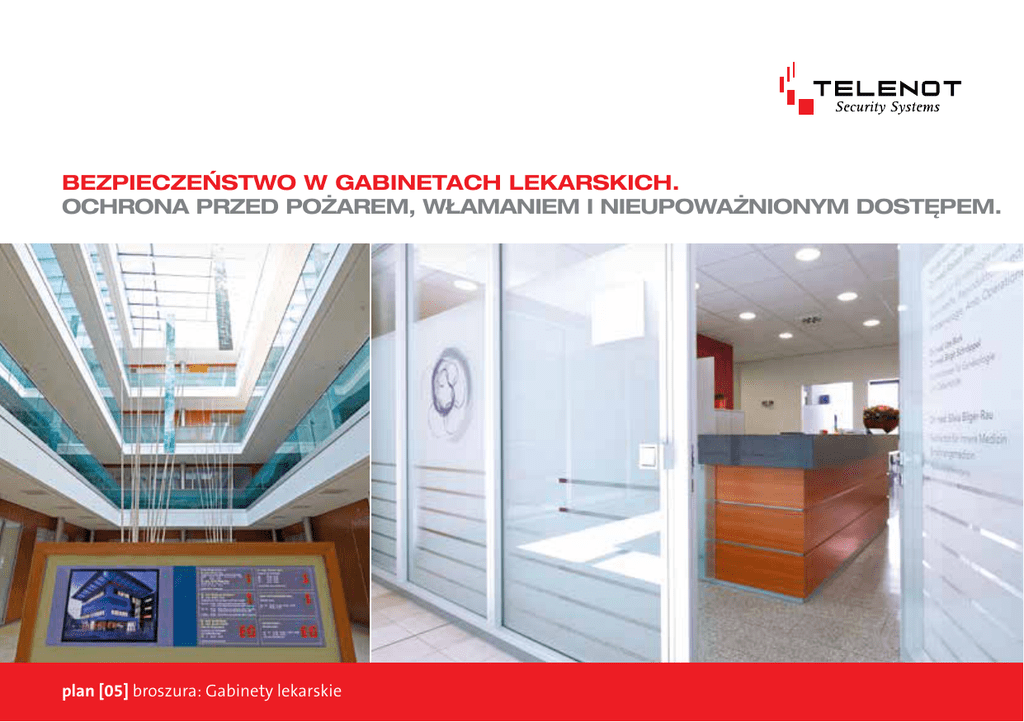 BEZPIECZEŃSTWO W GABINETACH LEKARSKICH. OCHRONA PRZED POŻAREM, WŁAMANIEM I NIEUPOWAŻNIONYM DOSTĘPEM. plan [05] broszura: Gabinety lekarskie OBIEKT – PLAN 05 – STRONA 3 OBIEKT. SPECJALISTYCZNY GABINET GINEKOLOGICZNY. W centrum poradni specjalistycznych w niemieckiej miejscowości Aalen mieści się gabinet ginekologiczny wraz z poradnią leczenia niepłodności. Praktyka lekarska stawia na wiedzę specjalistyczną, nowoczesny sprzęt, atmosferę zaufania i bezpieczeństwo. Zakładano zatem opracowanie takiej koncepcji bezpieczeństwa, która byłaby dostosowana do specyficznych warunków tego miejsca. Miała ona obejmować: uregulowany dostęp osób do różnych stref, ochronę pacjentów i pracowników przed włamaniem i pożarem oraz ochronę danych poufnych i sprzętu medycznego przed dostępem nieupoważnionych osób. Komponenty instalacji miały przy tym dyskretnie wkomponowywać się w wystrój pomieszczeń. Firma TELENOT opracowała i zrealizowała tę koncepcję bezpieczeństwa, projektując instalację sygnalizacji włamania i pożaru oraz system kontroli dostępu. STRONA 4 – PLAN 05 – PRZEGLĄD KONCEPCJA – PLAN 05 – STRONA 5 SPIS TREŚCI. Koncepcja Kontrola dostępu Ochrona przed włamaniem Ochrona przeciwpożarowa Alarm Aplikacje do instalacji alarmowych Gwarancja bezpieczeństwa KONCEPCJA. BEZPIECZEŃSTWO – W ZGODZIE Z ESTETYKĄ. strona 5 strona 6 / 7 strona 8 / 9 strona 10 / 11 strona 12 / 13 strona 14 strona 15 Wymagania • Kontrolowany dostęp • Ochrona pracowników i pacjentów • Ochrona obszarów newralgicznych • Ochrona danych • Ochrona sprzętu medycznego • Estetyczne wkomponowanie elementów systemu zabezpieczeń • Wysoki standard bezpieczeństwa Realizacja • Kontrola dostępu w celu ochrony obszarów newralgicznych i kontrola przepływu pacjentów • Instalacja alarmowa zapewniająca niezawodną detekcję prób włamania • Instalacja sygnalizacji pożarowej zapewnia-jąca niezawodną detekcję pożarów i powiadamianie pracowników o zagrożeniu • Urządzenia transmisyjne przesyłające alarmy do właściwych jednostek • Estetyczne manipulatory do sterowania systemem STRONA 6 – PLAN 05 – KONTROLA DOSTĘPU BEZPIECZEŃSTWO WE WSZYSTKICH POMIESZCZENIACH. KONTROLOWANY DOSTĘP ZA POMOCĄ CZYTNIKA I TRANSPONDERA. Czytniki kontroli dostępu, które doskonale wkomponowują się w wystrój całości, regulują dostęp do nowoczesnych pomieszczeń zabiegowych. Dzięki transponderom (chipom) lub za pośrednictwem kodów pracownicy mają dostęp do najróżniejszych pomieszczeń. W ten sposób zapewniona jest ochrona danych personalnych przed niedozwolonym wglądem, jak również dostęp dla upoważnionych osób. W przypadku zgubienia transpondera nie trzeba wymieniać całego zamka. Wystarczy zablokować zagubiony transponder i zastąpić go nowym. Instalacja sygnalizacji włamania TELENOT jest przyjazna dla użytkownika. Zazbraja się ją bez użycia klucza, na czytniku kontroli dostępu. KONTROLA DOSTĘPU – PLAN 05 – STRONA 7 Dostęp do poradni kontrolowany jest za pomocą czytnika cryplock firmy TELENOT. STRONA 8 – PLAN 05 – OCHRONA PRZED WŁAMANIEM OCHRONA PRZED WŁAMANIEM – PLAN 05 – STRONA 9 BEZPIECZEŃSTWO NA CAŁEJ POWIERZCHNI. CZUJKI RUCHU DO OCHRONY GABINETÓW I KORYTARZY. Obudowę czujki ruchu comstar zaprojektował Luigi Colani. Oprócz kontroli wszystkich drzwi wejściowych pod kątem otwarcia i zaryglowania zwiększono bezpieczeństwo pomieszczeń poprzez zastosowanie czujek ruchu. Oznacza to ochronę stref potencjalnie narażonych na wtargnięcie intruzów. W przypadku poradni ginekologicznej jest to przede wszystkim wejście główne oraz korytarze. Takie rozwiązanie umożliwia natychmiastowe wykrycie potencjalnego intruza. Praktyka ginekologiczna zdecydowała się na czujkę ruchu comstar VAYO. Czujka ta jest dostępna w różnych stylizowanych obudowach: od bursztynowej czerwieni i szczotkowanej stali szlachetnej aż po metaliczną czerń. Drzwi wejściowe są zabezpieczone w dodatkowy sposób. Czujki magnetyczne i kontakty rygli monitorują je pod kątem otwarcia i zaryglowania. Do instalacji sygnalizacji włamania można dodatkowo zainstalować przycisk napadowy. W sytuacji zagrożenia pracownik po naciśnięciu przycisku, może przesłać tzw. „cichy” alarm do właściwej jednostki pomocy. Kolejną zaletą instalacji alarmowej TELENOT jest zazbrajanie pojedynczych pomieszczeń i stref. Dzięki temu można kontynuować pracę również po zamknięciu gabinetu, przy zazbrojonej instalacji. OCHRONA PRZECIWPOŻAROWA – PLAN 05 – STRONA 11 STRONA 10 – PLAN 05 – OCHRONA PRZECIWPOŻAROWA OCHRONA PRZED OGNIEM. INSTALACJA SYGNALIZACJI POŻAROWEJ: WCZESNA DETEKCJA POŻARU. Coraz powszechniejszy zwyczaj pozostawiania sprzętu w trybie czuwania oraz uszkodzone przewody i bezpieczniki przyczyniły się na przestrzeni minionych lat do wzrostu pożarów. W celu ochrony ludzi, danych osobowych i sprzętu medycznego firma TELENOT zainstalowała we wszystkich pomieszczeniach i przejściach poradni czujki dymu. Automatyczne czujki dymu TELENOT są maksymalnie czułe i wykrywają cząstki dymu już w fazie tlenia. Nie tylko bezpieczne, ale i piękne: automatyczne czujki dymu dostępne są w kolorach srebrny aluminiowy oraz biały alpejski. Dodatkowo we wszystkich ciągach ewakuacyjnych zainstalowano ręczne ostrzegacze pożarowe. Umożliwia to bardzo wczesne uruchomienie alarmu akustycznego za pomocą lokalnej syreny ostrzegawczej i jednoczesną transmisję komunikatu do centrali alarmowej. Automatyczne czujki pożarowe TELENOT chronią poradnię lekarską przed pożarem. STRONA 12 – PLAN 05 – ALARM ALARM. ALARM WEWNĘTRZNY I ALARM ZDALNY. Alarm wewnętrzny Alarm wewnętrzny jest bardzo ważny w przypadku pożaru, bo umożliwia ratowanie życia i mienia. Syreny odpowiednio wcześnie ostrzegają pracowników i pacjentów o zagrożeniu. W tym przypadku wewnętrzne syreny ostrzegawcze TELENOT wkomponowano dys