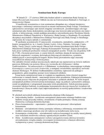 Seminarium Rady Europy W dniach 21 – 27 czerwca 2004 roku brałam udział w seminarium Rady Europy na temat Obywatel jako konsument. Odbyło się ono na Uniwersytecie Hedmark w Norwegii, w miejscowości Hamar. O możliwość uczestnictwa w tym seminarium ubiegałam się z własnej inicjatywy, korzystając z informacji zamieszczonych na stronie internetowej Rady Europy. Formularze zgłoszeniowe zawierające opis moich osiągnięć zawodowych , przedstawiające cele tego seminarium jako formy doskonalenia zawodowego oraz korzyści jakie przyniesie ono mnie i szkole, w której pracuję, zostały poddane procedurze zatwierdzenia przez Dyrektora Szkoły, Ministerstwo Edukacji Narodowej w Warszawie i Radę Europy w Strasburgu. Po uzyskaniu akceptacji otrzymałam z Ministerstwa Edukacji Norwegii oraz Rady Europy w Strasburgu zaproszenie do wzięcia udziału w seminarium. W spotkaniu uczestniczyło 25 nauczycieli, wizytatorów, metodyków, edukatorów z 19 krajów europejskich m. in. z Austrii, Estonii, Łotwy, Litwy, Niemiec, Norwegii, Cypru, Malty, Turcji, Grecji i wielu innych. Obecni byli również przedstawiciele Rady Europy , Ministerstwa Edukacji Norwegii, Federacji Konsumentów Norwegii. Zajęcia prowadzone były przez wybitnych profesorów różnych europejskich uczelni. Trwały one od godziny 8.00 do 17.00, z licznymi przerwami, w czasie których, mieliśmy okazję do nawiązywania bliższych znajomości, wymiany doświadczeń dotyczących szkolnictwa, systemów edukacyjnych w poszczególnych krajach. Różne formy prowadzenia zajęć zmuszały wszystkich do intensywnej i twórczej pracy. Nie zabrakło również atrakcji turystycznych, takich jak rejs najstarszym na świecie statkiem parowym Skibladner po jeziorze Mjosa czy wycieczka do Lillehammer i doliny Gudbrandsdalen. Na uniwersytecie w Lillehammer wysłuchaliśmy interesującego wykładu Konsumpcja a zanieczyszczenie środowiska, a następnie zwiedziliśmy największy norweski skansen Maihaugen. W dolinie Gudbrandsdalen zostaliśmy zaproszeni do jednego z gospodarstw, gdzie mogliśmy poznać życie tutejszych rolników. Temat kursu zainteresował mnie ze względu na zagadnienia, które również mogą być realizowane w ramach chemii – nauczanego przeze mnie przedmiotu. Edukacja konsumencka nie została jeszcze włączona do programu nauczania w polskich szkołach. W wielu krajach europejskich problem zrównoważonej konsumpcji, stając się jednym z priorytetów edukacji, został uwzględniony w programach nauczania wielu przedmiotów. Szkoła powinna pomóc zrozumieć młodym ludziom, że podejmując konsumenckie decyzje muszą być świadomi ich konsekwencji i biorą na siebie część odpowiedzialności za rozwój społeczeństwa i środowiska naturalnego. W szkołach norweskich edukacja konsumencka obejmuje kilka kategorii: • Indywidualny budżet – kształcenie umiejętności planowania własnego budżetu oraz budżetu swojej przyszłej rodziny; zrozumienie związku pomiędzy własną sytuacją finansową a sytuacją ekonomiczną kraju. • Prawo konsumenckie – zapoznanie z podstawowymi prawami i obowiązkami konsumenta. • Reklama – uświadomienie różnicy pomiędzy reklamą a informacją; zrozumienie roli środków masowego przekazu oraz ich wpływu na kształtowanie stylu życia. • Konsumpcja a środowisko – uświadomienie wpływu konsumpcji na zasoby naszej planety oraz wskazanie możliwości ochrony ograniczonych zasobów Ziemi. • Dieta – kształtowanie umiejętności wyboru i przygotowywania zdrowej żywności; uświadomienie związku między zwyczajami żywieniowymi a własnym zdrowiem, wydajnością w pracy i sytuacją ekonomiczną kraju. • Bezpieczeństwo – zapoznanie z instrukcją obsługi urządzeń gospodarstwa domowego, zasadami udzielania pierwszej pomocy i przechowywaniem środków czystości. Edukacja konsumencka nie może opierać się wyłącznie na teorii, lecz prezentując konkretne przykłady, powinna pomóc młodym ludziom określić ich własną postawę oraz nauczyć formułować własne poglądy. Należy więc stworzyć młodym ludziom warunki do pogłębienia wiedzy z zakresu zrównoważonej konsumpcji. Im więcej osób zaangażuje się w wymianę poglądów, tym więcej pomysłów i postaw zostanie poddanych dyskusji , wypracowane zostaną ciekawe i skuteczne metody wdrażania tego ważnego dla nas wszystkich zagadnienia. Podczas kilkudniowych warsztatów miałam okazję poznać sposoby realizacji tego zagadnienia w wielu krajach europejskich. Uczestnicy seminarium bardzo chętnie dzielili się swoimi doświadczeniami. Praca w grupach, ciągle w innych, stwarzała możliwość lepszego poznania wszystkich uczestników, ich poglądów, metod i technik pracy. Udział w szkoleniu międzynarodowym pozwolił mi nawiązać szereg bliskich znajomości z nauczycielami z innych krajów europejskich. Był okazją do poznania nowych aktywnych metod pracy z młodzieżą. Otrzymałam wiele materiałów, konspektów lekcji, informacji o stronach internetowych, które zostaną wykorzystane na zajęciach z różnych przedmiotów. Podsumowując, chciałabym podkreślić ogromną rolę tego typu międzynarodowych spotkań. Gromadzą one nauczycieli z wielu krajów, szkół, z różnym doświadczeniem. Są wspaniałą okazją do konfrontacji osiągnięć, porównania programów nauczania, poznania systemów edukacyjnych oraz sposobów rozwiązywania bieżących (bardzo podobnych) problemów w różnych krajach europejskich. Seminaria Rady Europy są przeznaczone dla wszystkich nauczycieli znających dobrze roboczy język kursu. Informacje na temat seminariów są dostępne w Internecie pod adresem http://culture.coe.fr/teachertrainig. Rada Europy, założona w 1949 roku, jest najstarszą organizacją polityczną na Kontynencie, która: - skupia 45 państw, ( Polska należy od 1991 roku), - jest odrębna od Unii Europejskiej, jednakże wszystkie państwa należące Unii wywodzą się z Rady E