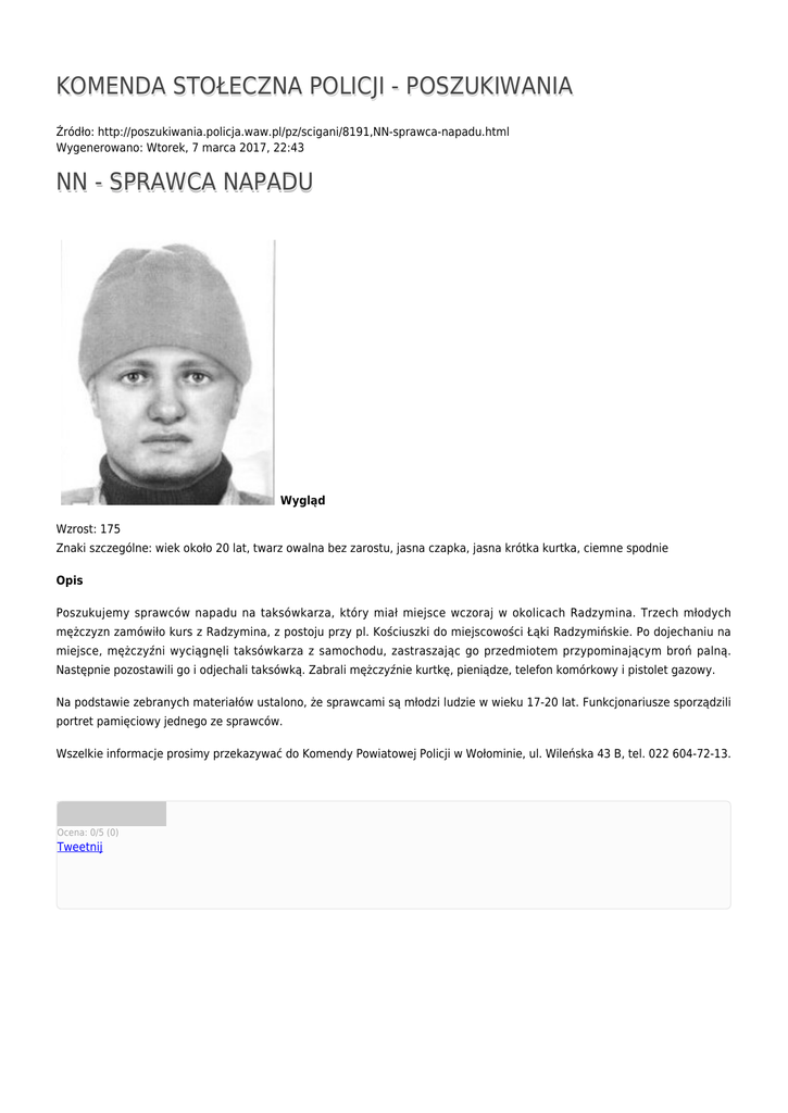 KOMENDA STOŁECZNA POLICJI - POSZUKIWANIA Źródło: http://poszukiwania.policja.waw.pl/pz/scigani/8191,NN-sprawca-napadu.html Wygenerowano: Wtorek, 7 marca 2017, 22:43 NN - SPRAWCA NAPADU Wygląd Wzrost: 175 Znaki szczególne: wiek około 20 lat, twarz owalna bez zarostu, jasna czapka, jasna krótka kurtka, ciemne spodnie Opis Poszukujemy sprawców napadu na taksówkarza, który miał miejsce wczoraj w okolicach Radzymina. Trzech młodych mężczyzn zamówiło kurs z Radzymina, z postoju przy pl. Kościuszki do miejscowości Łąki Radzymińskie. Po dojechaniu na miejsce, mężczyźni wyciągnęli taksówkarza z samochodu, zastraszając go przedmiotem przypominającym broń palną. Następnie pozostawili go i odjechali taksówką. Zabrali mężczyźnie kurtkę, pieniądze, telefon komórkowy i pistolet gazowy. Na podstawie zebranych materiałów ustalono, że sprawcami są młodzi ludzie w wieku 17-20 lat. Funkcjonariusze sporządzili portret pamięciowy jednego ze sprawców. Wszelkie informacje prosimy przekazywać do Komendy Powiatowej Policji w Wołominie, ul. Wileńska 43 B, tel. 022 604-72-13. Ocena: 0/5 (0) Tweetnij