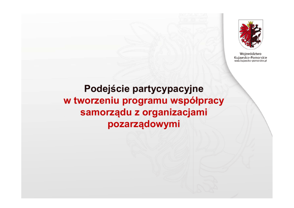 Podejście partycypacyjne w tworzeniu programu współpracy samorządu z organizacjami pozarządowymi PRZESŁANKI WYPRACOWANIA PROGRAMU WSPÓŁPRACY SAMORZĄDU WOJEWÓDZTWA KUJAWSKO-POMORSKIEGO Z ORGANIZACJAMI POZARZĄDOWYMI NA LATA 2011-2015 Inicjatywa podjęcia prac nad Programem 2011-2015 wynikała z następujących przesłanek: braku długofalowej wizji współdziałania samorządu województwa ze środowiskiem pozarządowym braku wspólnie określonych zasad współpracy słabej aktywności organizacji pozarządowych w pracach nad programami jednorocznymi nowelizacji ustawy o działalności pożytku publicznego i o wolontariacie (2010 r.), która przewiduje uchwalanie programów wieloletnich SPOSÓB TWORZENIA PROGRAMU 2011-2015 Koordynatorem prac był Urząd Marszałkowski – Biuro Współpracy z Organizacjami Pozarządowymi, jednak wszystkie etapy prac nad programem realizowane były w partnerstwie z organizacjami pozarządowymi. Zakładaliśmy bowiem, że zapisy programu będą satysfakcjonujące zarówno dla organizacji pozarządowych, jak i samorządu województwa tylko wtedy, jeśli będą przez obie strony wypracowane. ETAPY TWORZENIA PROGRAMU 2011-2015 Cykl spotkań informacyjnych 5 miastach województwa: Toruniu, Włocławku, Bydgoszczy, Inowrocławiu, Grudziądzu – kwiecień/maj 2009 Spotkania miały na celu: - poinformowanie o inicjatywie wypracowania wieloletniego programu współpracy, - dyskusję nad stanem obecnym współpracy samorząd województwa – organizacje pozarządowe, - zachęcenie do bezpośredniego zaangażowania się w tworzenie programu poprzez udział w pracach zespołu roboczego. W każdym ze spotkań uczestniczyło ok. 50 przedstawicieli stowarzyszeń i fundacji. ETAPY TWORZENIA PROGRAMU 2011-2015 - Analiza obowiązujących dokumentów strategicznych województwa - Badanie potencjału trzeciego sektora w województwie, ze szczególnym uwzględnieniem współpracy NGO z samorządem. Badanie zostało przeprowadzone za pomocą ankiety, którą wypełniło 130 organizacji pozarządowych. Wyniki badania dotyczą lat 2007 – 2009 i stanowią materiał wyjściowy do prac nad Programem 2011-2015. ETAPY TWORZENIA PROGRAMU 2011-2015 Utworzenie zespołu roboczego ds. Wieloletniego programu współpracy samorządu województwa kujawskopomorskiego z organizacjami pozarządowymi na lata 2011-2015. W skład zespołu weszło 28 osób, w tym: 16 przedstawicieli organizacji pozarządowych 2 radnych 10 pracowników Urzędu Marszałkowskiego EFEKTY PRACY ZESPOŁU ROBOCZEGO Spotkania warsztatowe (2 x po dwa dni) Zespołu, podczas których wypracowany został materiał roboczy, który wymagał zredagowania i dalszych prac - czerwiec/wrzesień 2009 Prezentacja założeń programu m.in. na Wojewódzkim Forum Organizacji Pozarządowych w 2010 r. Program był też przedmiotem pracy jednej z grup roboczych podczas Forum Spotkania kilkugodzinne, uzgodnienia za pomocą poczty elektronicznej w ramach Zespołu opracowującego program, prezentacje założeń programu na konferencjach- 2010-2011r. KOŃCOWY ETAP PRAC NAD PROGRAMEM 2011-2015 Zatwierdzenie projektu przez Zarząd Województwa, Poddanie projektu konsultacjom poprzez zamieszczenie go na stronie internetowej Urzędu Marszałkowskiego oraz przesłanie drogą elektroniczną do organizacji znajdujących się w bazie (ok. 800 NGO) Sporządzenie i upublicznienie raportu z konsultacji projektu programu Zatwierdzenie przez Zarząd ostatecznego projektu programu z uwzględnieniem uwag z konsultacji Uchwalenie programu przez Sejmik Województwa Kujawsko-Pomorskiego (listopad 2011) WYCINEK PROJEKTU PROGRAMU 2011-2015 WIZJA 2015 Współpraca samorządu województwa kujawskopomorskiego organizacjami pozarządowymi jest oparta o wspólnie wypracowane i obustronnie przestrzegane zasady. Dzięki pełnemu dostępowi do informacji oraz czytelnym i prostym procedurom wzmacniane jest wzajemne zaufanie między Partnerami. Istnieje wieloletni program współpracy, który tworzy długofalową perspektywę, dającą podbudowę dla stabilności finansowej, merytorycznej, ciągłości działań i trwałości efektów. Program współpracy jest spójny z zapisami strategii województwa, dzięki czemu działania organizacji pozarządowych wpisują się w strategiczne obszary rozwoju Regionu. WYCINEK PROJEKTU PROGRAMU 2011-2015 Coraz większa liczba realizowanych zadań publicznych oraz zwiększone środki finansowe na te zadania w praktyce realizują zasadę pomocniczości. Organizacje włączane są w tworzenie prawa miejscowego. Dzięki systematyczności współpracy, opartej o pełną diagnozę działań sektora pozarządowego, prowadzona jest bieżąca ocena, pozwalająca na szybkie ewentualne korekty mechanizmów współpracy. Jednocześnie wszyscy Partnerzy mogą na bieżąco dostrzegać korzyści ze wspólnej pracy na rzecz mieszkańców Regionu. Współpraca opiera się na zasadach: partnerstwa, jawności, uczciwości, efektywności, pomocniczości i wzajemnego zaufania. Plusy i minusy metody partycypacyjnej + możliwość przedyskutowania różnych doświadczeń i punktów widzenia (często inne samorząd, inne NGO) wzajemne poznanie się i zrozumienie swoich racji (samorząd, NGO) odejście od praktyki „kopiuj, wklej” (samorząd) poczucie wpływu na tworzenie polityki samorząd – III sektor (NGO) przetestowanie „dobrej praktyki” (samorząd) Plusy i minusy metody partycypacyjnej Czasochłonność Koszty Możliwość zaplanowania działań nierealistycznych Dziękuję za uwagę Ewa Głodowska-Morawska Pełnomocnik Zarządu Województwa Kujawsko-Pomorskiego ds. Współpracy z Organizacjami Pozarządowymi. [email protected] www.ngo.kujawsko-pomorskie.pl Nowe Marzy, dn. 28 lipca 2014 r.
